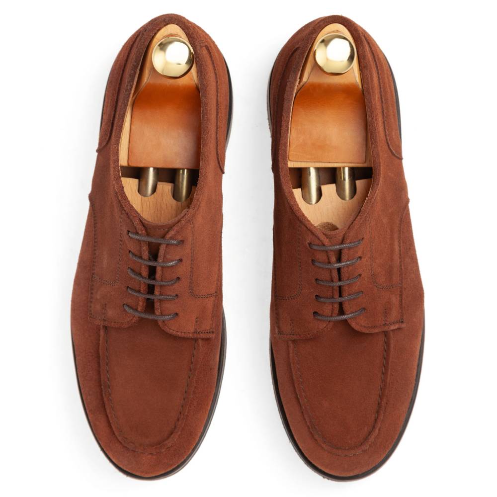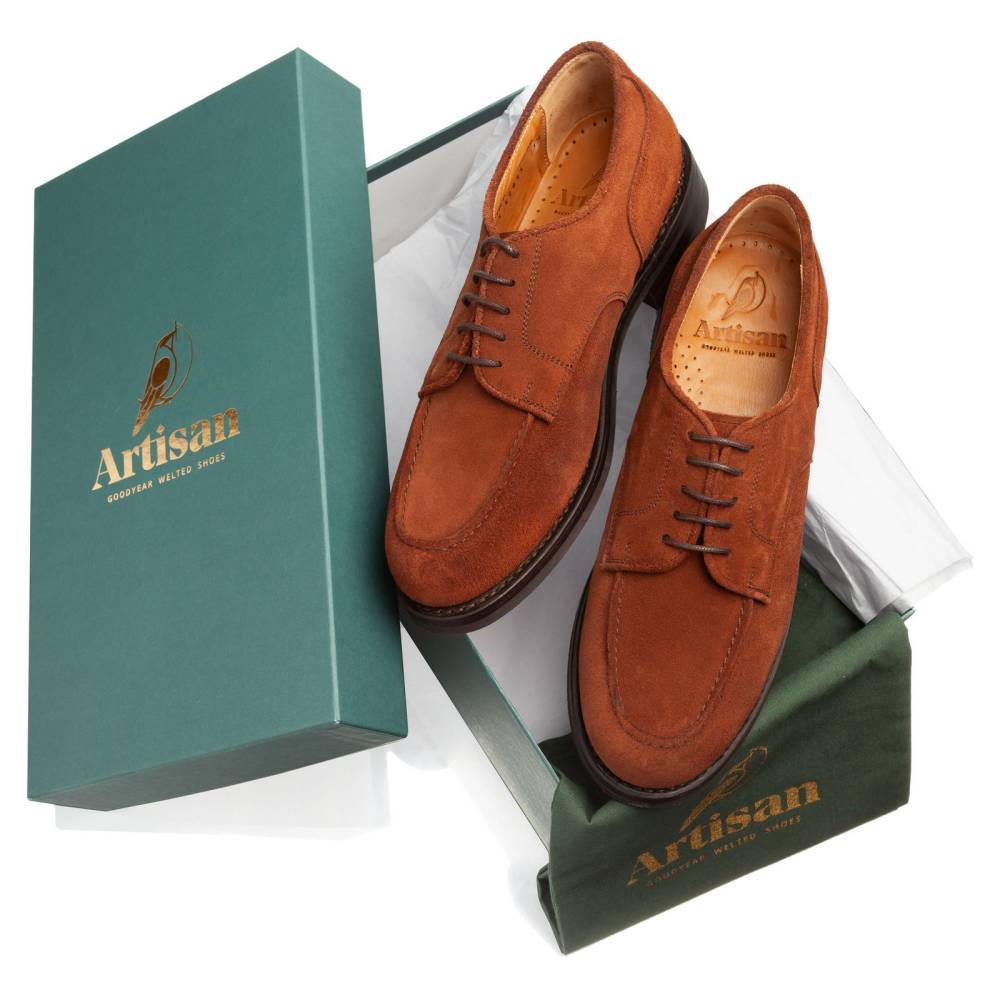 Повседневные дерби Artisan Richelieu произведены в Португалии в конструкции Goodyear Welted. Особенностью дизайна является U-образный шов на союзке, подчеркивающий округлую форму мыска. Верх выполнен из плотной замши коричневого цвета. Подкладка из кожи растительного дубления. Модель оснащена прочной резиновой подошвой Dainite.