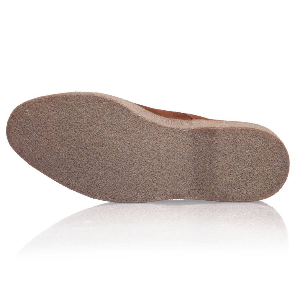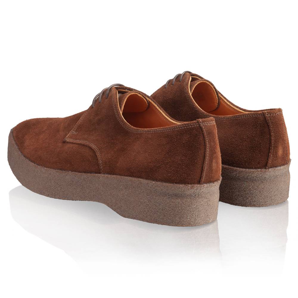 Модель выполнена в конструкции Cemented. Все части верха заворачиваются под стельку и приклеиваются к креповой подошве. Затем, на специальном станке, тонкая горячая креповая лента спаивается с замшей и подошвой по всей окружности ботинка.