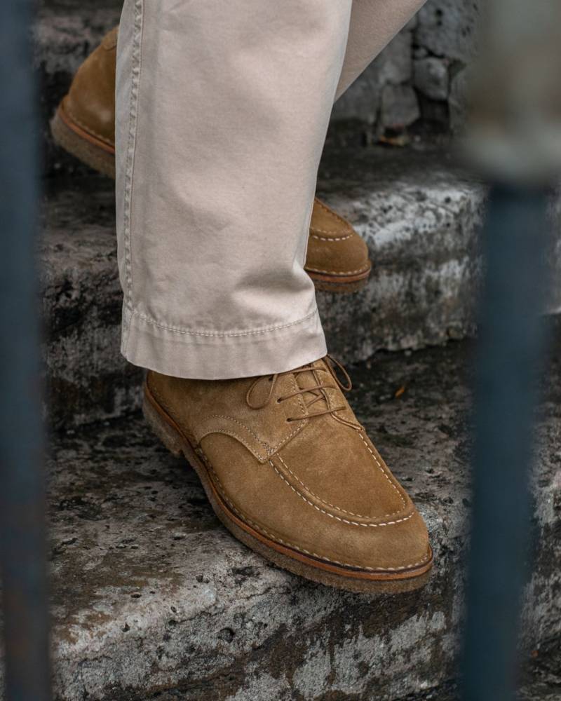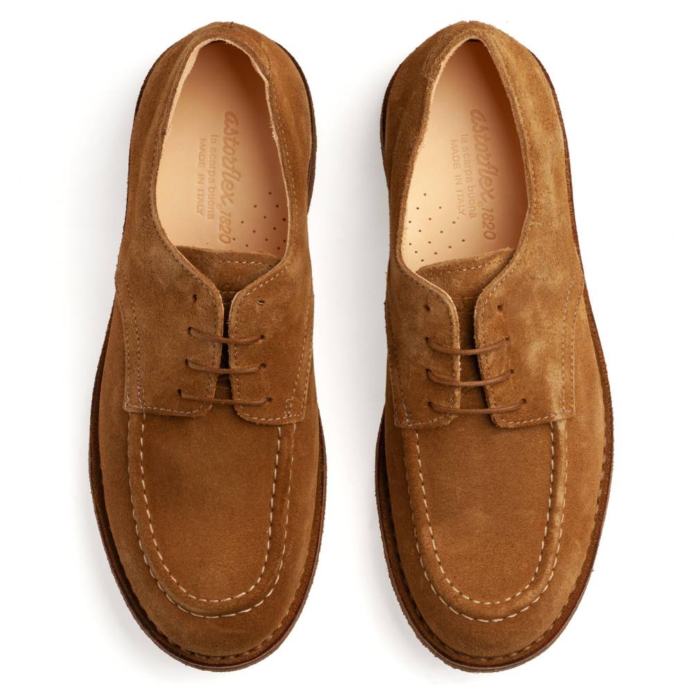 Удобные повседневные дерби итальянского бренда Astorflex с узнаваемым мокасинным швом в передней части. Верх выполнен из плотной замши светло-коричневого цвета. Модель имеет тонкую подкладку из кожи растительного дубления. Внутри - мягкая съёмная стелька из кожи с пористым слоем. Характерной особенностью пары является гибкая и упругая подошва из натурального каучука. Обувь сшита в прочной влагостойкой конструкции stitch-down (доппельный метод крепления).