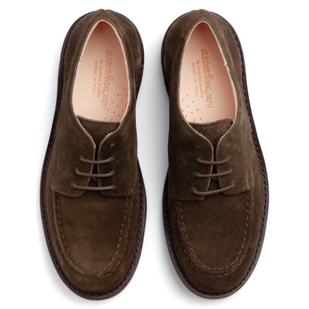 Удобные повседневные дерби итальянского бренда Astorflex с узнаваемым мокасинным швом в передней части. Верх выполнен из плотной замши тёмно-зелёного цвета. Модель имеет тонкую подкладку из кожи растительного дубления. Модель имеет съёмную стельку из кожи и пены с эффектом памяти (memory foam). Подошва из резины. Обувь сшита в прочной влагостойкой конструкции stitch-down (доппельный метод крепления).
