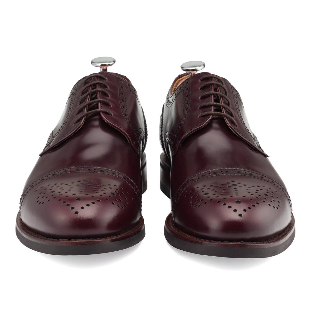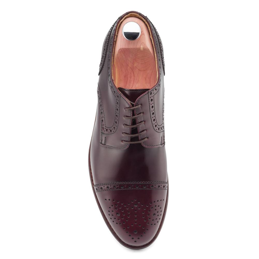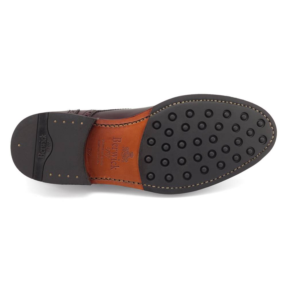 Классические полуброги с открытой шнуровкой Berwick насыщенного бордового оттенка. Туфли представляют собой традиционную австрийскую модель «Alt Wien» (Старая Вена), с характерным для неё медальоном на мысе и перфорацией на берцах. Верх выполнен из плотной полированной телячьей кожи Rois с изысканным блеском, благодаря которому она выглядит подобно коже кордован (cordovan leather). Финишная обработка материала добавляет устойчивость к влаге и грязи, что делает обувь из него практичной в осенний период. При создании подошвы использовались прочная резина и кожа. Конструкция Goodyear Welted.