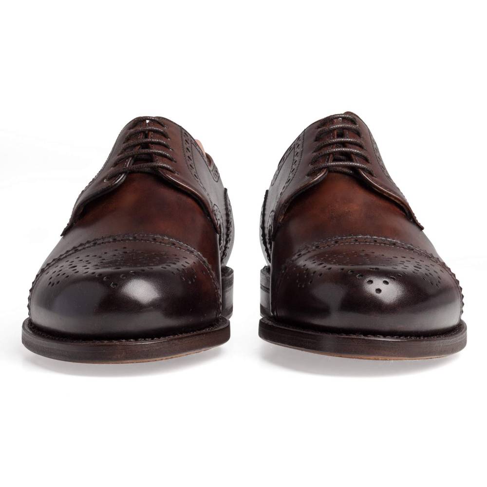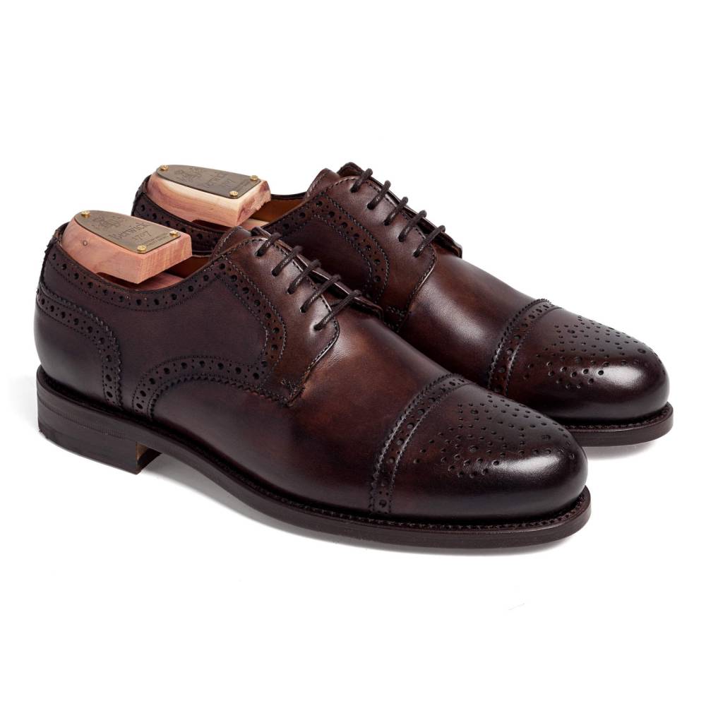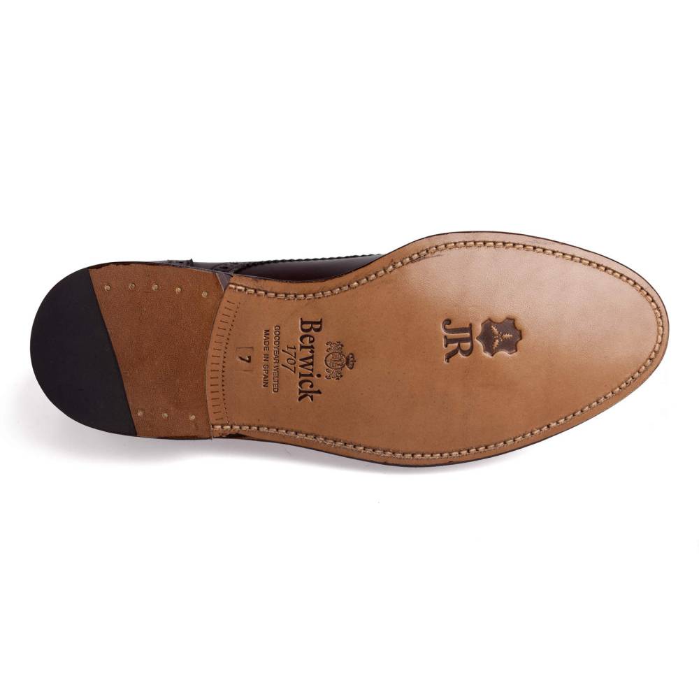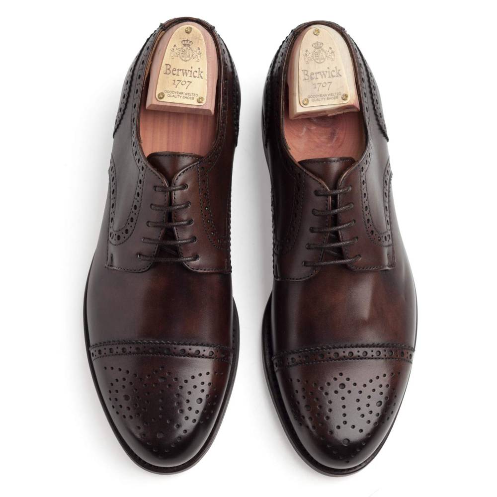 Классические полуброги с открытой шнуровкой Berwick тёмно-коричневого цвета. Туфли представляют собой традиционную австрийскую модель «Alt Wien» (Старая Вена), с характерным для неё медальоном на мысе и перфорацией на берцах. Верх выполнен из плотной телячьей кожи. Особенностью модели является ручная окраска, которая создает неповторимый внешний вид кожи с неравномерной игрой цвета и градиентным затемнением на мысе. На данную пару установлена высококачественная кожаная подошва от знаменитой немецкой кожевенной мастерской Joh. Rendenbach. Конструкция Goodyear Welted.