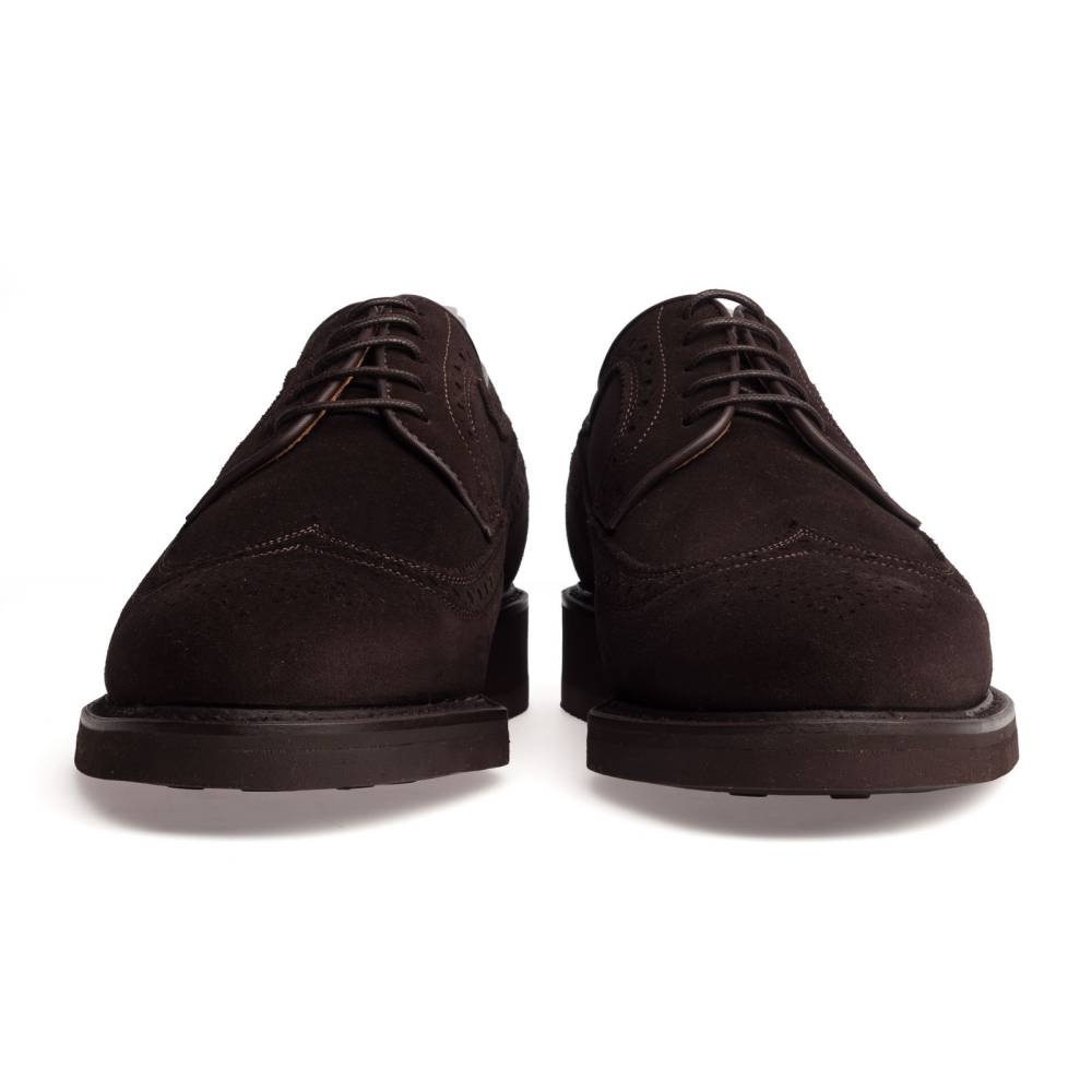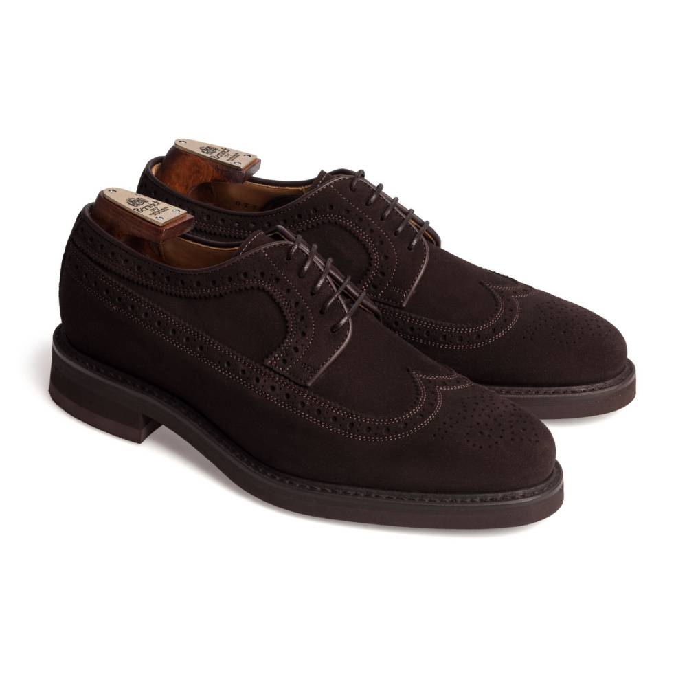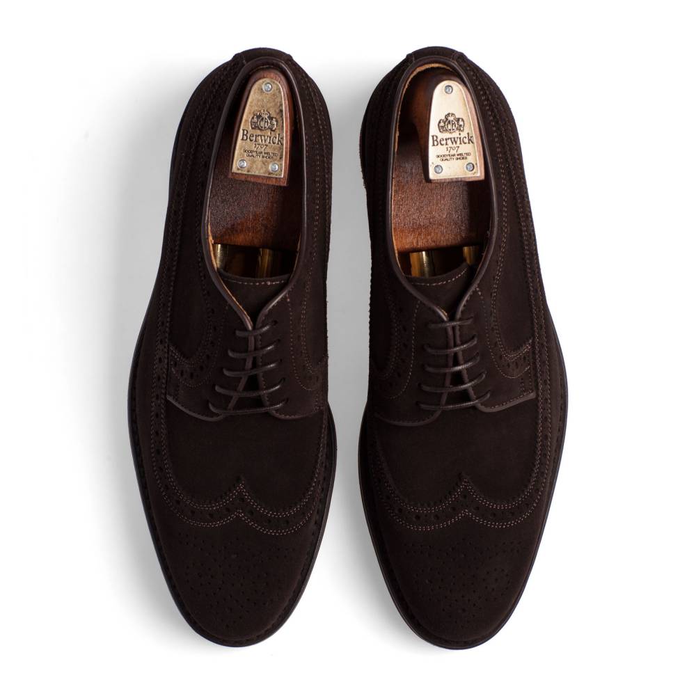 Замшевые броги лонгвинги (Longwing Brogues) тёмно-коричневого цвета от испанского бренда Berwick на прочной и лёгкой резиновой подошве Vibram. Верх выполнен из английской замши с мелким ворсом. Модель имеет рант с небольшой окантовкой, который добавляет подошве дополнительную защиту от влаги, не утяжеляя при этом вид обуви. Рант пришит к верху по всей окружности (360 градусов). Конструкция Goodyear Welted.