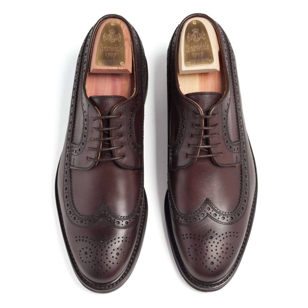 Массивные броги лонгвинги (Longwing Brogues) тёмно-коричневого цвета испанского бренда Berwick с открытой шнуровкой. Модель выполнена из плотной жированой телячьей кожи растительного дубления (Cromex Calf Leather). На нижнюю часть подошвы установлена прочная резина английской фирмы Dainite. Модель имеет усиленный рант с окантовкой, который добавляет подошве влагоустойчивость. Конструкция Goodyear Welted.