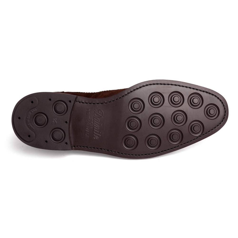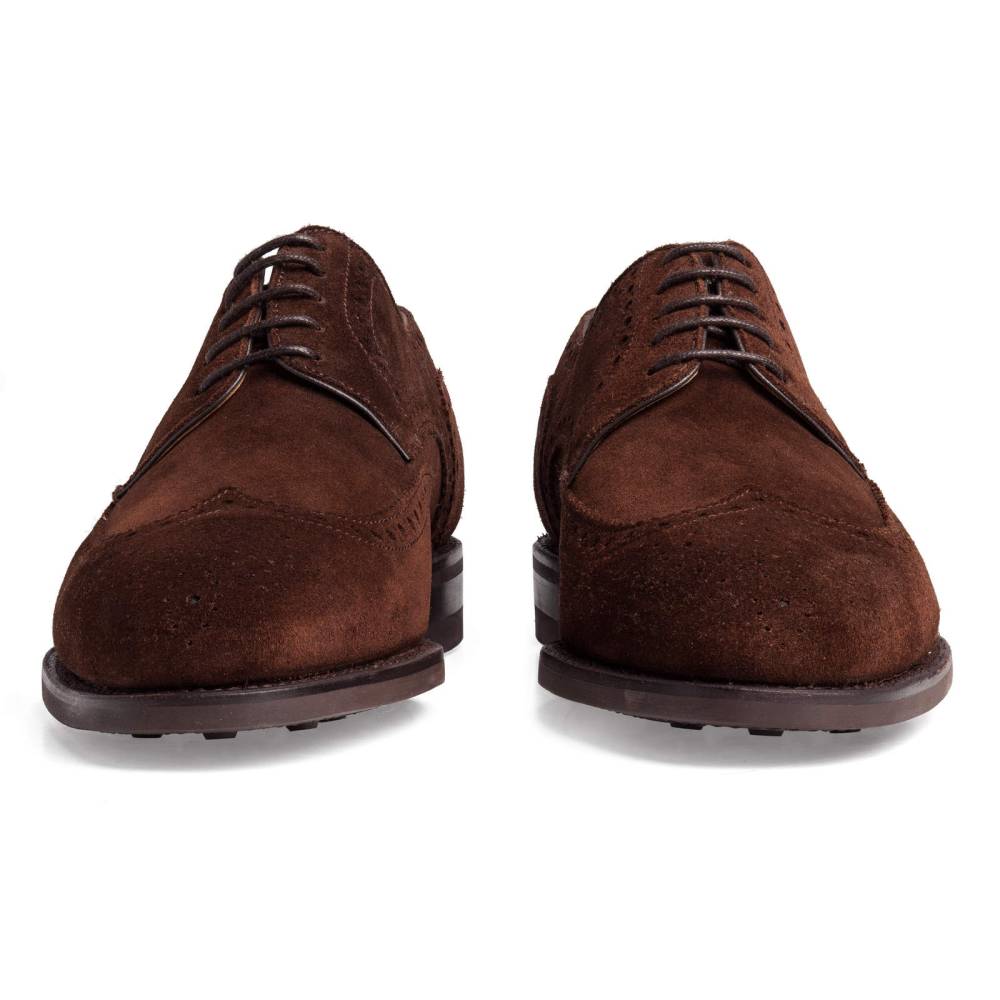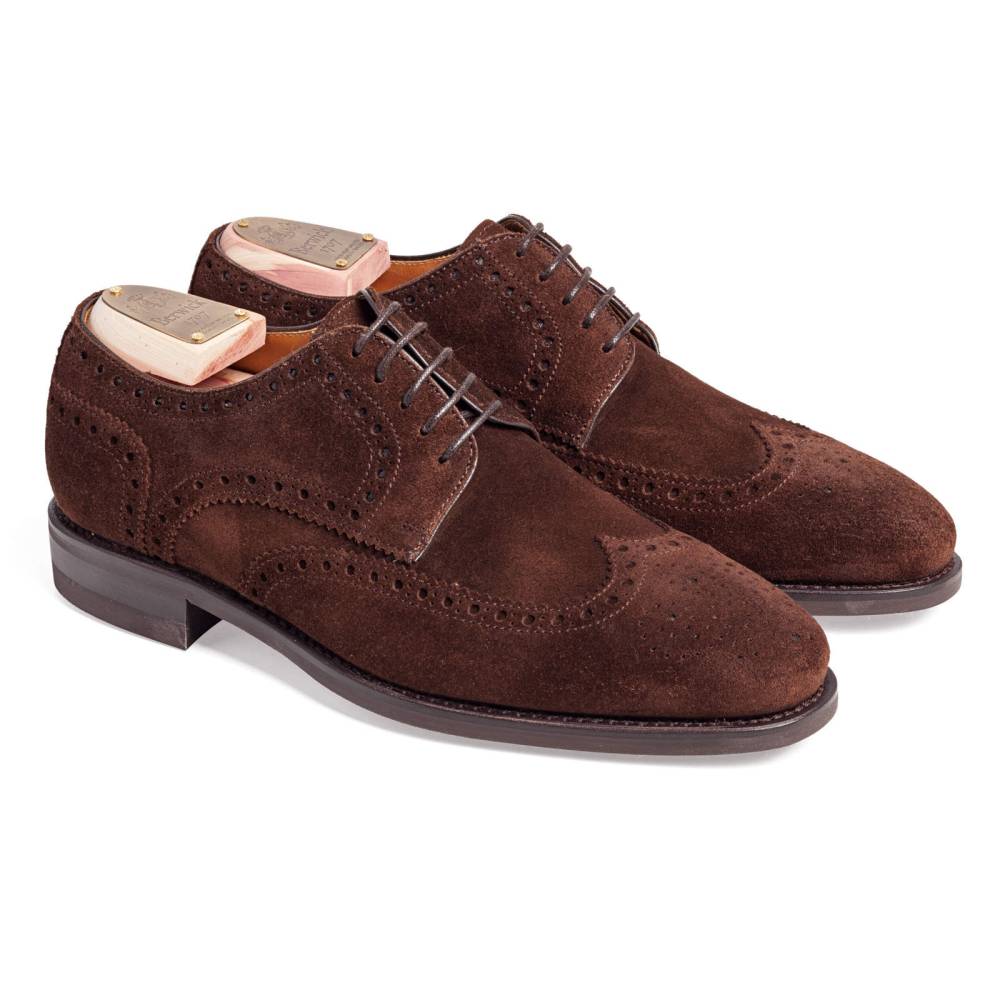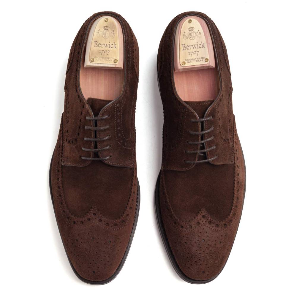 Элегантные мужские дерби Berwick выполнены из английской бархатистой замши тёмно-коричневого цвета. Верх украшен традиционным узором и медальоном в виде цветка на мысе. Внутренняя отделка из гладкой телячьей кожи бежевого оттенка. Модель имеет тонкую подошву из резины от знаменитой фабрики Dainite. Конструкция Goodyear Welted.