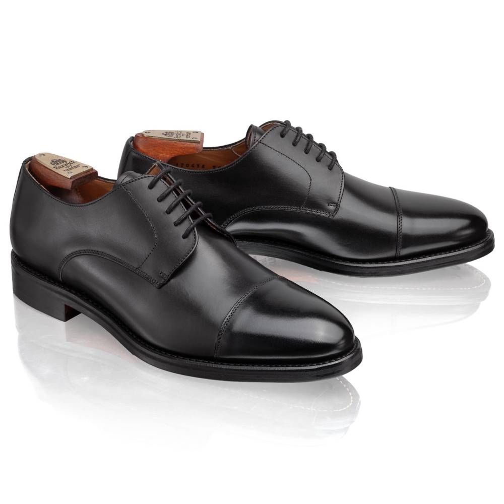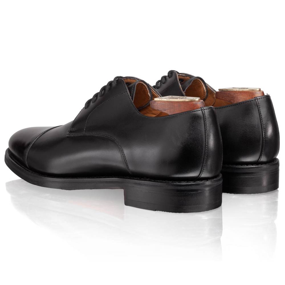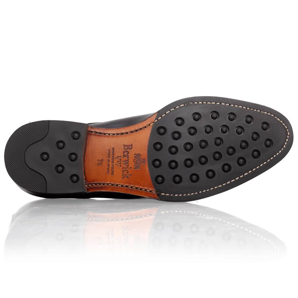 Лаконичные черные туфли-дерби с открытой шнуровкой и отрезным мыском (Cap Toe) от испанского бренда Berwick. Верх выполнен из высококачественной телячьей кожи хромового дубления Box Calf чёрного цвета. Подкладка изготовлена из телячьей кожи растительного дубления. На нижнюю часть подошвы установлена износостойкая резина с кожаной вставкой у каблука. Конструкция Goodyear Welted. Модель сшита на 156 колодке, которая рассчитана на стопу со стандартной полнотой и невысоким подъём.