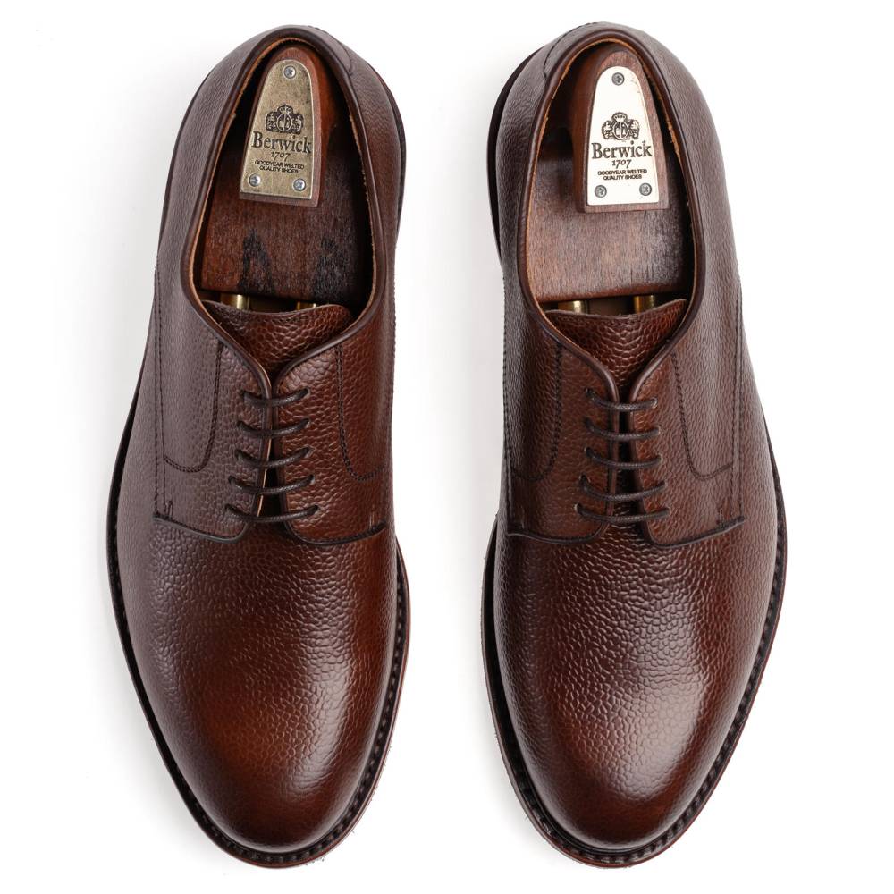 Лаконичные мужские туфли дерби Berwick тёмно-коричневого цвета. Модель выполнена из плотной телячьей кожи с зернистой текстурой. На нижнюю часть подошвы установлена прочная резина английской фирмы Dainite. Модель имеет усиленный рант с окантовкой, который добавляет подошве влагоустойчивость. Конструкция Goodyear Welted.