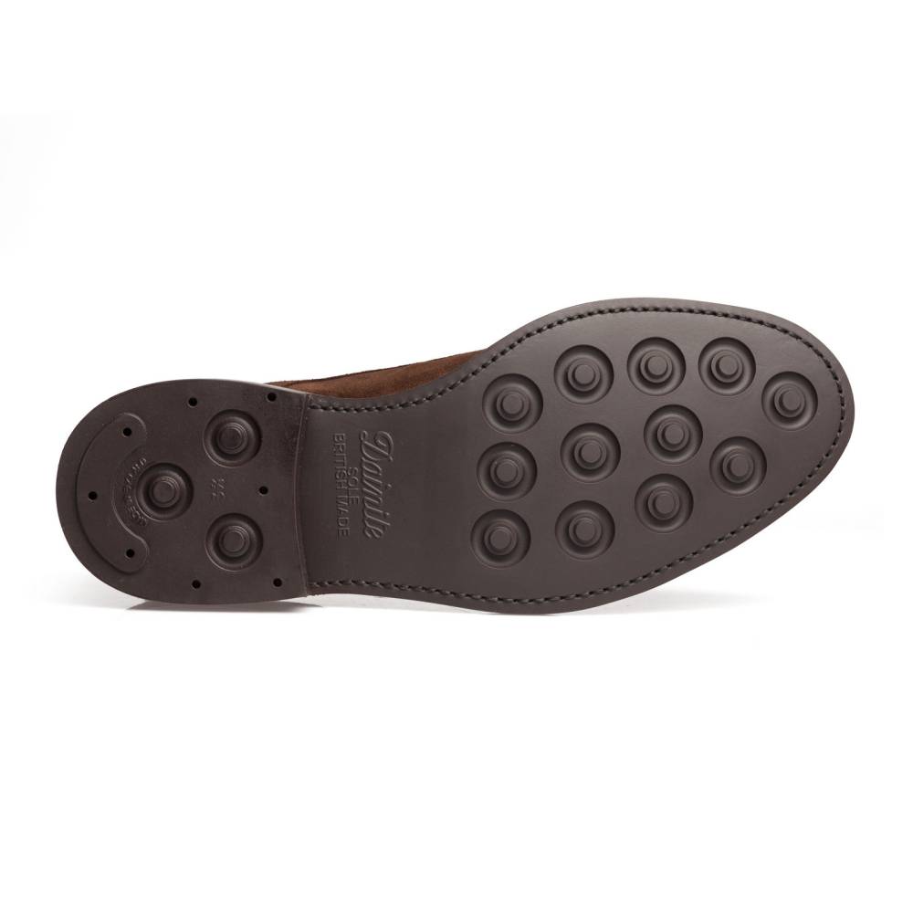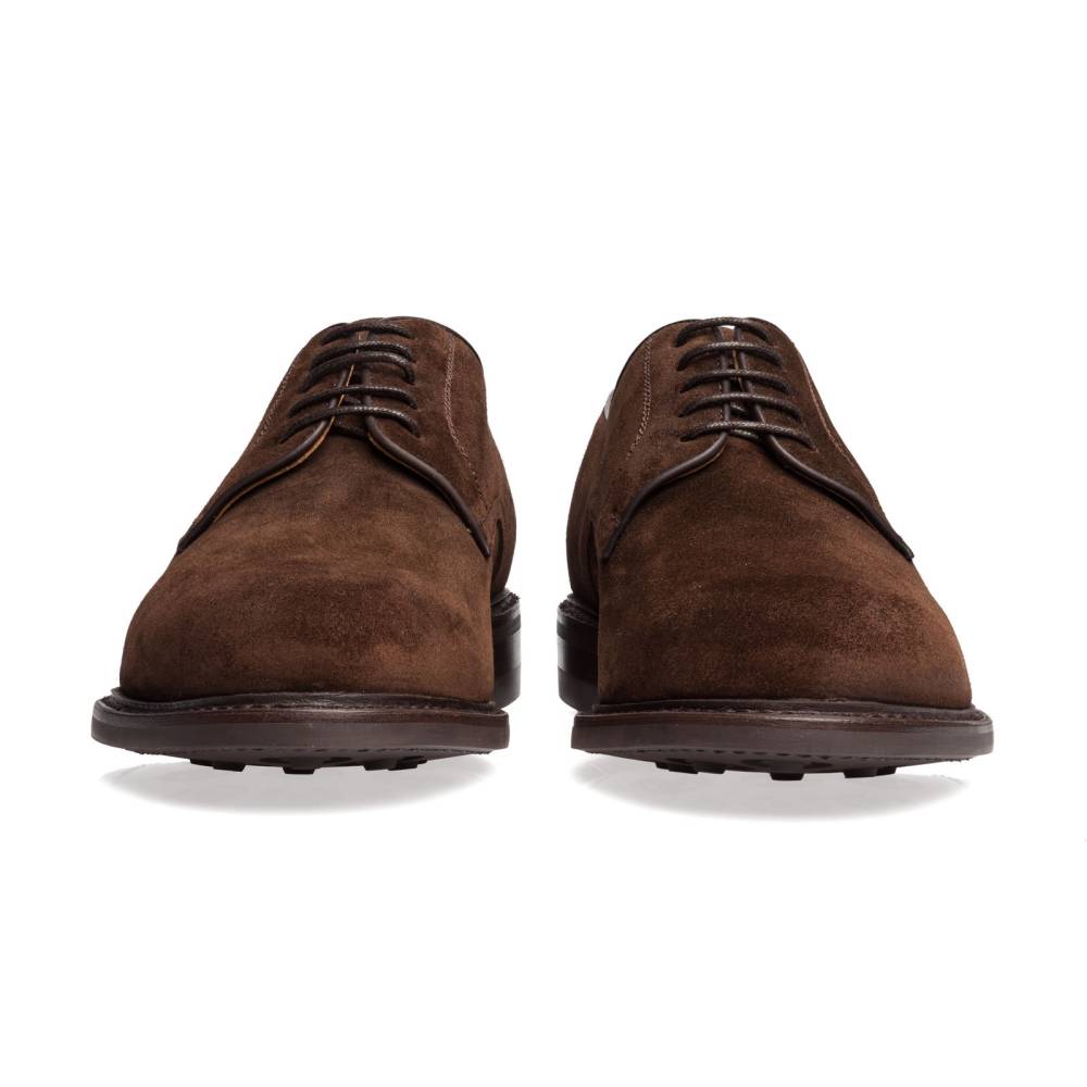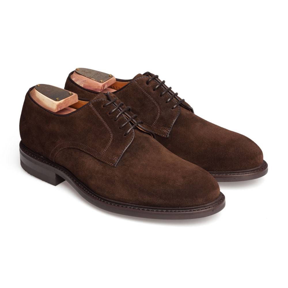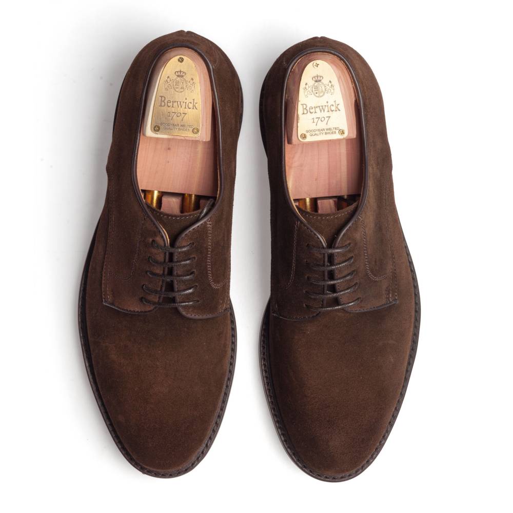 Лаконичные дерби тёмно-коричневого цвета от испанского бренда Berwick на прочной резиновой подошве Dainite. Верх выполнен из мягкой промасленной замши, устойчивой к дождю и снегу. Модель имеет усиленный рант с окантовкой (storm welt), который добавляет подошве дополнительную защиту от влаги. Рант пришит к верху по всей окружности (360 градусов). Конструкция Goodyear Welted.