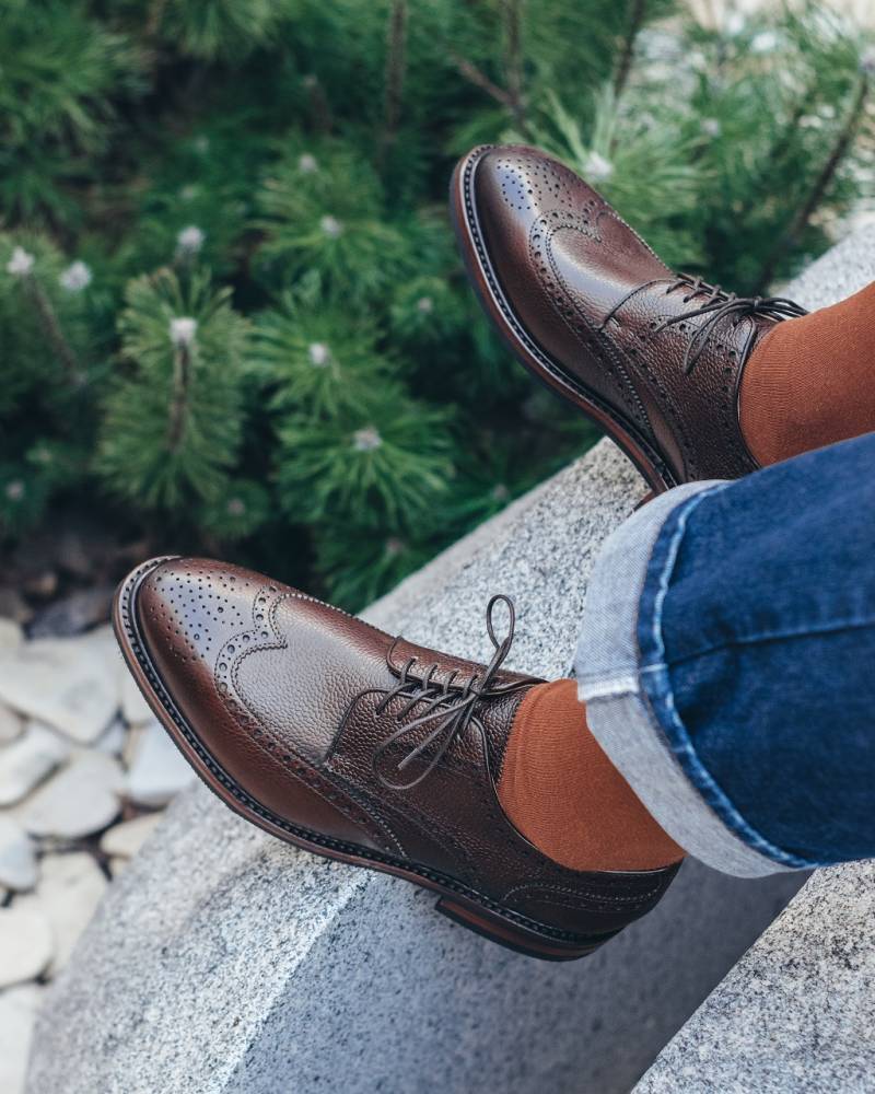 Традиционные массивные броги Berwick с открытой шнуровкой. Выполнены из плотной телячьей кожи тёмно-коричневого цвета с зернистой фактурой и украшены фестонами и характерным перфорированным узором. На нижнюю часть подошвы установлена прочная резина английской фирмы Dainite. Модель имеет усиленный рант с окантовкой, который добавляет подошве влагоустойчивость. Конструкция Goodyear Welted.