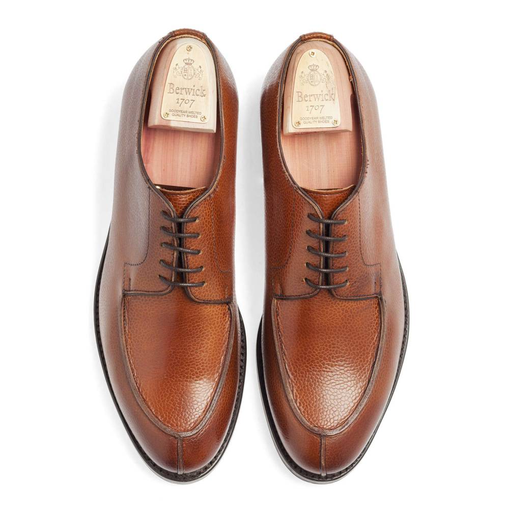 Дерби Berwick в норвежском стиле выполнены из плотной зернистой кожи коньячного цвета. При создании подошвы использовались резина английской мануфактуры Dainite и кожа. Конструкция Goodyear Welted.