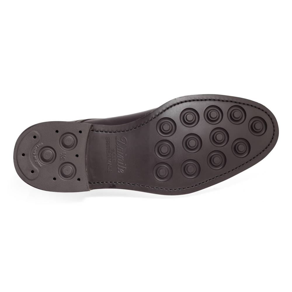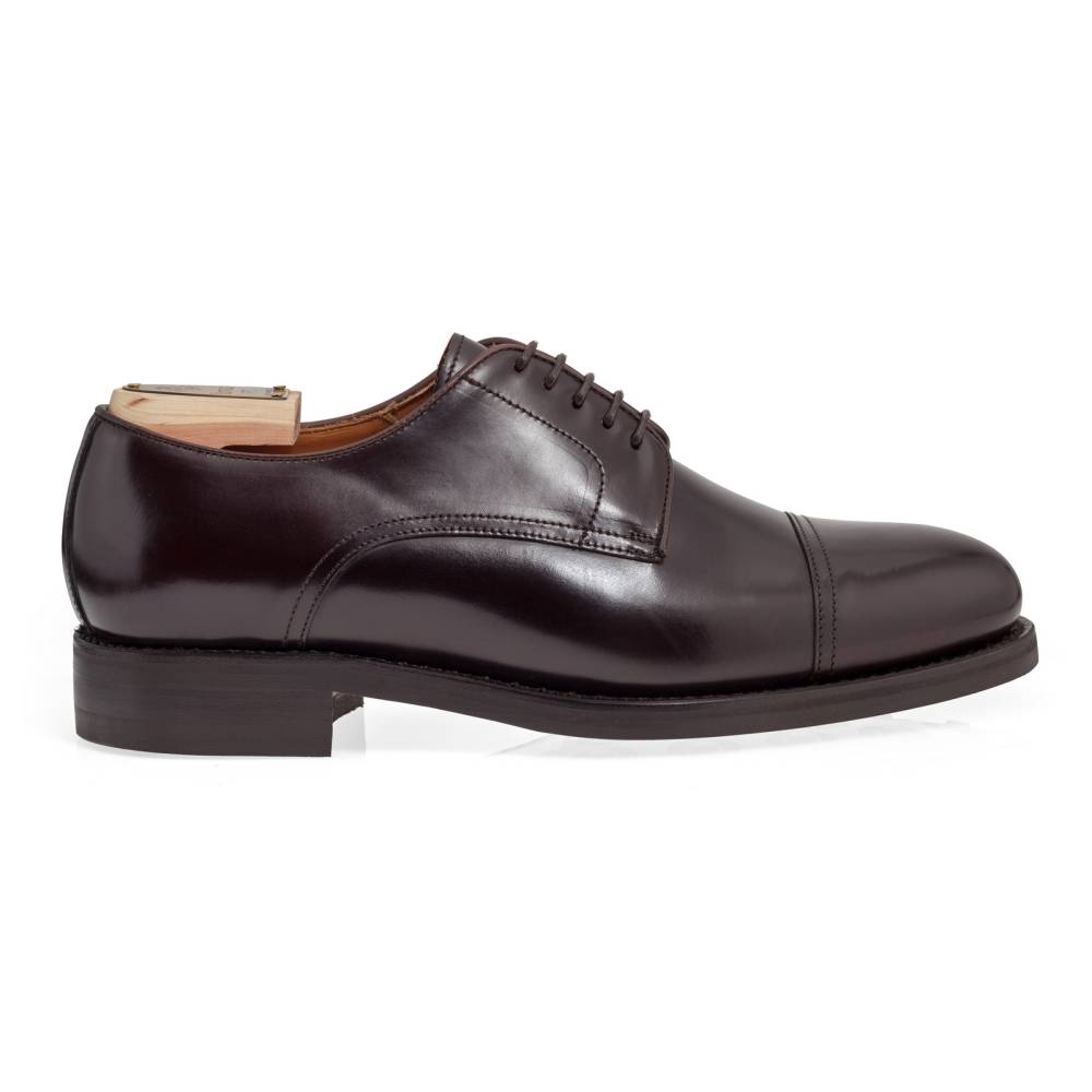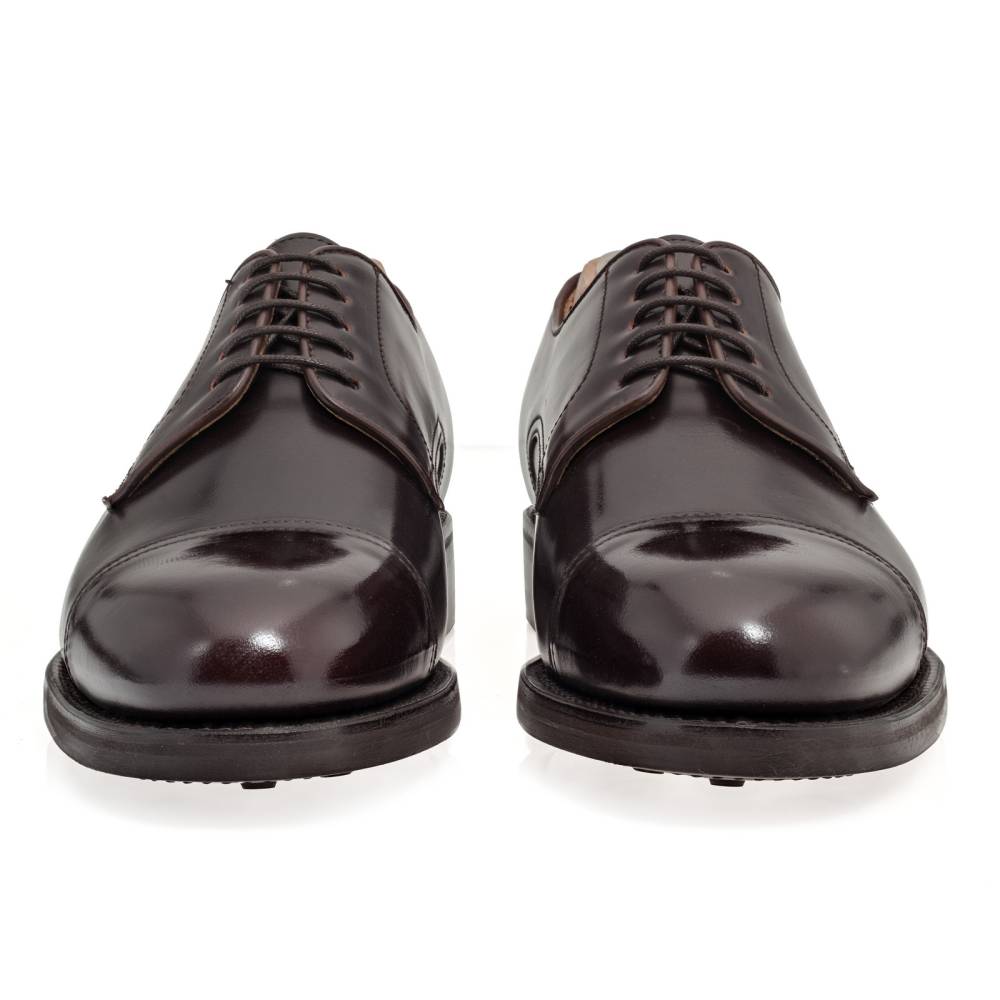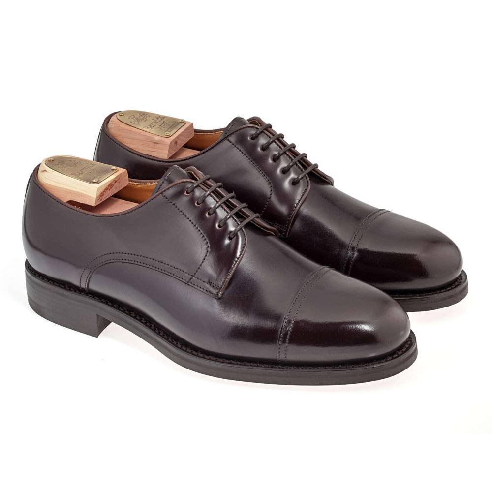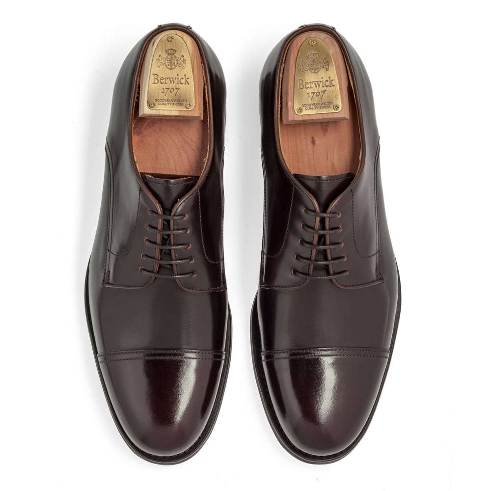 Лаконичные туфли с открытой шнуровкой из коллекции испанского бренда Berwick тёмно-коричневого цвета. Верх выполнен из плотной полированной телячьей кожи Rois с изысканным блеском, благодаря которому она выглядит подобно конской коже (cordovan leather). Финишная обработка материала добавляет устойчивость к влаге и грязи, что делает обувь из него практичной в осенний период. На нижнюю часть подошвы установлена фирменная резина британской фирмы Dainite. Конструкция Goodyear Welted.