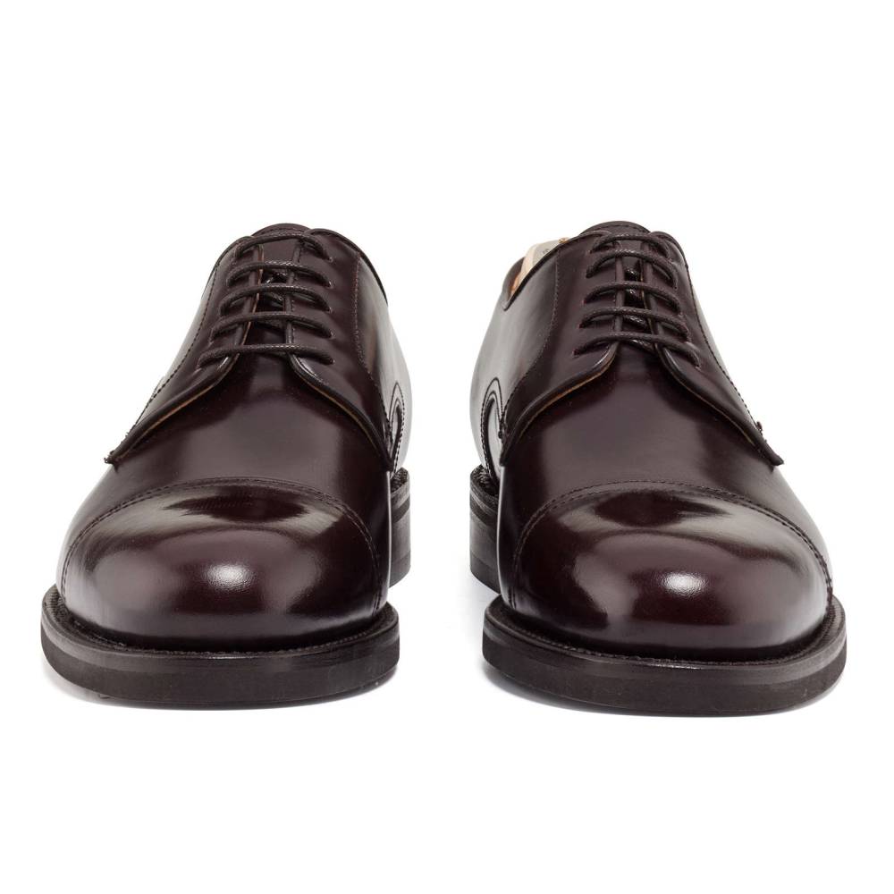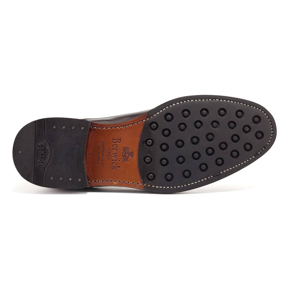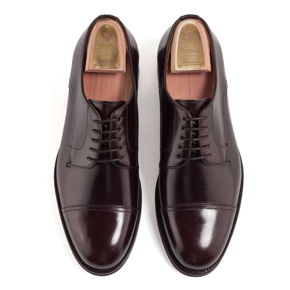 Лаконичные туфли с открытой шнуровкой из коллекции испанского бренда Berwick тёмно-коричневого цвета. Верх выполнен из плотной полированной телячьей кожи Rois с изысканным блеском, благодаря которому она выглядит подобно конской коже (cordovan leather). Финишная обработка материала добавляет устойчивость к влаге и грязи, что делает обувь из него практичной в осенний период. Модель имеет массивную двухслойную подошву из кожи и резины. Конструкция Goodyear Welted.