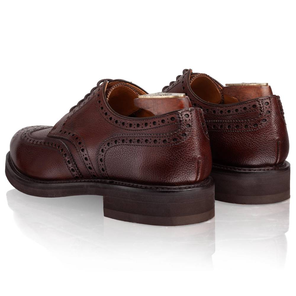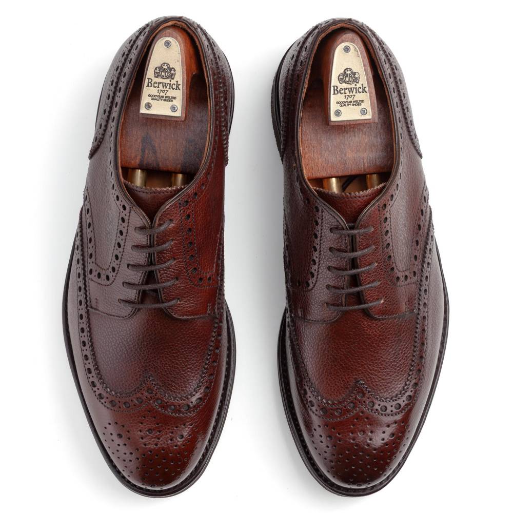 Традиционные дерби-броги с открытой шнуровкой и крыловидным мыском (wingtip) от испанского бренда Berwick. Выполнены из плотной телячьей кожи с зернистой текстурой коричневого цвета, декорированной фестонами и характерным перфорированным узором (брогированием). Подкладка изготовлена из телячьей кожи растительного дубления. На нижнюю часть установлена износостойкая облегчённая резина итальянской фирмы Vibram. Модель имеет усиленный штормовой рант с окантовкой, который добавляет влагоустойчивость. Конструкция Goodyear Welted.
