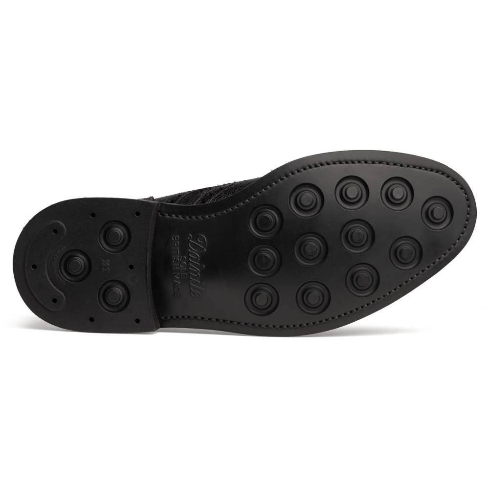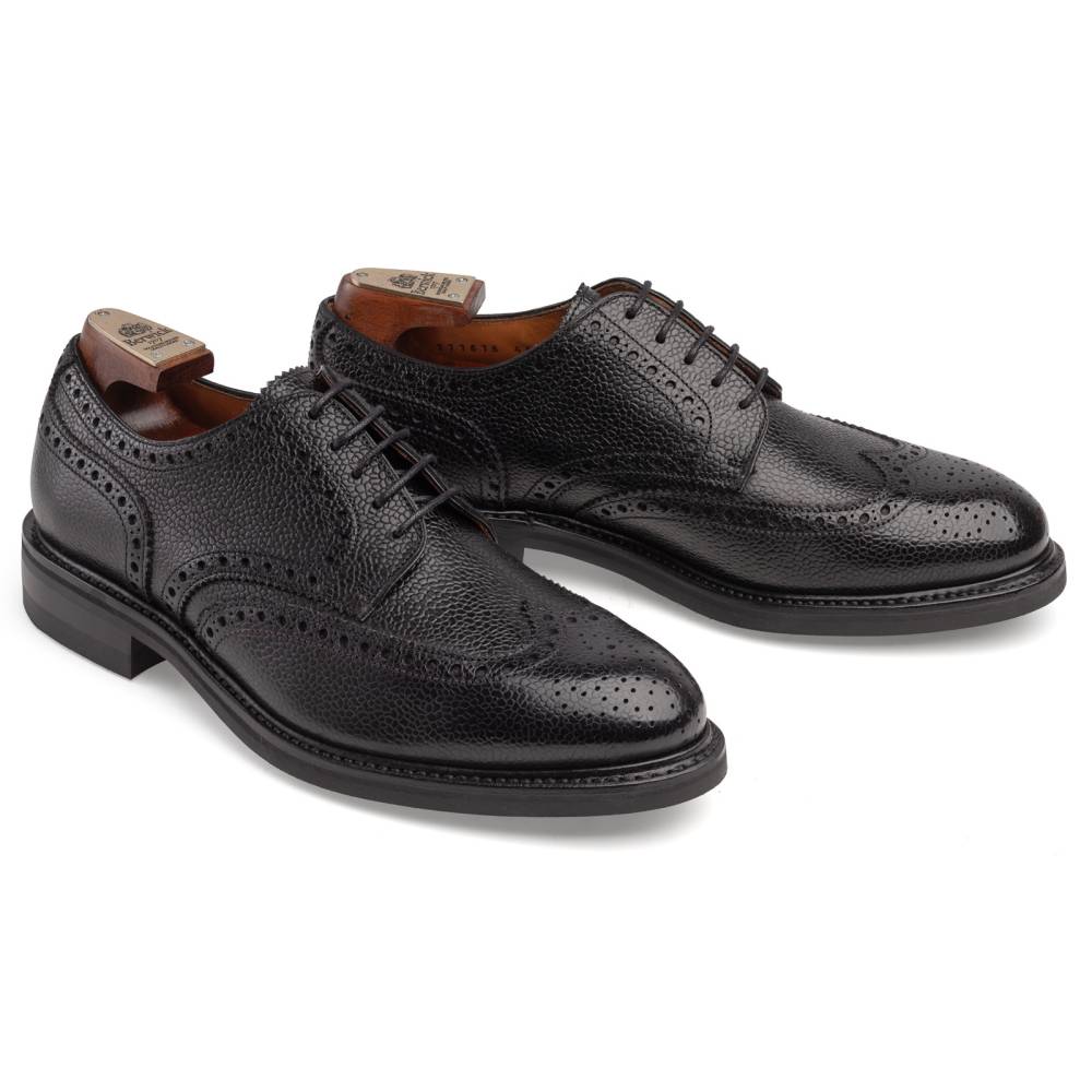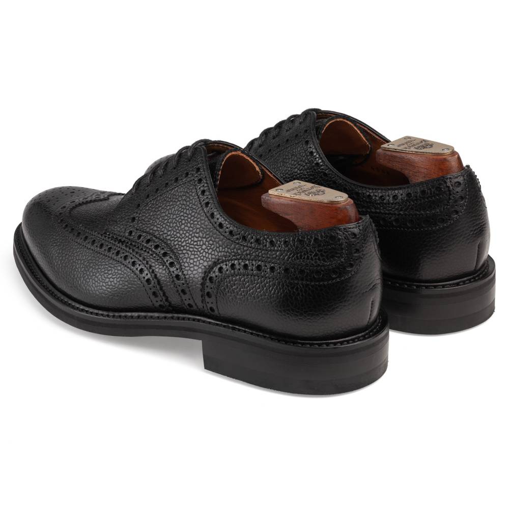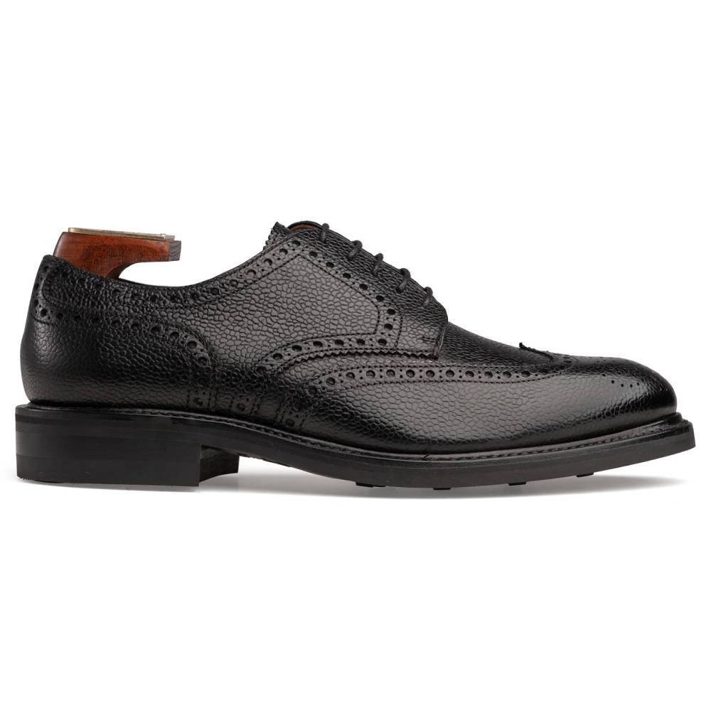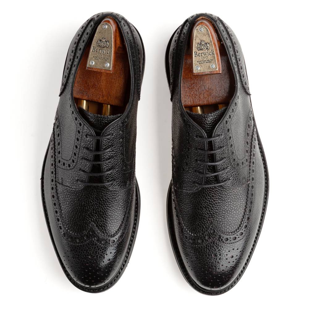 Традиционные массивные броги Berwick с открытой шнуровкой. Выполнены из плотной телячьей кожи с зернистой текстурой чёрного цвета, декорированной фестонами и характерным перфорированным узором. На нижнюю часть подошвы установлена прочная резина английской фирмы Dainite. Модель имеет усиленный рант с окантовкой, который добавляет подошве влагоустойчивость. Конструкция Goodyear Welted.