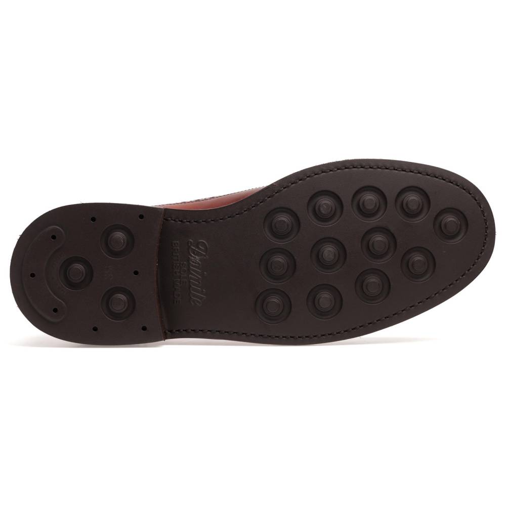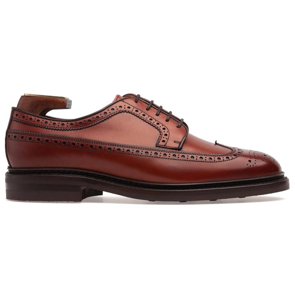 Массивные броги лонгвинги (Longwing Brogues) коричневого цвета от испанского бренда Berwick на прочной резиновой подошве Dainite. Верх выполнен из телячьей кожи растительного дубления с благородными затемнениями. Такой эффект достигается нанесением более тёмного воска на некоторые участки кожи и последующего его разогрева валиками (burnished calf). Модель имеет усиленный рант с окантовкой (storm welt), который добавляет подошве дополнительную защиту от влаги. Рант пришит к верху по всей окружности (360 градусов). Конструкция Goodyear Welted.