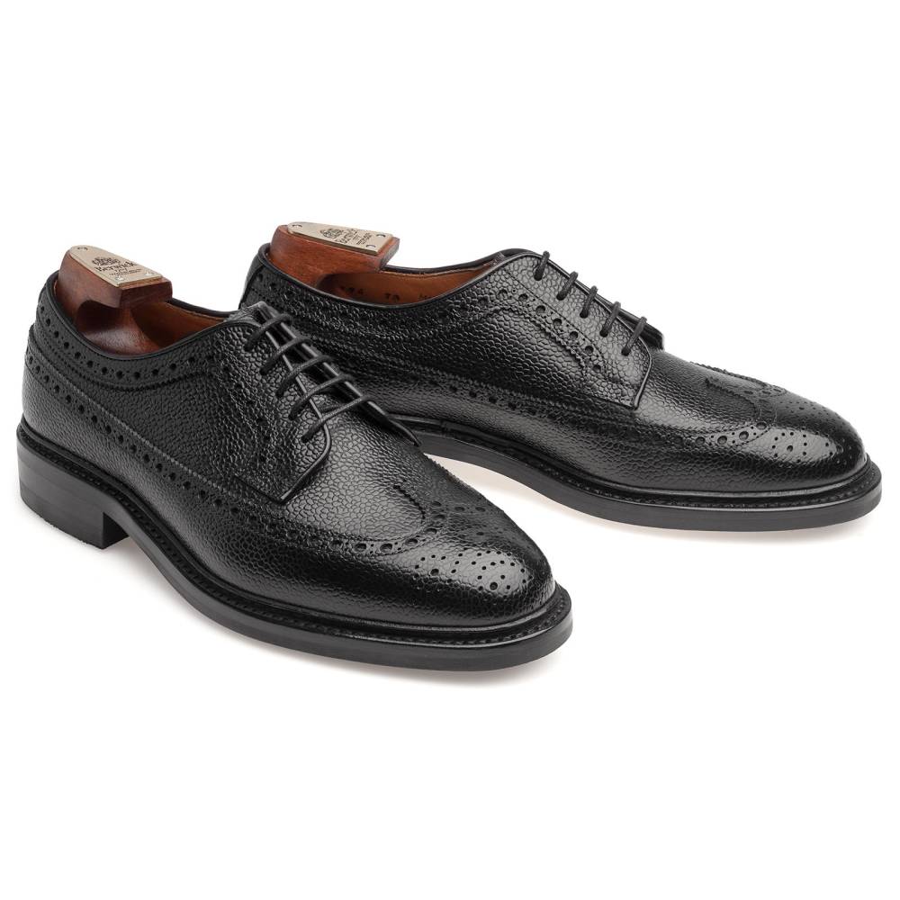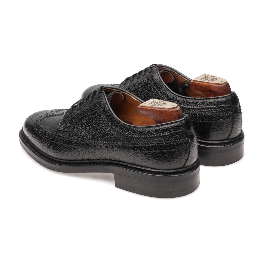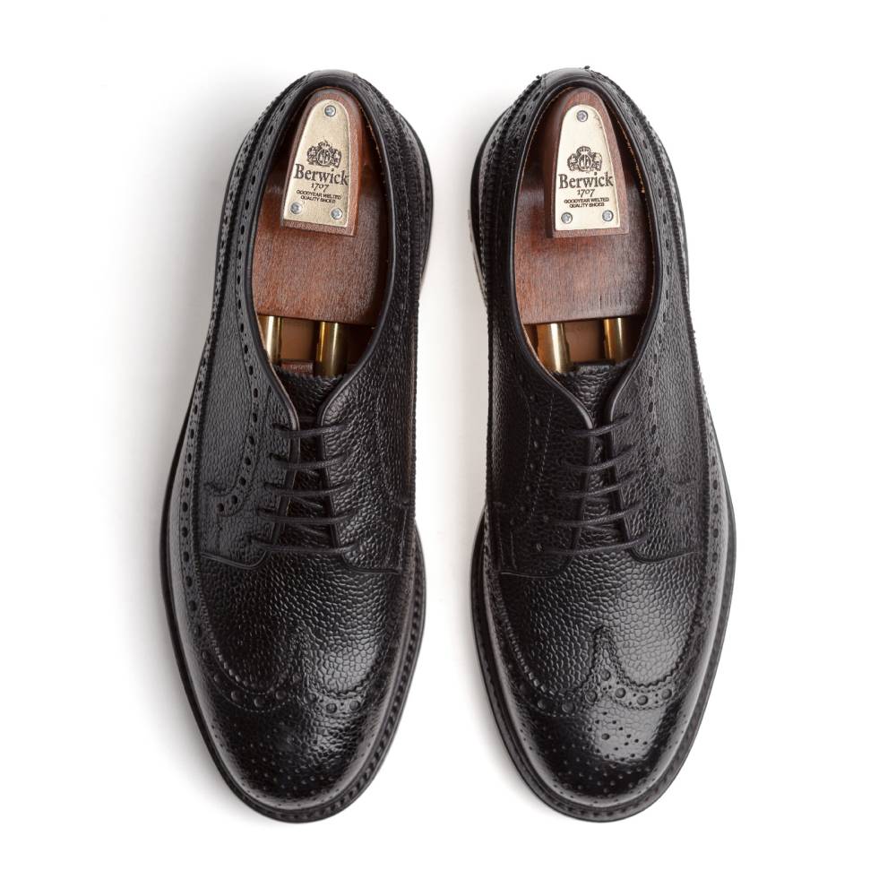 Массивные броги лонгвинги (Longwing Brogues) чёрного цвета испанского бренда Berwick с открытой шнуровкой на износостойкой резиновой подошве Dainite. Верх выполнен из плотной телячьей кожи с зернистой фактурой, украшенной традиционными узорами и фестонами. Модель имеет штормовой рант пришитый как к подошве, так и к верху. Такая технология добавляет обуви дополнительную защиту от влаги. Внутренняя отделка из тонкой мягкой кожи. Конструкция Goodyear Welted.
