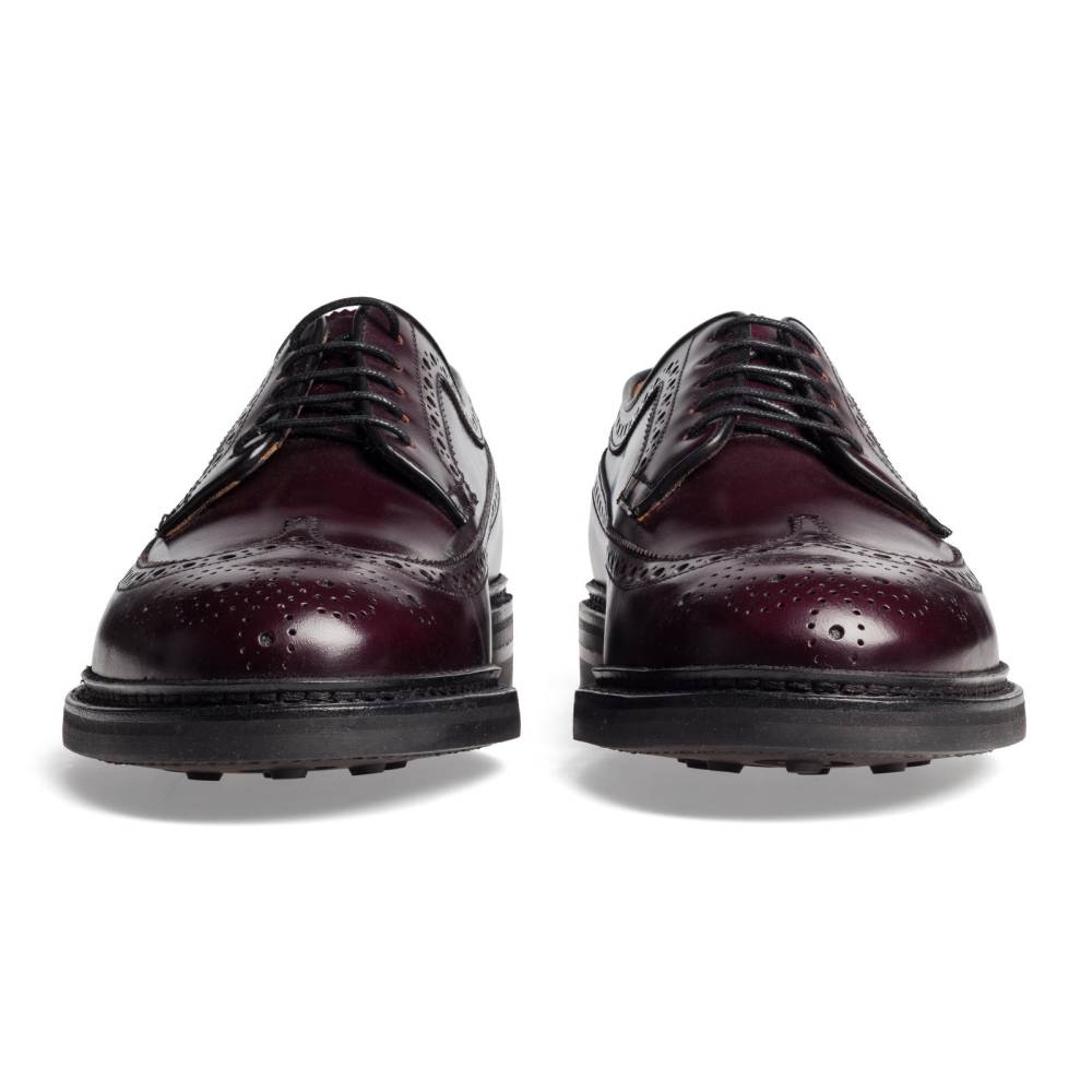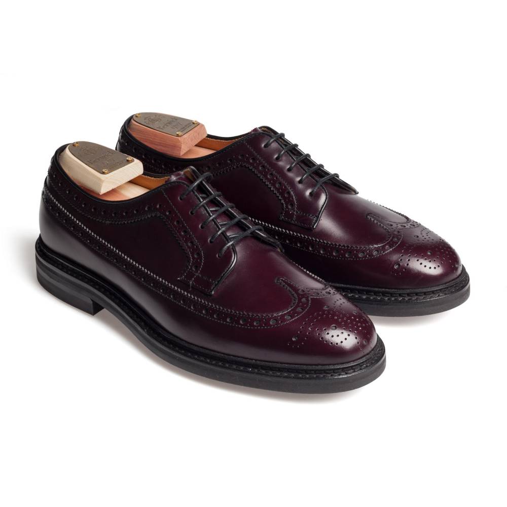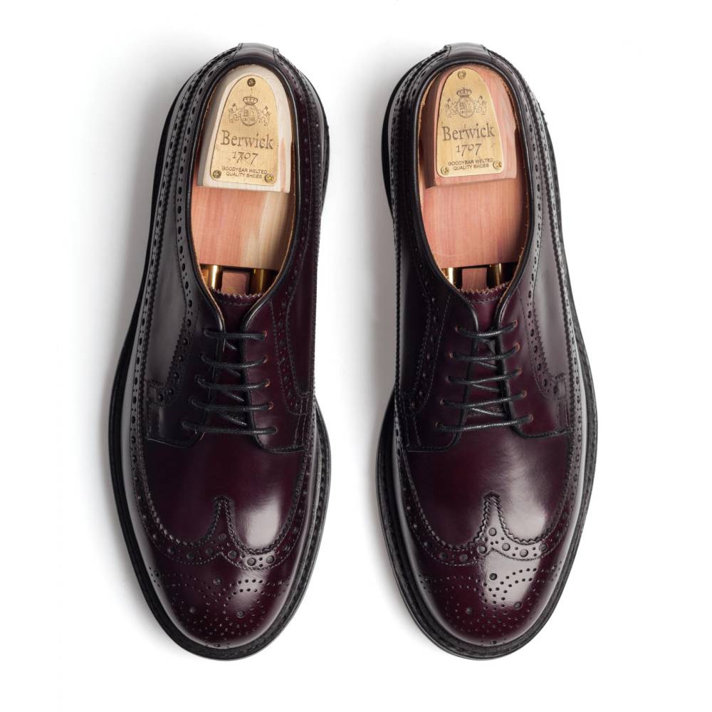 Массивные броги лонгвинги (Longwing Brogues) тёмно-бордового цвета испанского бренда Berwick с открытой шнуровкой на износостойкой резиновой подошве Dainite. Верх выполнен из плотной полированной телячьей кожи Rois с изысканным блеском, благодаря которому она выглядит подобно конской коже (cordovan leather). Модель украшена традиционными узорами и фестонами. Внутренняя отделка из тонкой мягкой кожи. Конструкция Goodyear Welted.