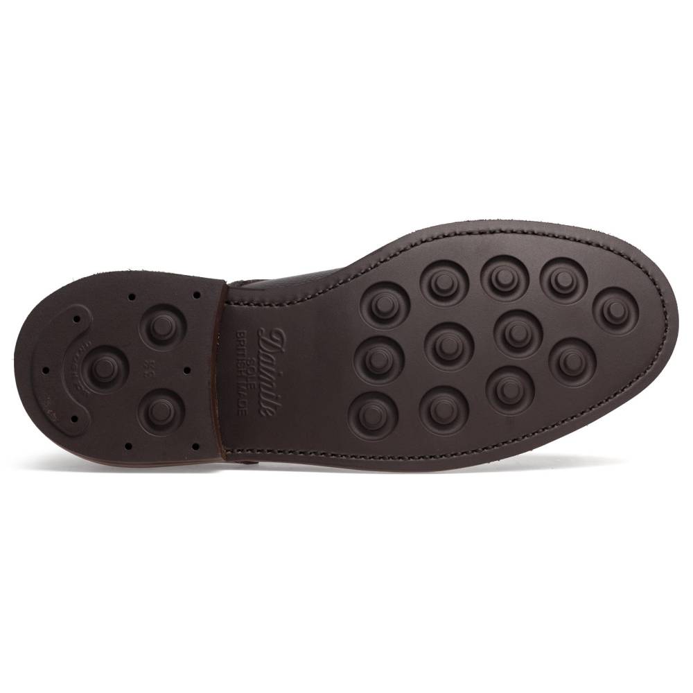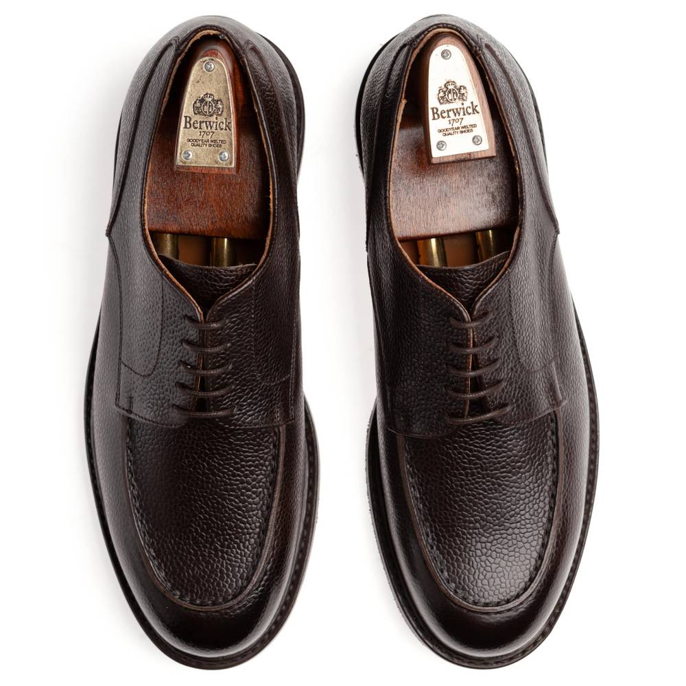 Повседневные туфли дерби испанской фирмы Berwick на массивной двухслойной подошве из кожи и резины. Верх выполнен из зернистой кожи тёмно-коричневого цвета. Модель имеет усиленный рант с окантовкой, который добавляет подошве влагоустойчивость. Внутренняя отделка из мягкой приятной на ощупь кожи. Нижняя часть подошвы выполнена из прочной резины Dainite. Конструкция Goodyear Welted.