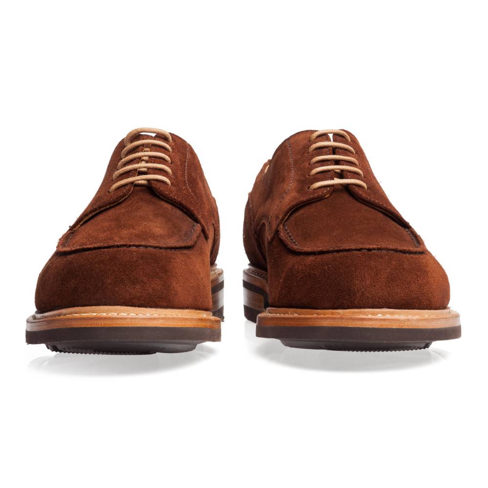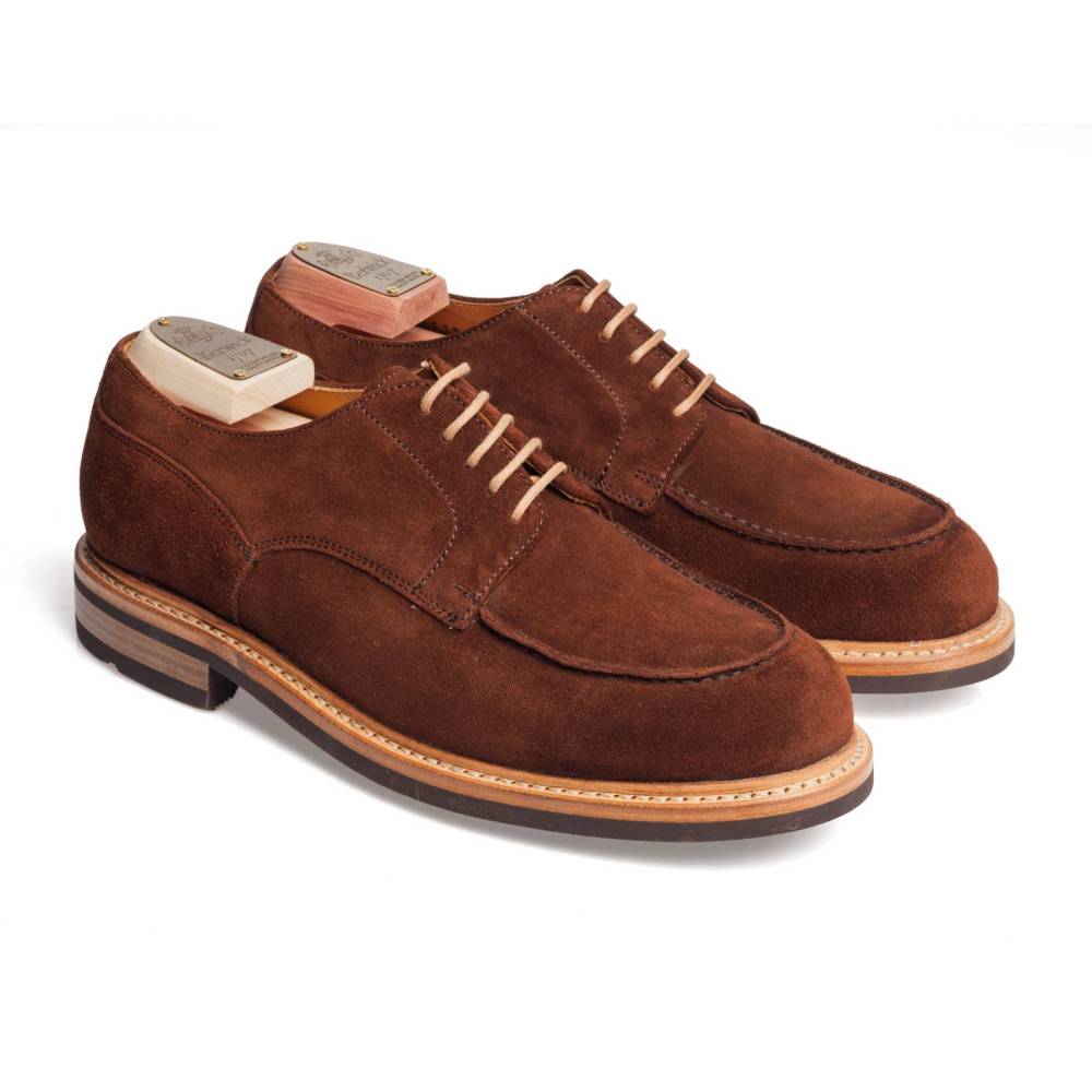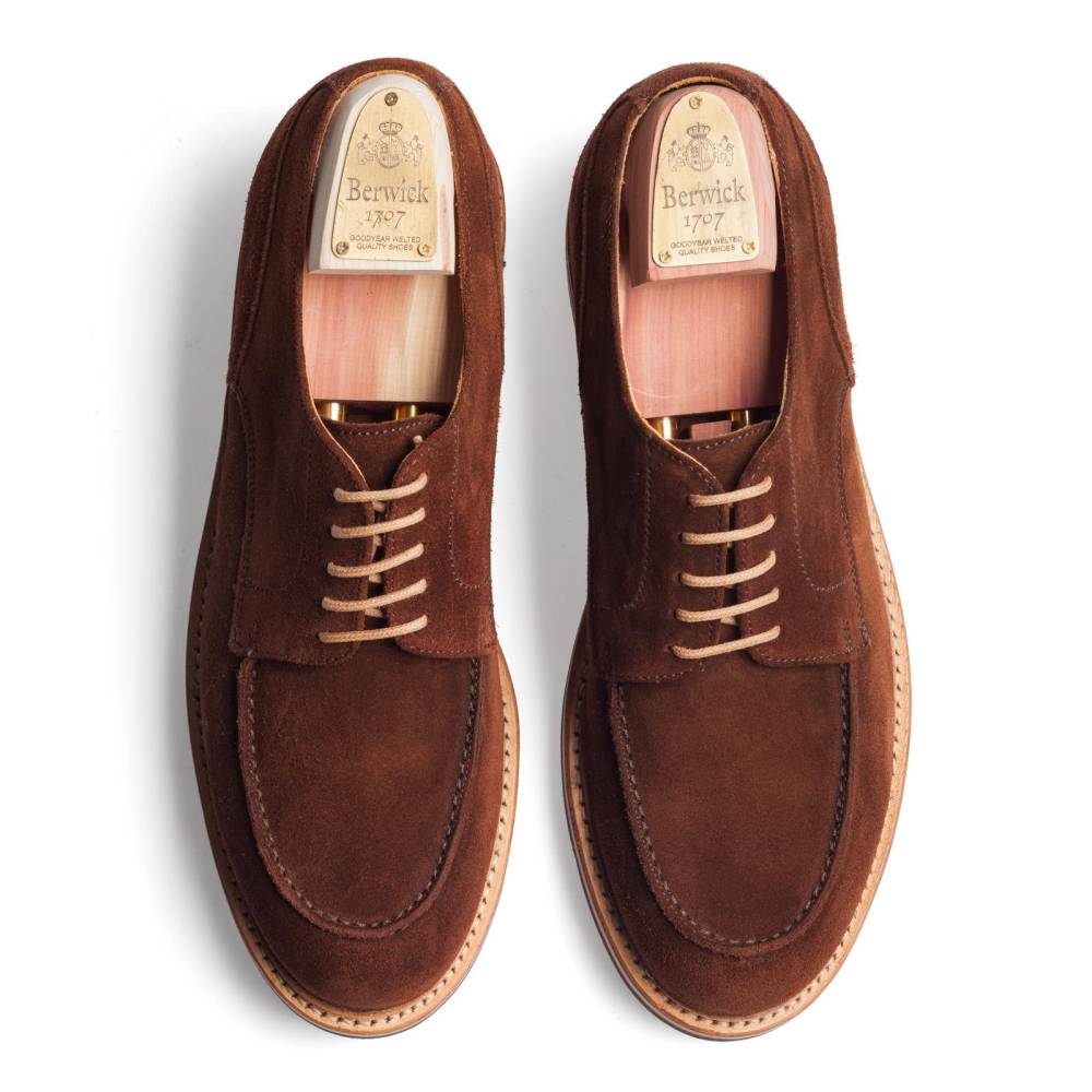 Повседневные туфли дерби испанской фирмы Berwick на массивной двухслойной подошве из кожи и резины. Верх выполнен из плотной бархатистой замши коричневого цвета. Модель имеет усиленный рант с окантовкой (storm welt), который добавляет подошве влагоустойчивость. Внутренняя отделка из мягкой приятной на ощупь кожи. Конструкция Goodyear Welted.
