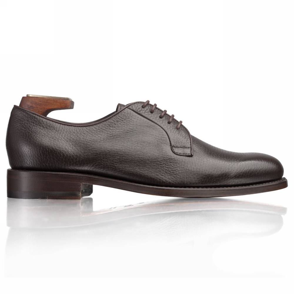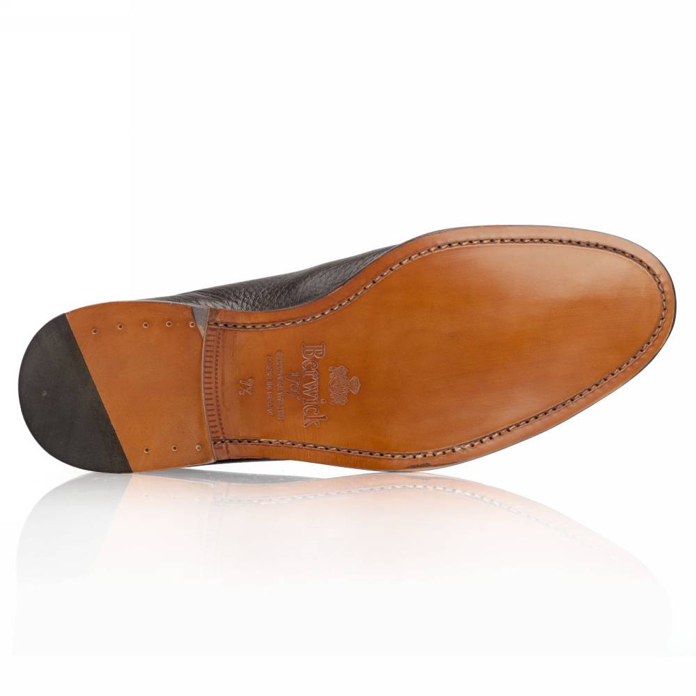 Лёгкие тёмно-коричневые дерби испанской фабрики Berwick на кожаной подошве. Дизайн модели удачно балансирует между строгостью и умеренным casual стилем. Верх сшит из мягкой приятной на ощупь оленьей кожи с зернистой фактурой без подкладки. Конструкция Goodyear Welted.
