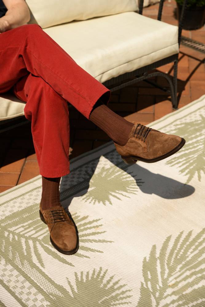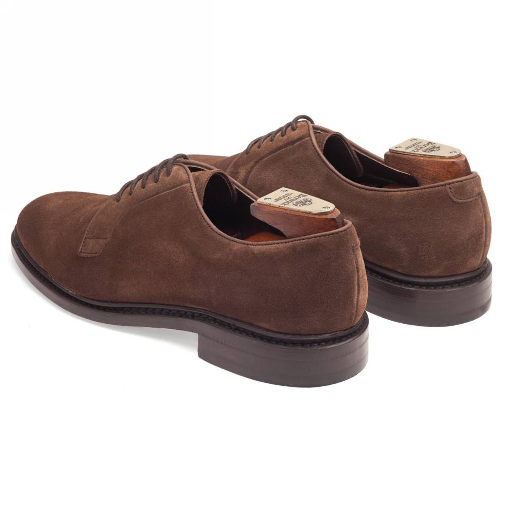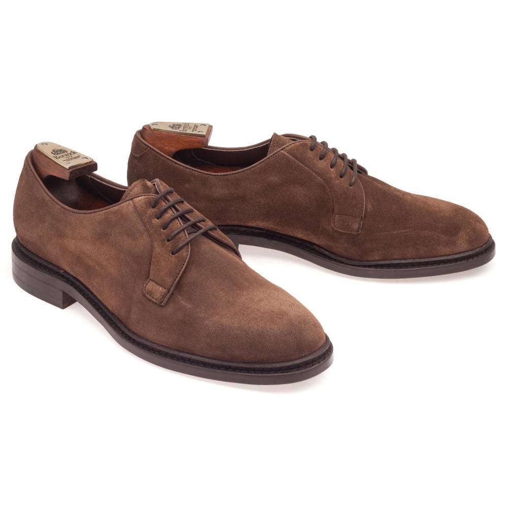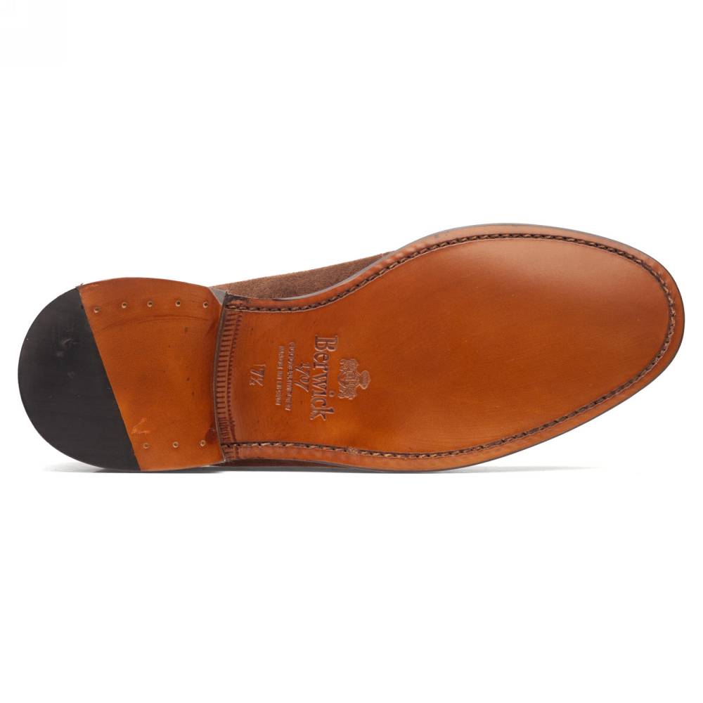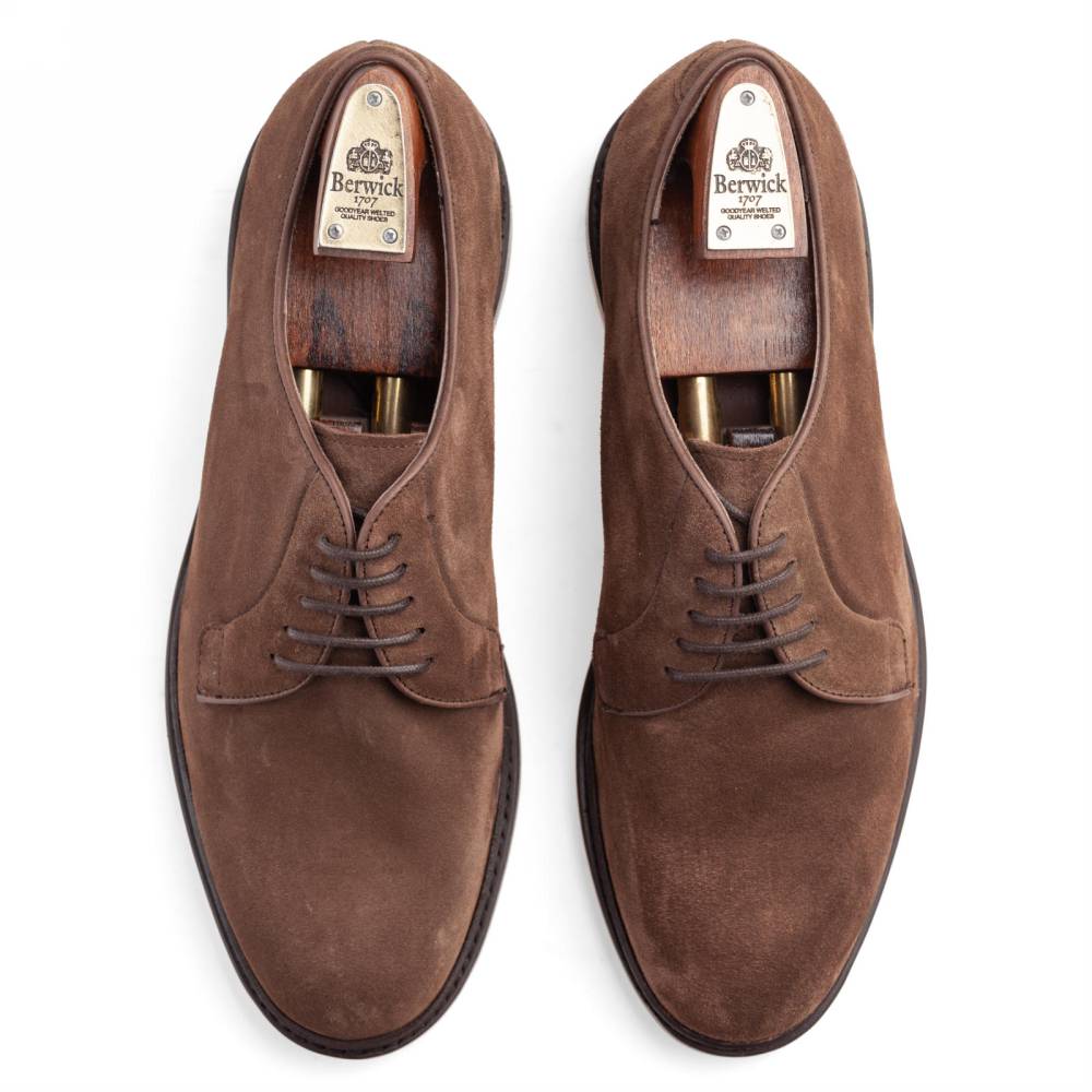 Лёгкие повседневные дерби испанской фирмы Berwick на кожаной подошве. Верх выполнен из мягкой бархатистой замши тёмно-коричневого цвета с водоотталкивающей пропиткой. Модель имеет усиленный рант с окантовкой (storm welt), который добавляет подошве влагоустойчивость. Облегчённая подкладка. Конструкция Goodyear Welted.