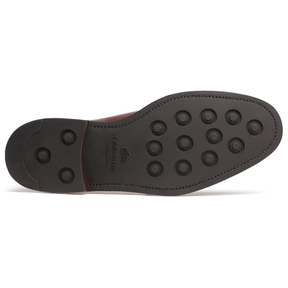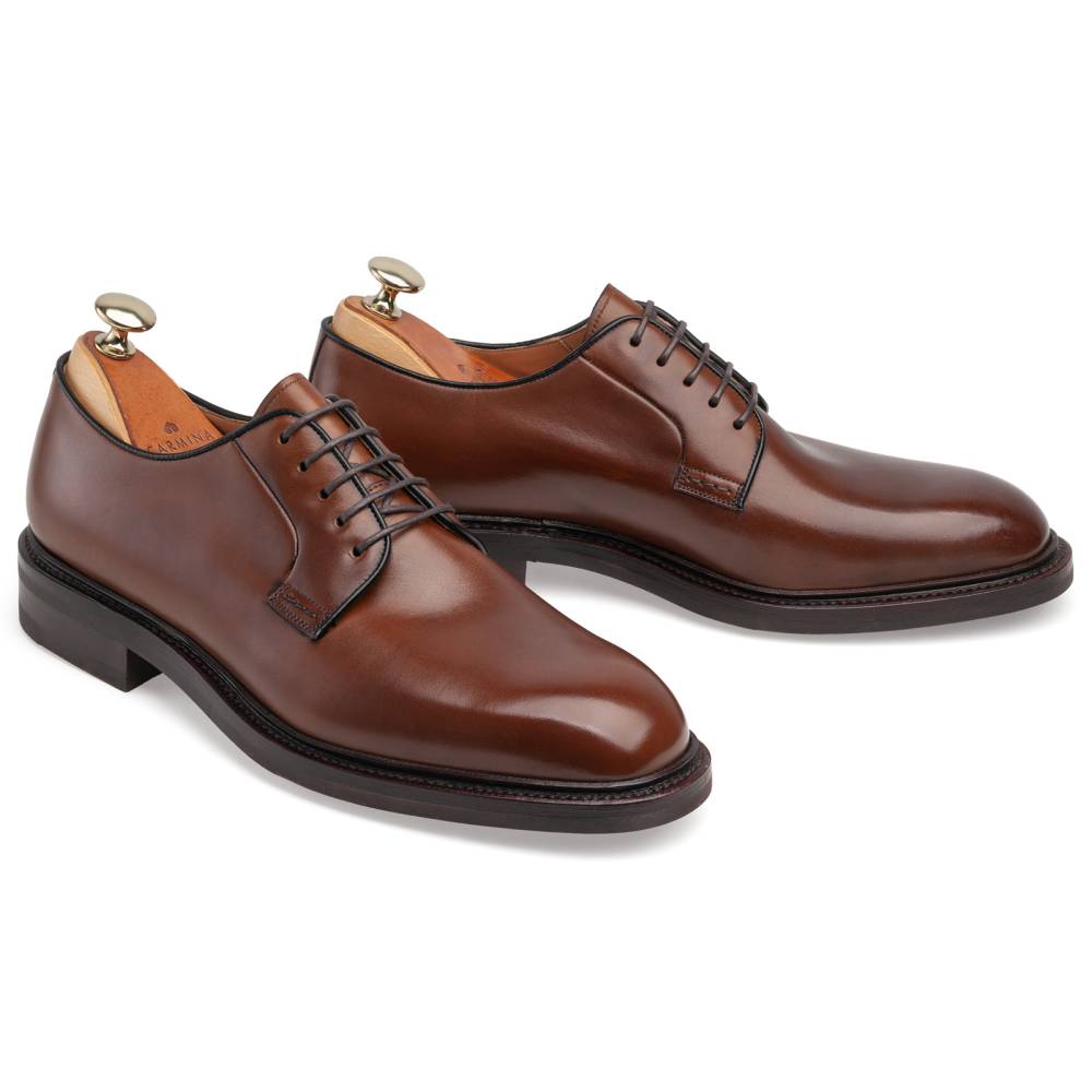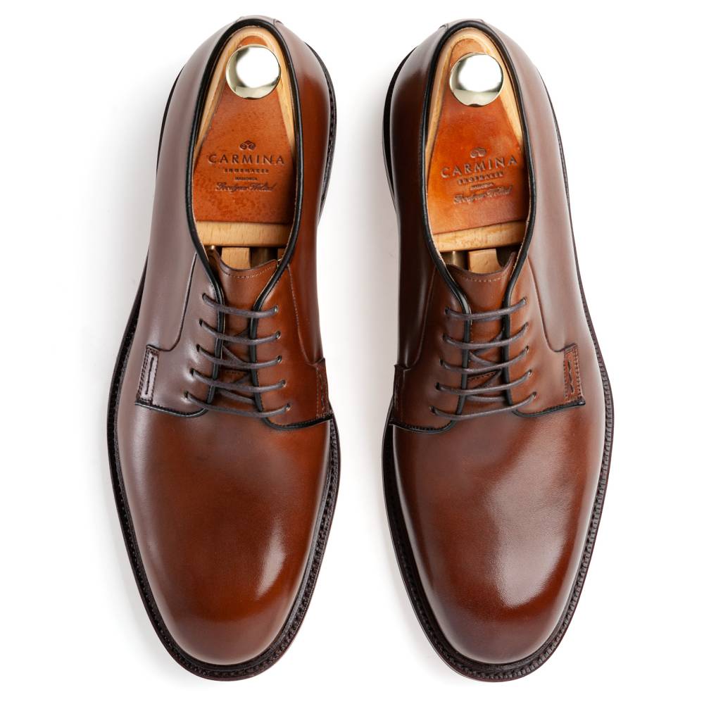Тёмно-коричневые дерби испанской марки Carmina. Благодаря лаконичному дизайну, модель довольно строга и в то же время универсальна, а единственное украшение — три крупных стежка на берцах — производит сдержанное впечатление. Силуэт этих дерби напоминает традиционные американские блюхеры (так принято называть дерби, у которых берцы с люверсами для шнурков нашиты поверх основных берцев, составляющих единое целое с союзкой). Штормовой рант придает туфлям дополнительную защиту от влаги.