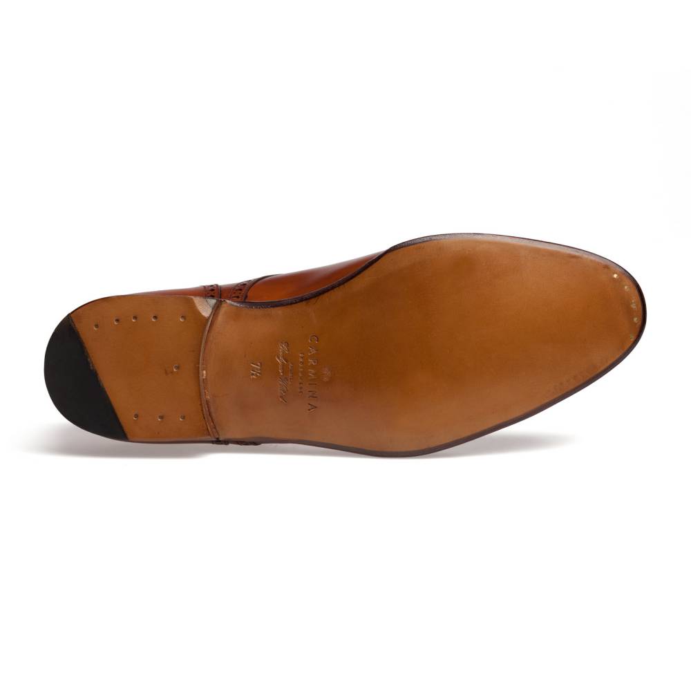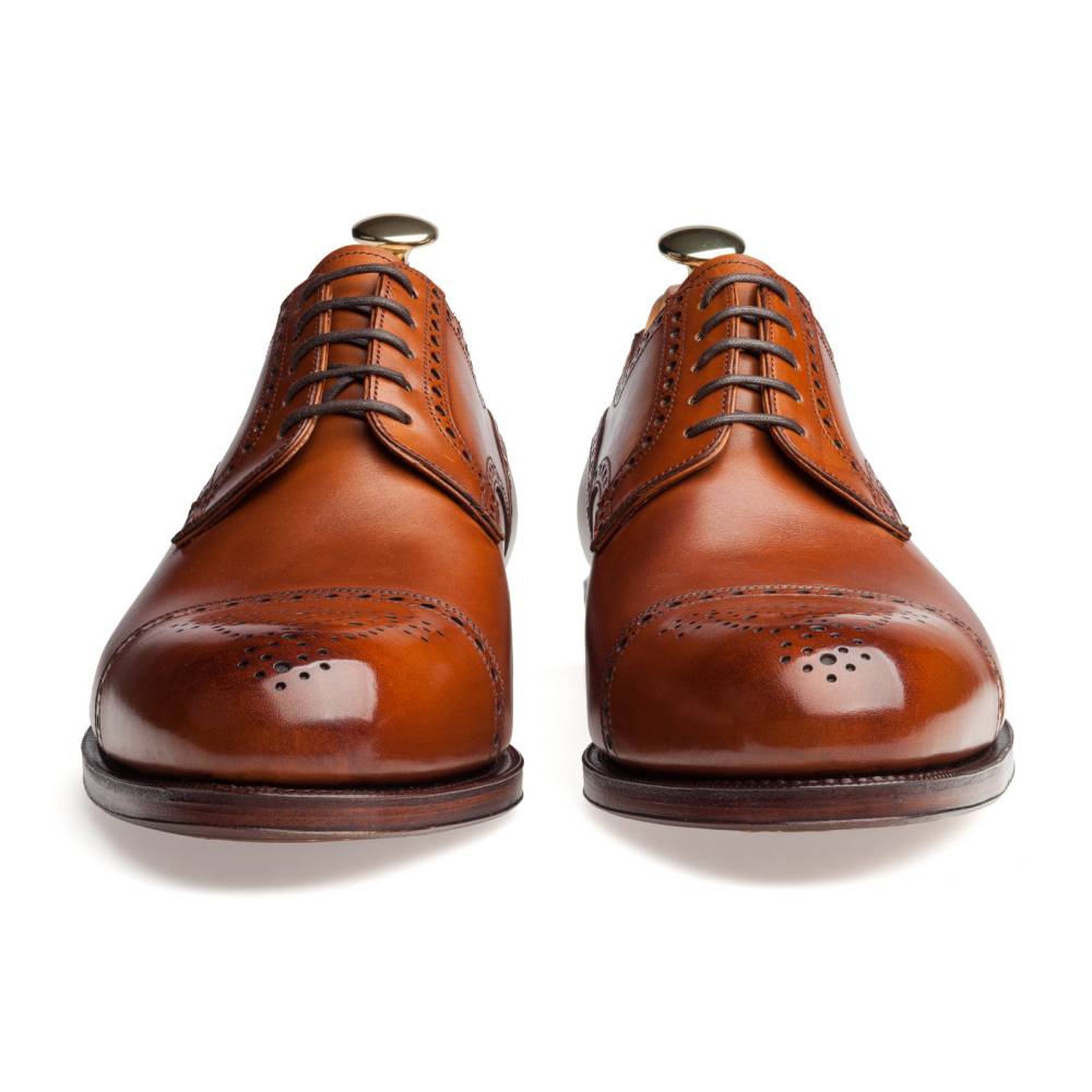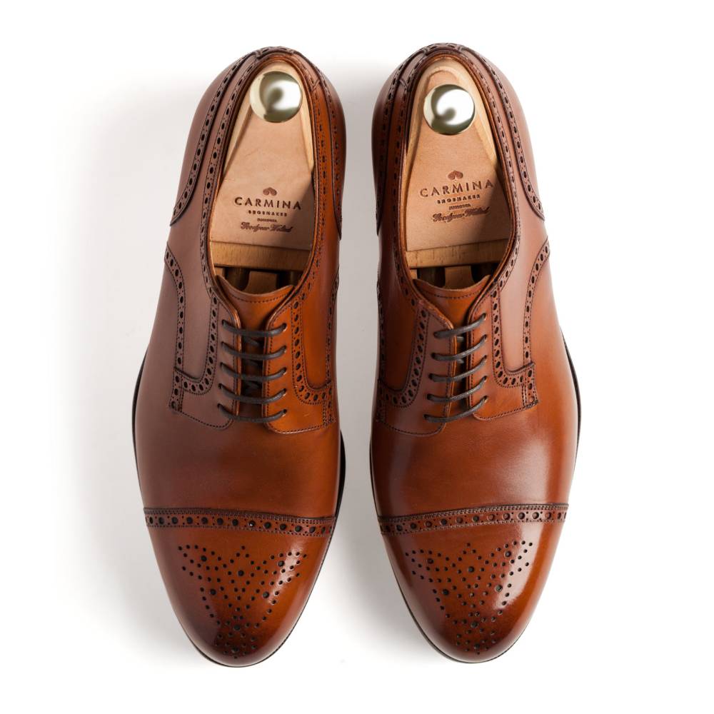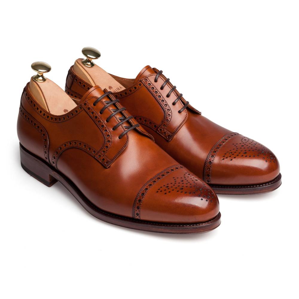 Дерби полуброги от испанской фирмы Carmina благородного коньячного цвета. Верх модели выполнен из высококачественной телячьей кожи. Туфли представляют собой традиционный австрийский тип обуви «Alt Wien» (Старая Вена), с характерным для него медальоном на мысе и перфорацией на берцах. Кожаная подошва. Конструкция Goodyear Welted.