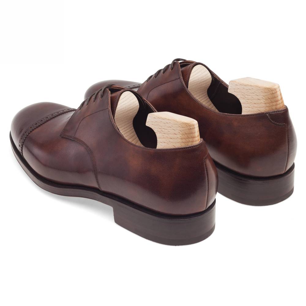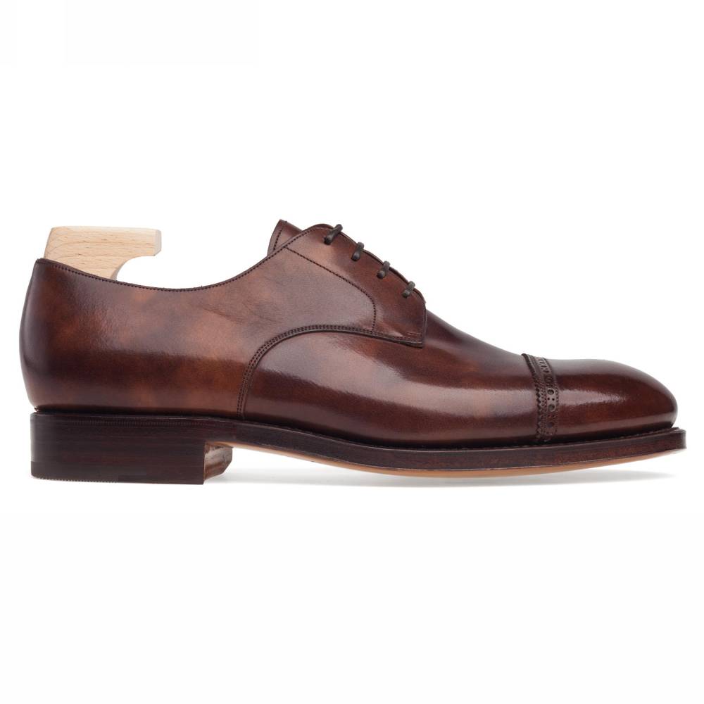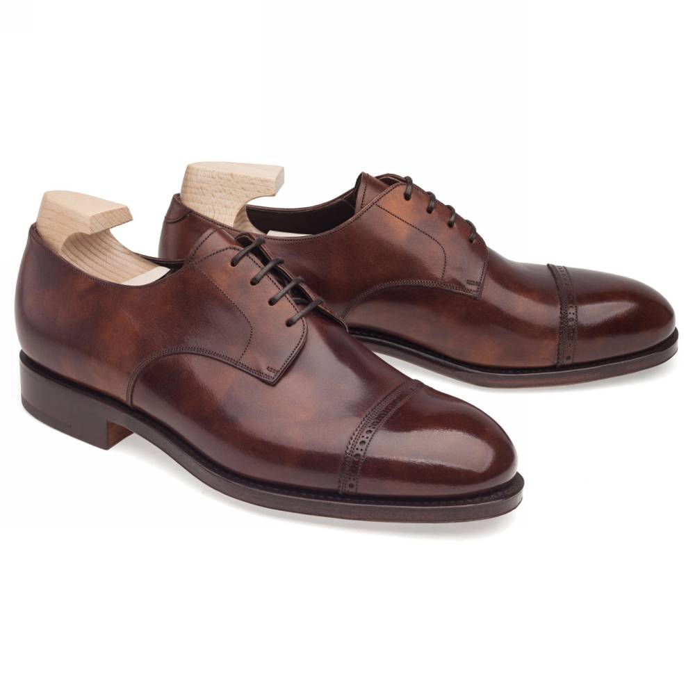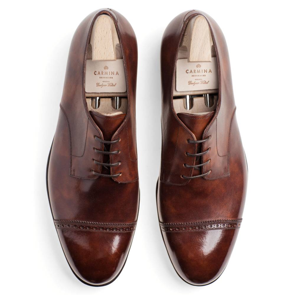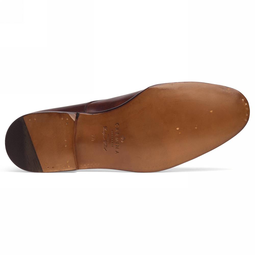 Повседневные туфли Carmina Shoemaker тёмно-коричневого цвета на кожаной подошве с закрытым швом. Верх обуви выполнен из гладкой телячьей кожи «museum calf». Особенностью данного типа кожи является характерный «пятнистый окрас», который схож с узорами на мраморе. Модель украшена ненавязчивой перфорацией вдоль шва на мыске. Конструкция Goodyear Welted.