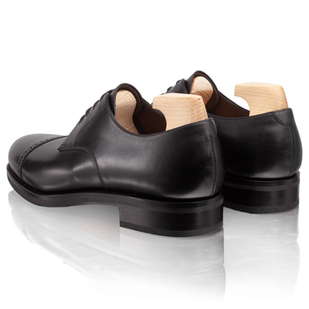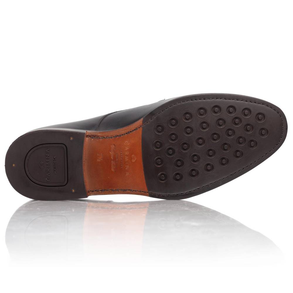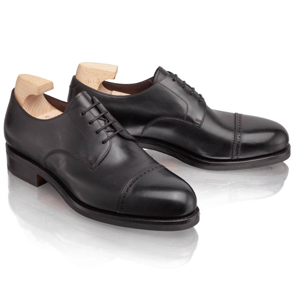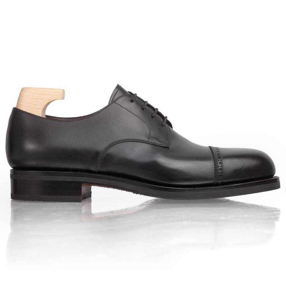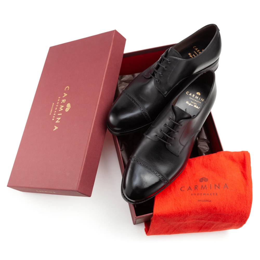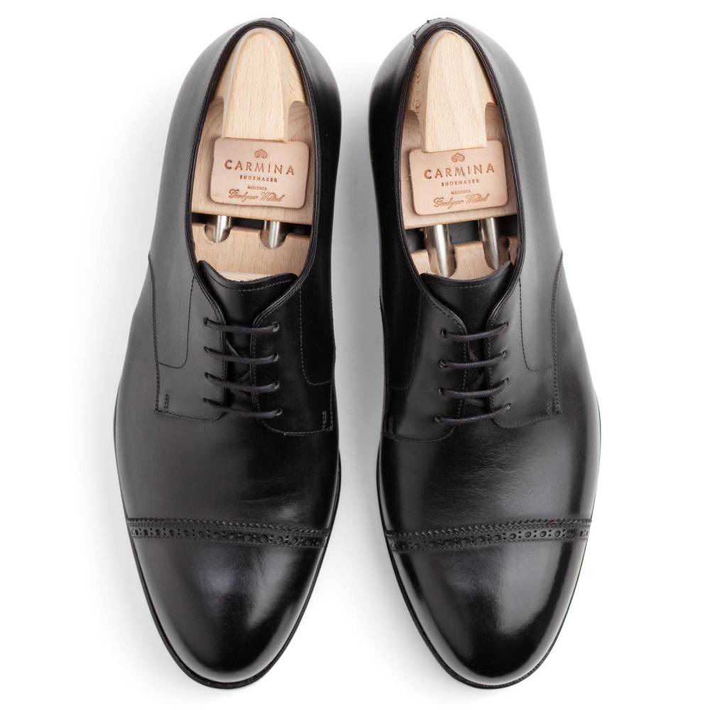 Деловые туфли-дерби Carmina. Отрезной мысок украшен аккуратной перфорацией вдоль шва (Punched Cap Toe), что придает паре менее формальный, но изысканный вид. Выполненый из гладкой телячьей кожи чёрного цвета. Подкладка из телячьей кожи растительного дубления обеспечивает отличную воздухопроницаемость и комфорт в течение всего дня. Модель имеет практичную подошву из кожи и резины, которая превосходно подходит для города в дождливое время года. Конструкция Goodyear Welted.