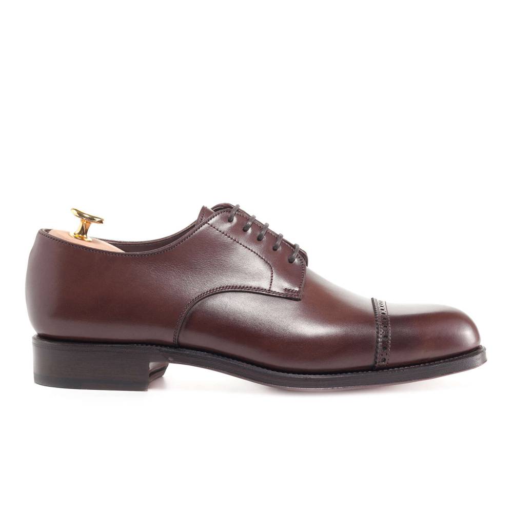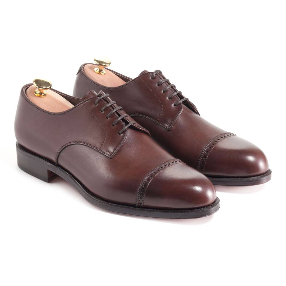 Дерби Carmina на двухслойной кожаной подошве. Верхняя часть выполнена из плотной телячьей кожи коричневого цвета. Внутренняя отделка из тонкой гладкой кожи. Мыс украшен перфорированным узором. Конструкция Goodyear.