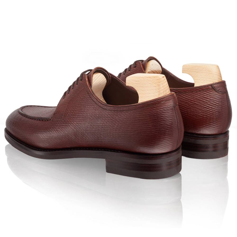 Элегантные дерби с разделенным мыском (Split Toe) испанского бренда Carmina. Верх выполнен из фактурной кожи цвета красного дерева английской мануфактуры J&FJ Co. Материал представляет собой современную копию исторической русской юфти, поднятой с борта затонувшего в 1786 году судна "Метта Катарина". Использование традиционного метода дубления корой и последующей ручной обработке березовым маслом на этапе отделки делает эту кожу невероятно износостойкой и наделяет её уникальной текстурой. Подкладка из кожи растительного дубления обеспечивает превосходный комфорт. Пара оснащена комбинированной двухслойной подошвой из кожи и резины Dainite. Традиционная конструкция Goodyear Welted.