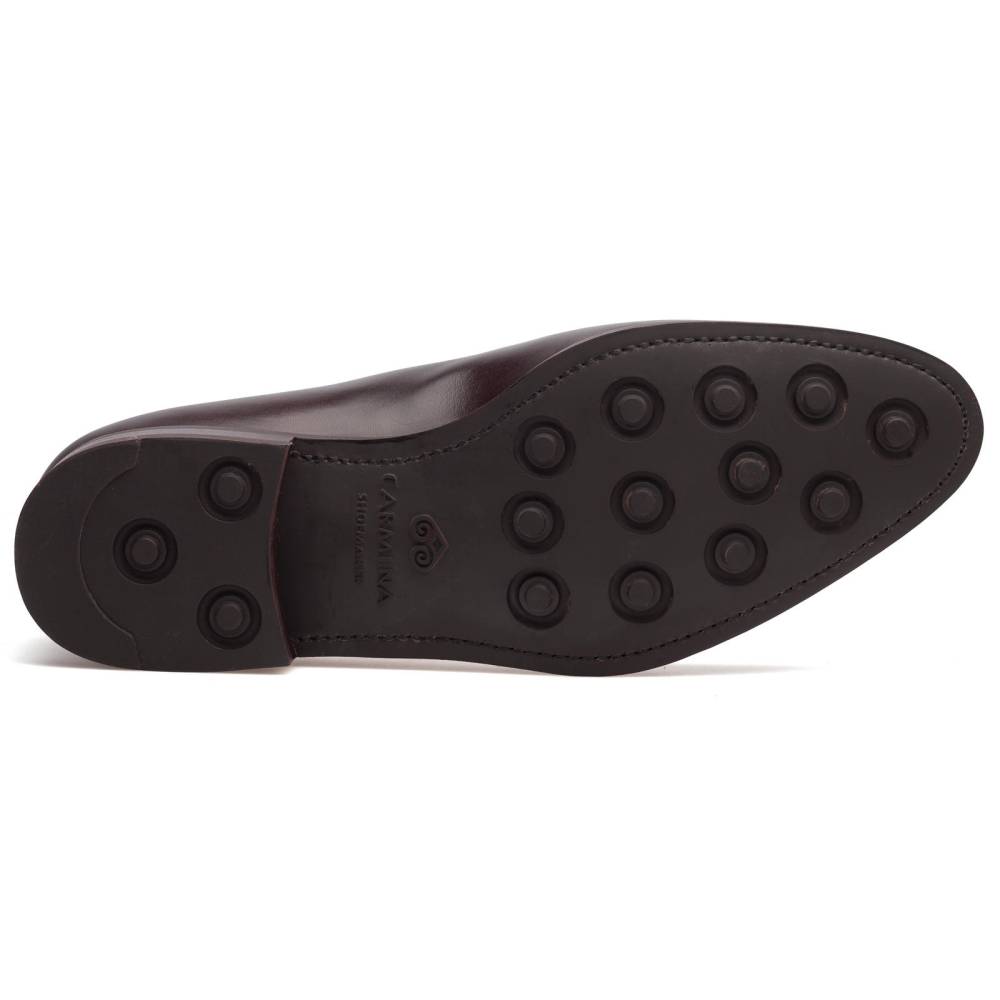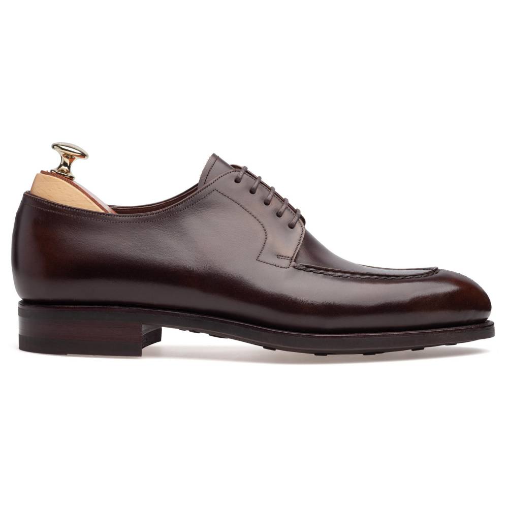 Повседневные тёмно-коричневые туфли Carmina Shoemaker на резиновой подошве. Модель представляет собой дерби в норвежском стиле с тремя сшитыми элементами в передней части (split toe derby). Верх изготовлен из высококачественной гладкой телячьей кожи demascable, которая отличается неповторимыми переходами цвета от тёмно- к светло-коричневому. Чтобы достичь такого результата, мастера на фабрике вручную тонируют каждую пару. Конструкция Goodyear Welted.