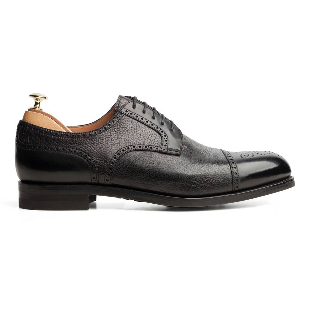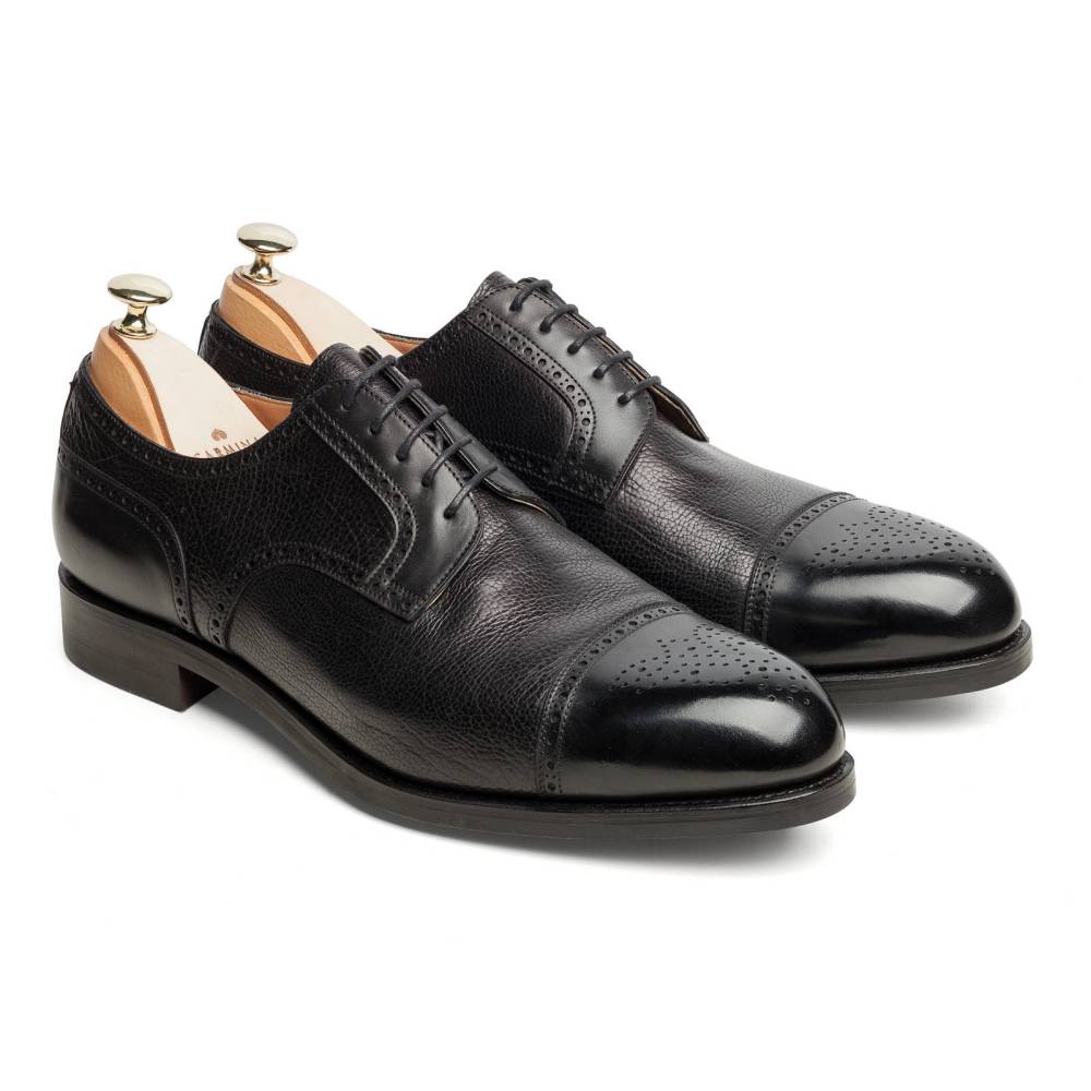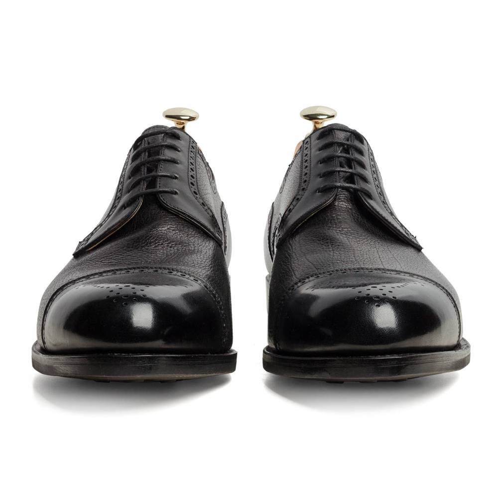Мужские туфли полуброги с отрытой шнуровкой от испанского бренда Carmina. Модель имеет комбинированный верх из гладкой телячьей кожи и кожи ламы с зернистой текстурой чёрного цвета. Подошва выполнена из прочной резины английской фирмы Dainite. Туфли украшены традиционной перфорацией и узором на мысе. Конструкция Goodyear Welted.