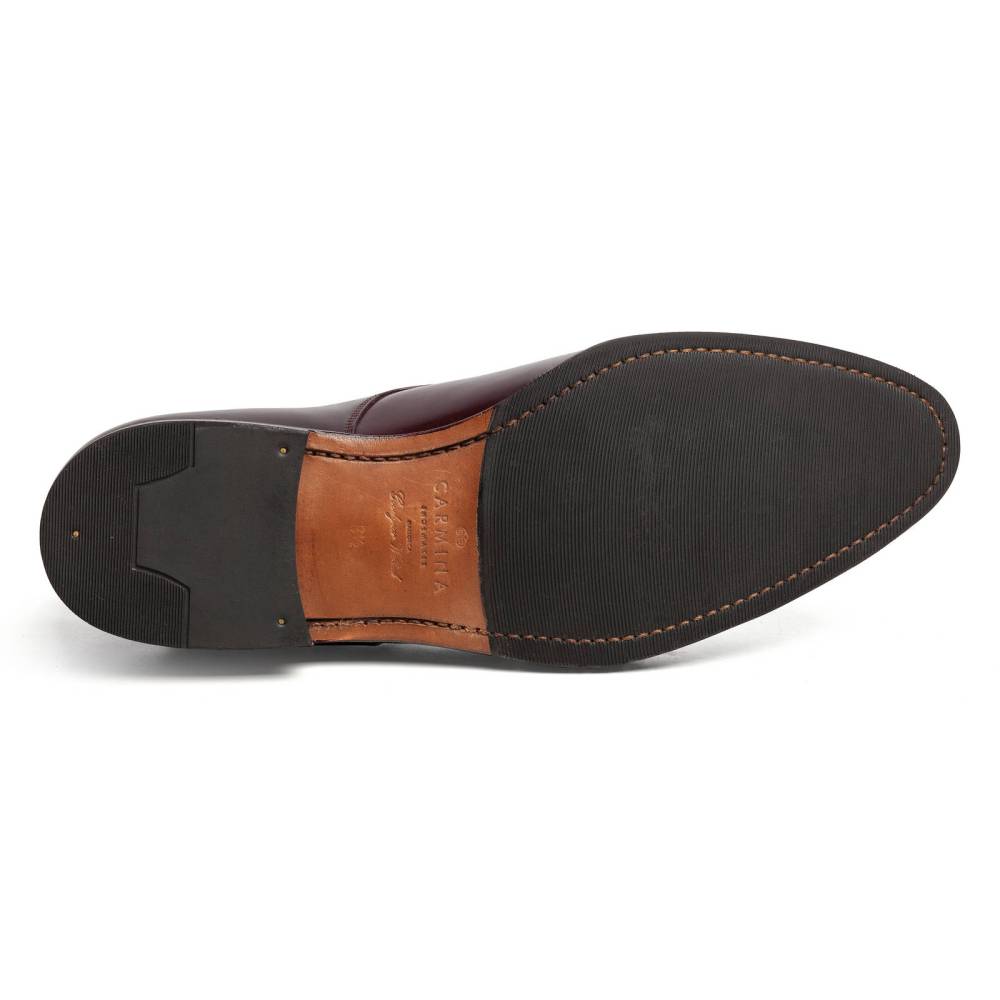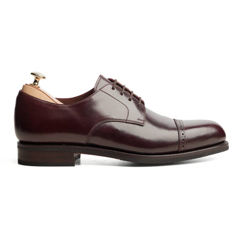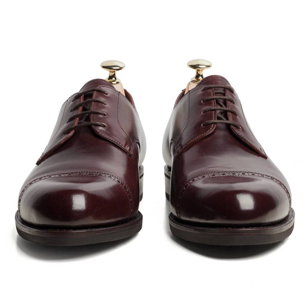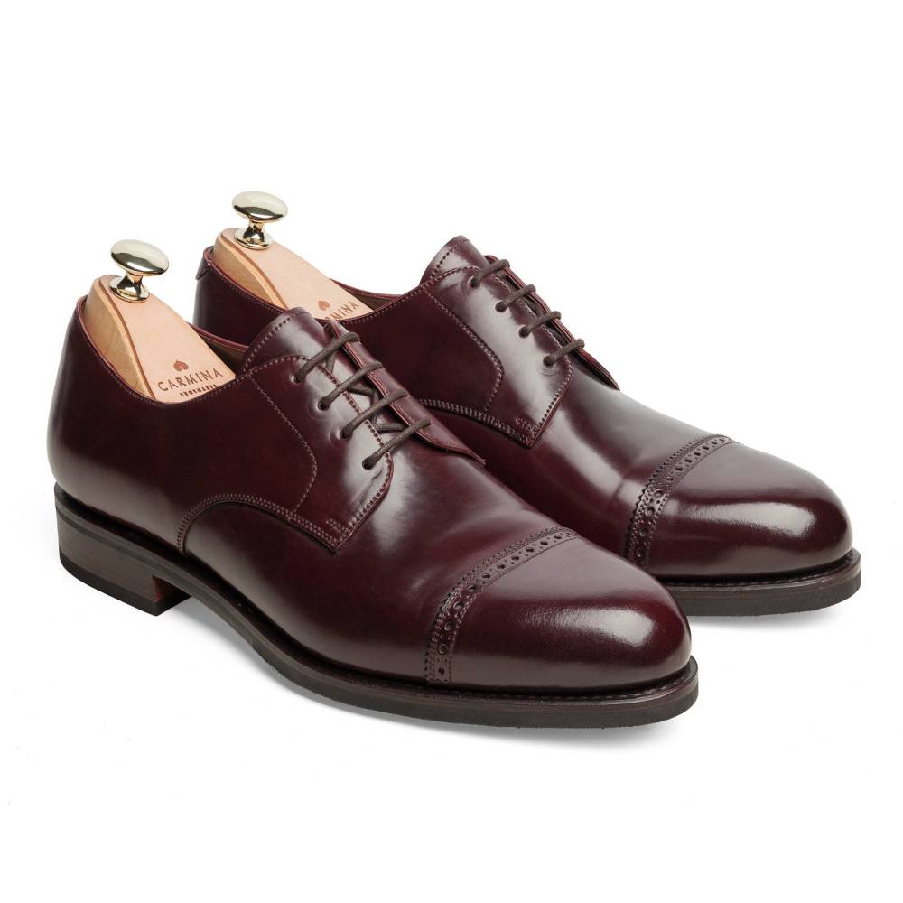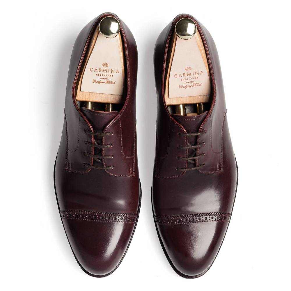 Мужские туфли дерби от испанского бренда Carmina. Верх выполнен из плотной лошадиной кожи глубокого бордового цвета. Модель имеет практичную комбинированную подошву из кожи и резины. Конструкция Goodyear Welted.