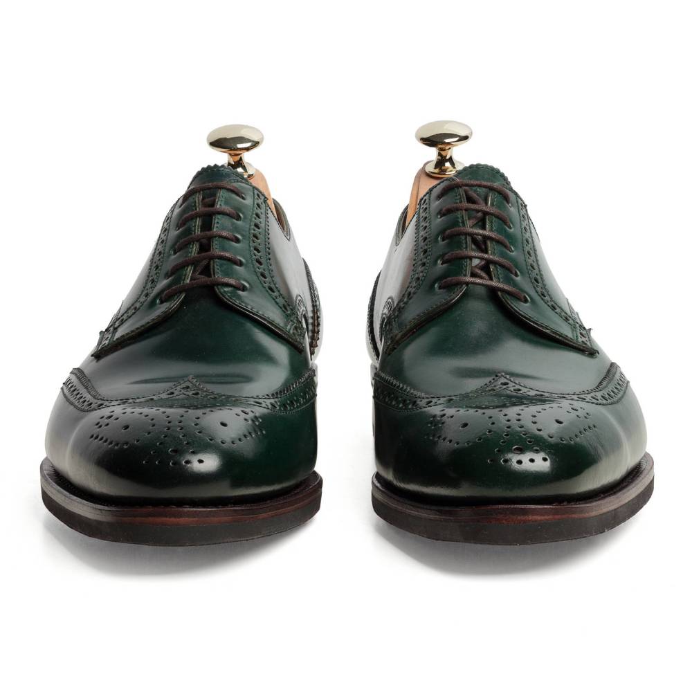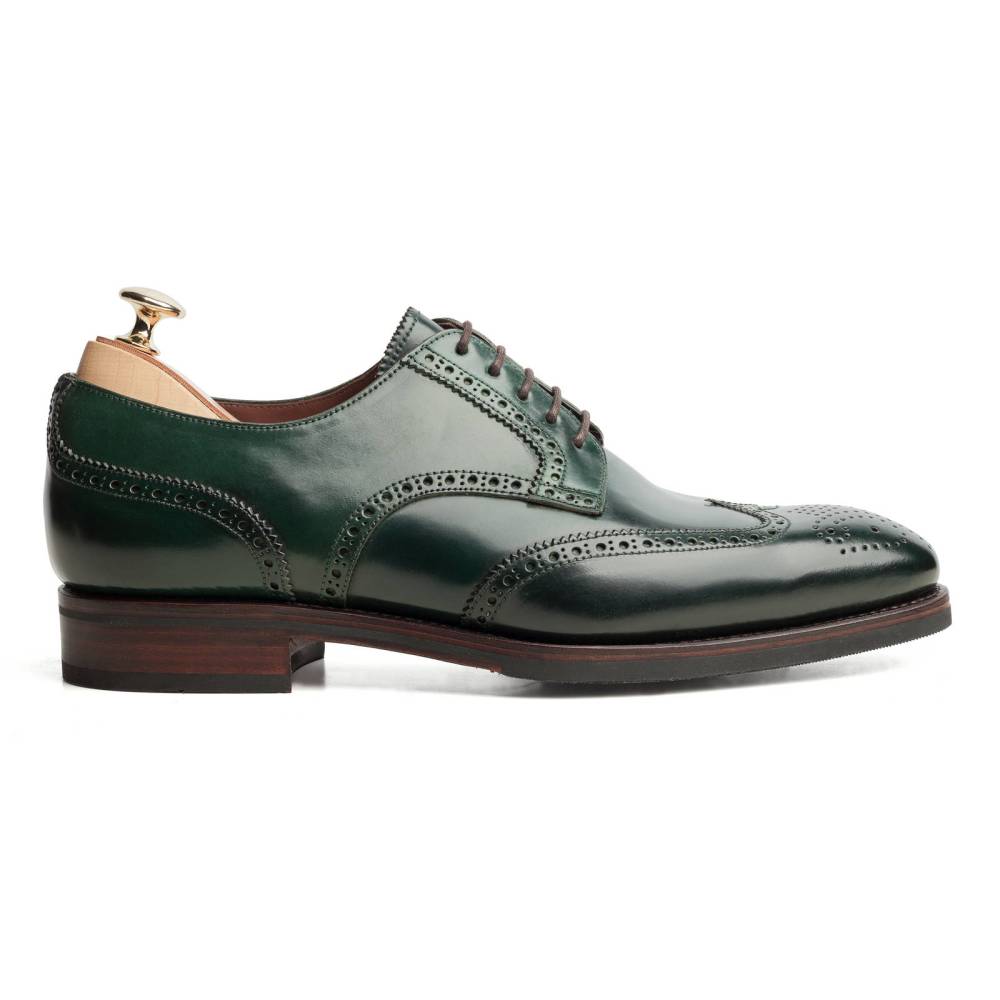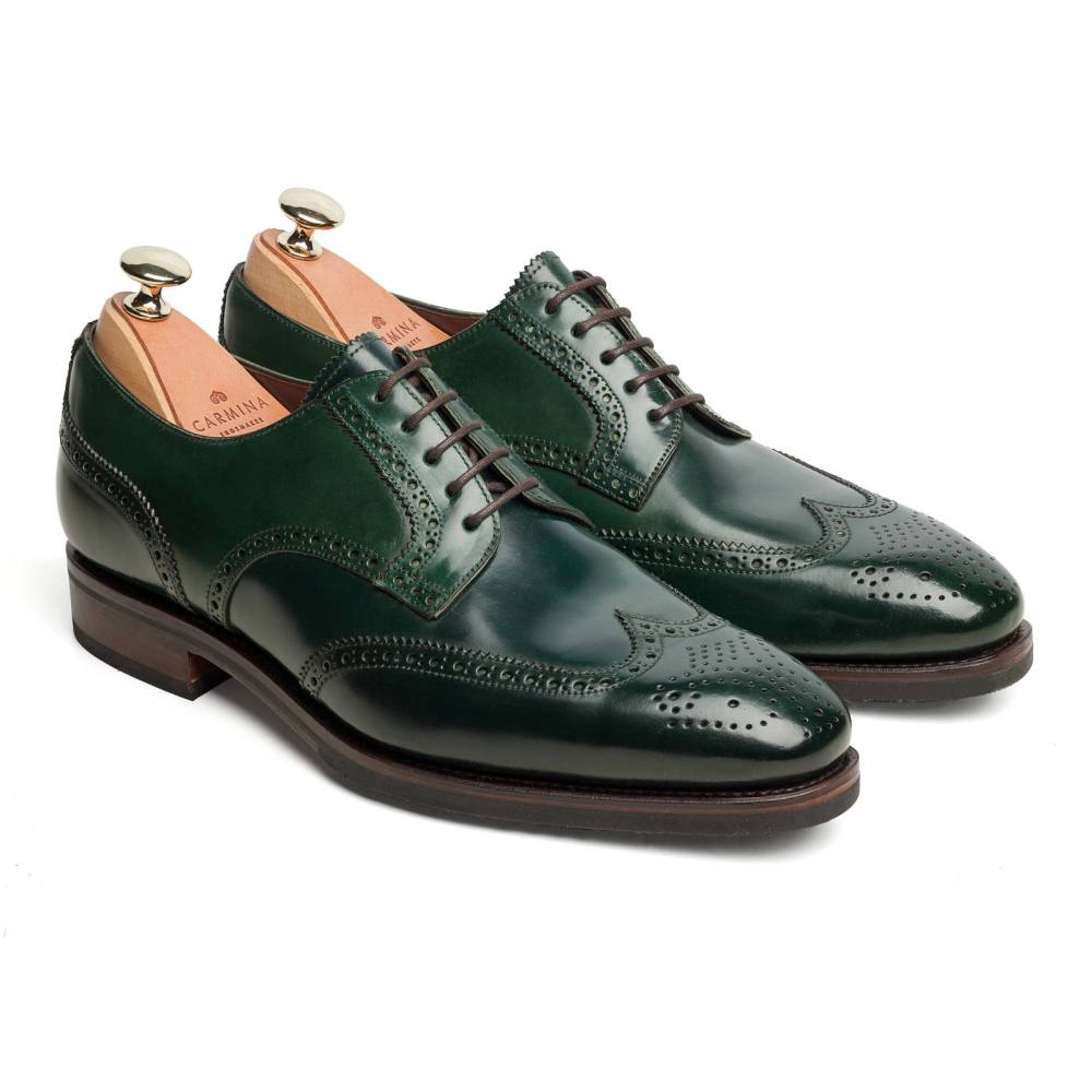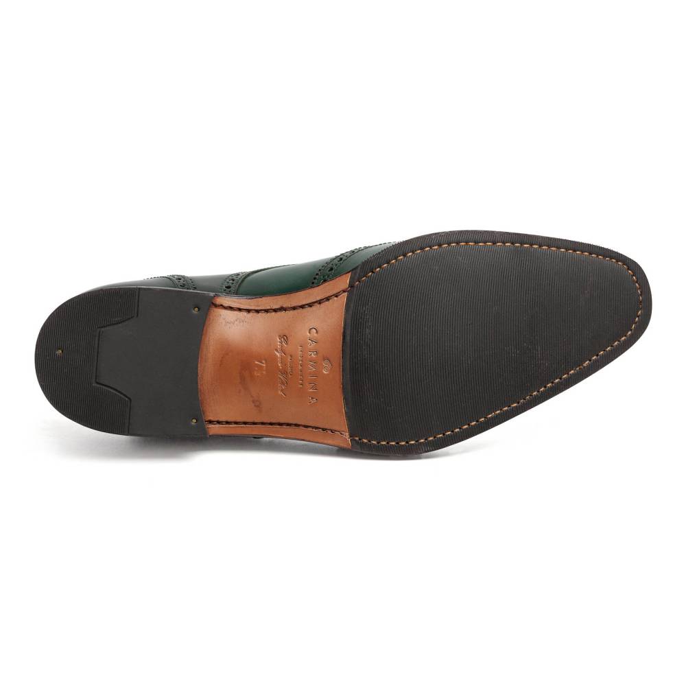 Мужские туфли дерби от испанского бренда Carmina. Верх выполнен из плотной лошадиной кожи глубокого зеленого цвета и украшен традиционной узорной перфораций вдоль конструктивных линий и на мысе. Модель имеет практичную комбинированную подошву из кожи и резины. Конструкция Goodyear Welted.