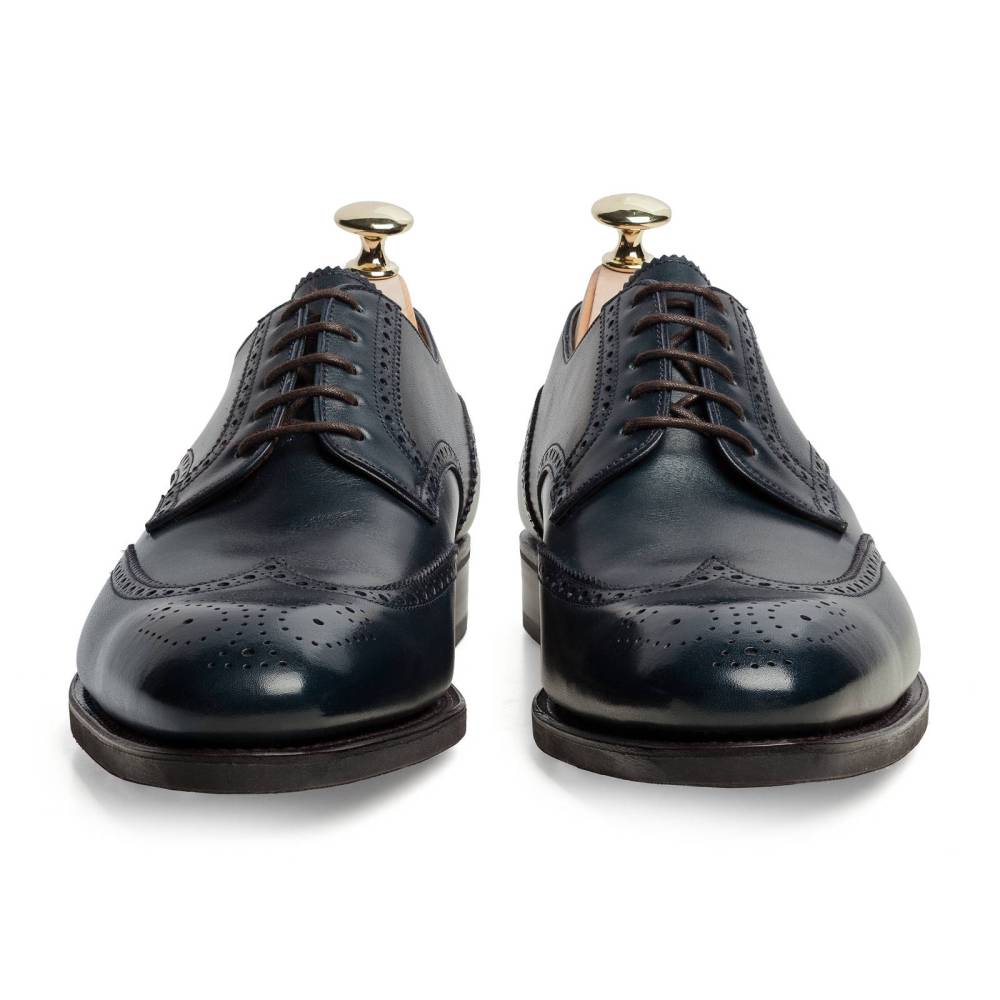 Мужские туфли дерби от испанского бренда Carmina. Верх выполнен из плотной телячьей кожи тёмно-синего цвета и украшен традиционной узорной перфораций вдоль конcтруктивных линий на мысе. Модель имеет практичную комбинированную подошву из кожи и резины. Конструкция Goodyear Welted.
