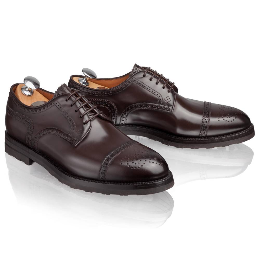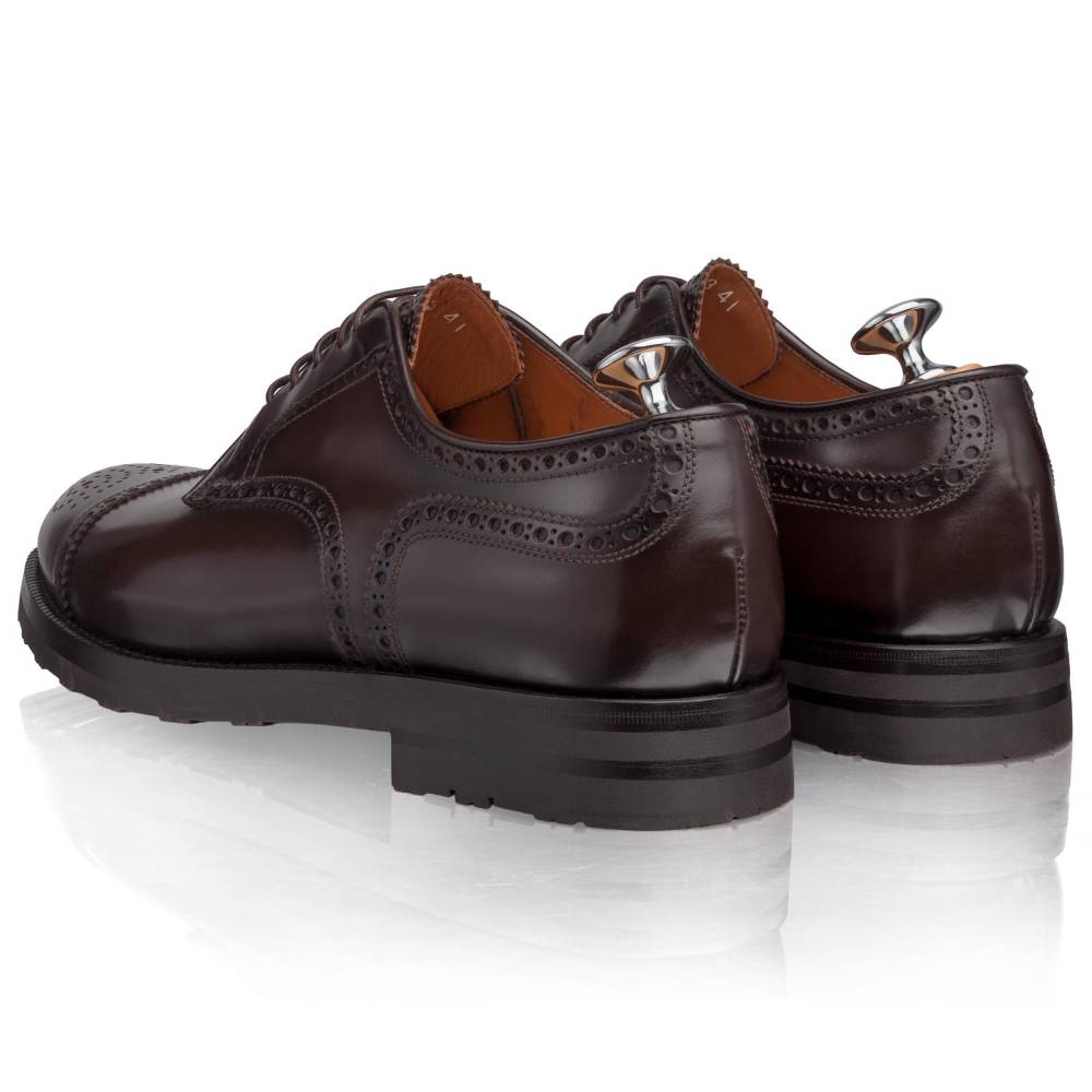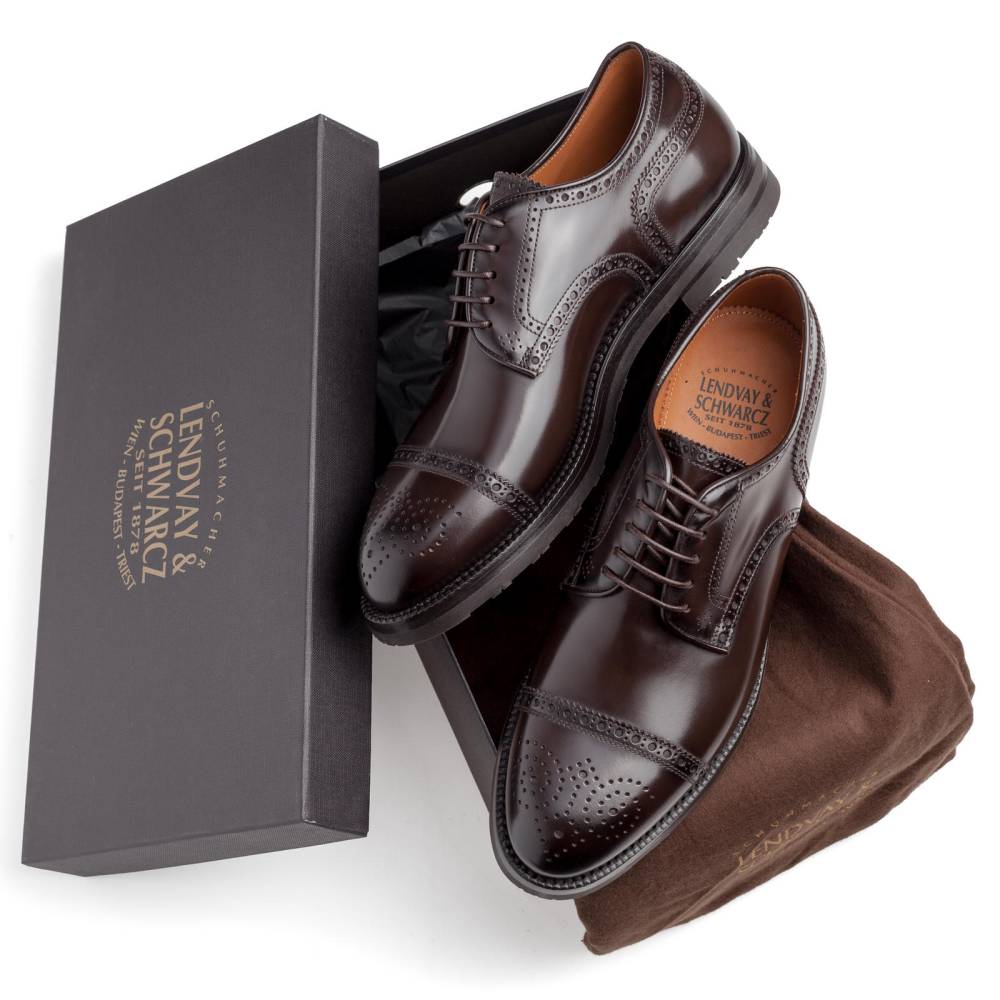 Мужские дерби полуброги Lendvay & Schwarcz тёмно-коричневого цвета на двойной подошве с противоскользящей резиной Berlino. Верх выполнен из высококачественной телячьей кожи итальянского производства, украшенной перфорацией. Кожа обладает изысканным блеском, благодаря которому выглядит подобно лошадиной коже (cordovan). Внутренняя отделка из натуральной кожи. Конструкция Blake Rapid с пробковым слоем.