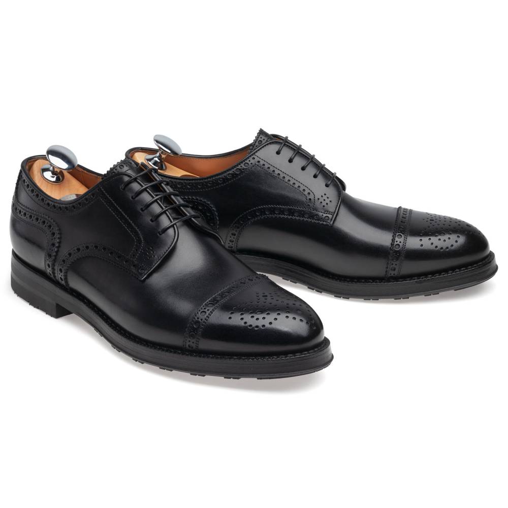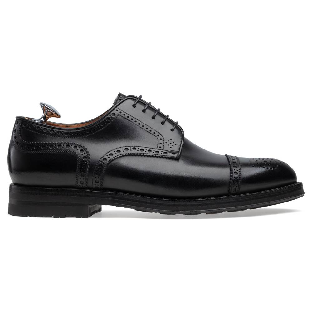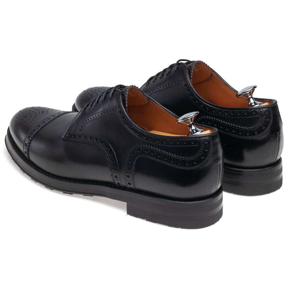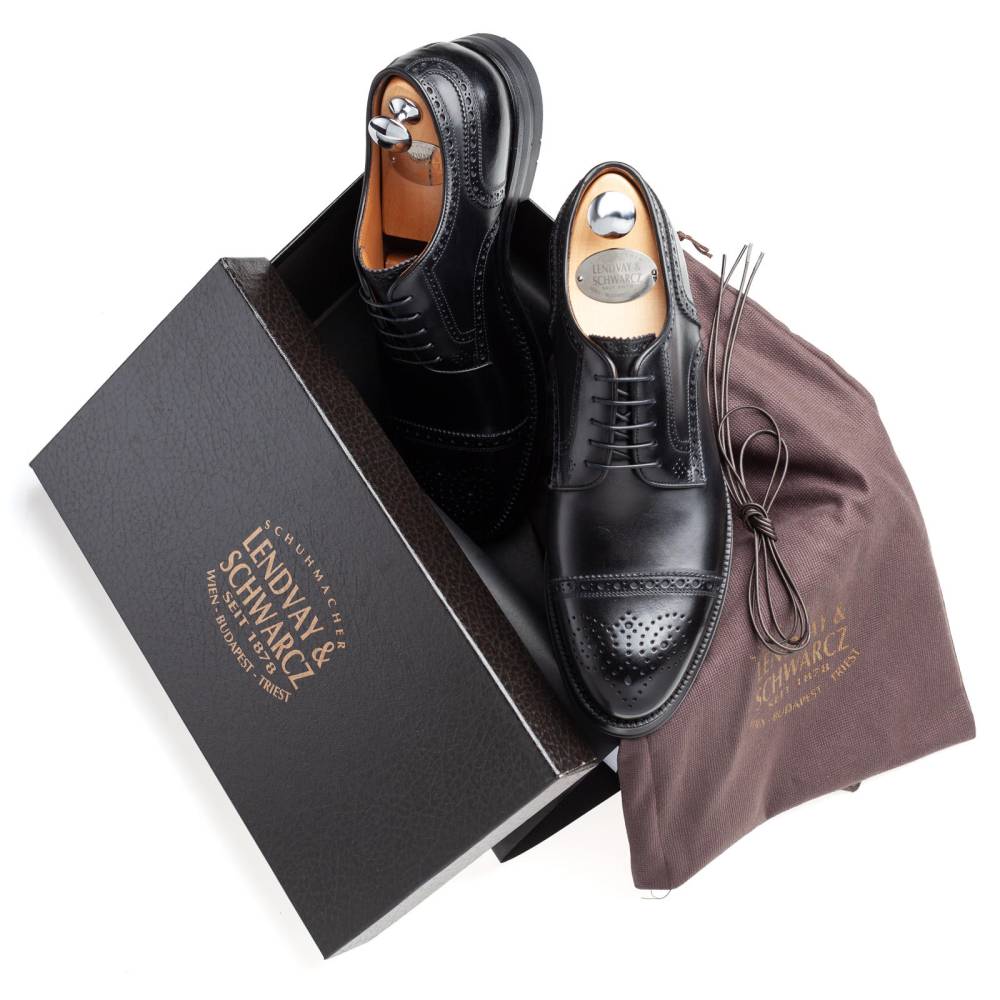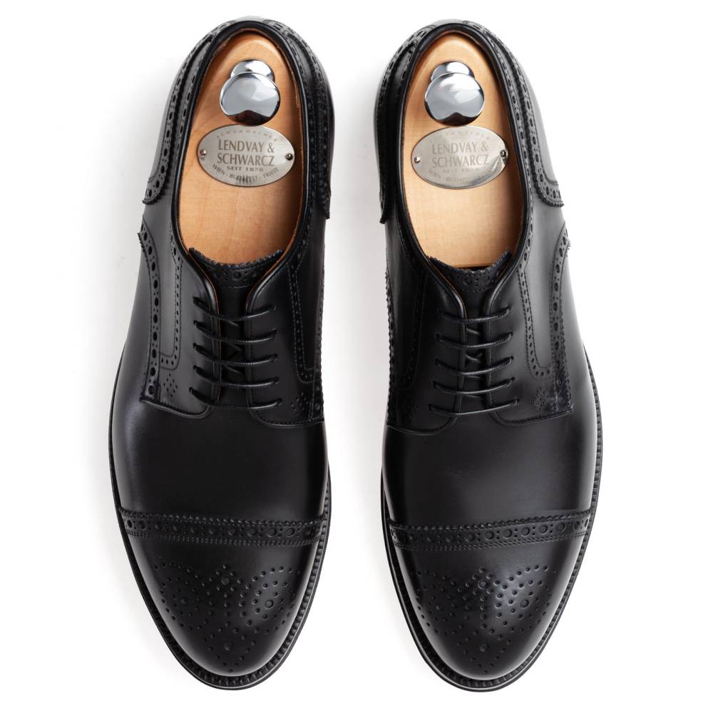 Мужские дерби полу-броги Lendvay & Schwarcz черного цвета на двойной подошве с противоскользящей резиной Berlino. Верх выполнен из высококачественной телячьей кожи итальянского производства, украшенной перфорацией. Внутренняя отделка полностью из натуральной кожи. Конструкция Blake Rapid с пробковым слоем.