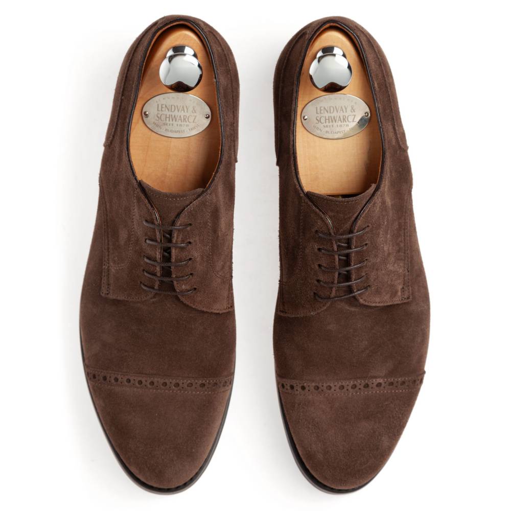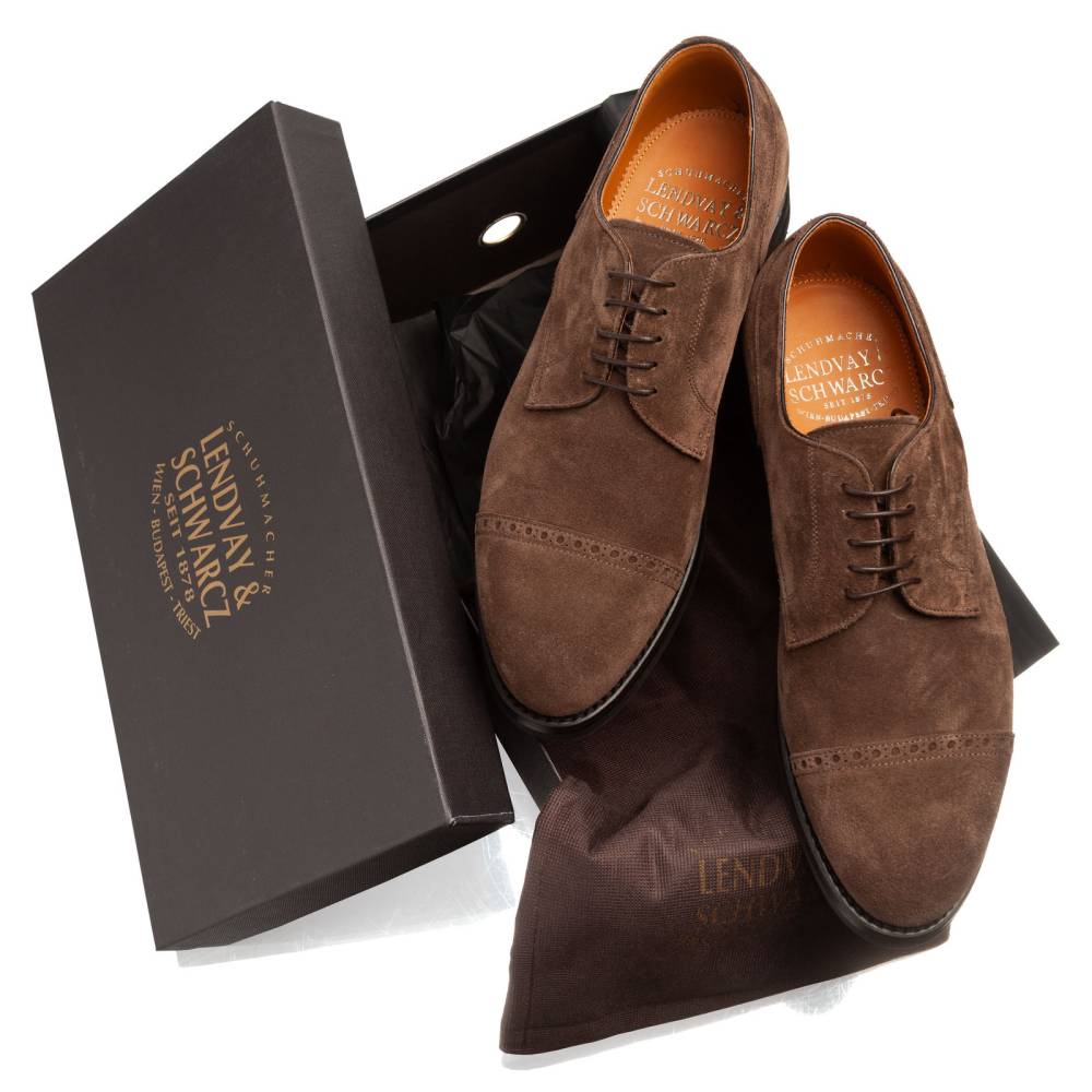 Повседневные мужские дерби Lendvay & Schwarcz коричневого цвета на двойной подошве с практичной резиной Milano без протектора. Верх выполнен из высококачественной приятной на ощупь замши с влагоотталкивающей обработкой. Модель украшена лаконичным брогированием на мыске. Внутренняя отделка полностью из натуральной кожи. Конструкция Blake Rapid.