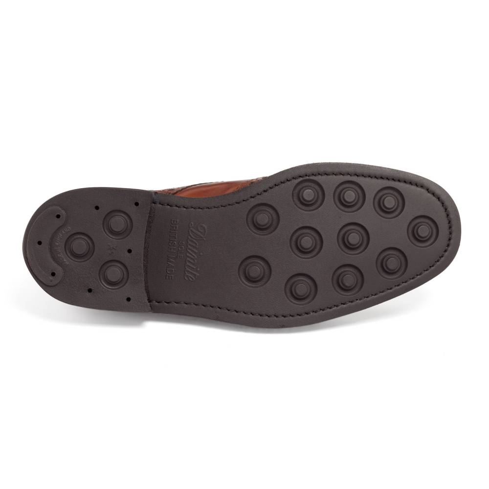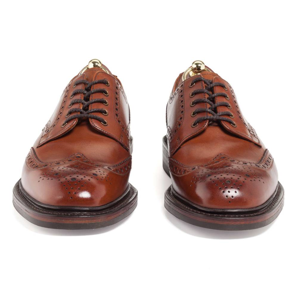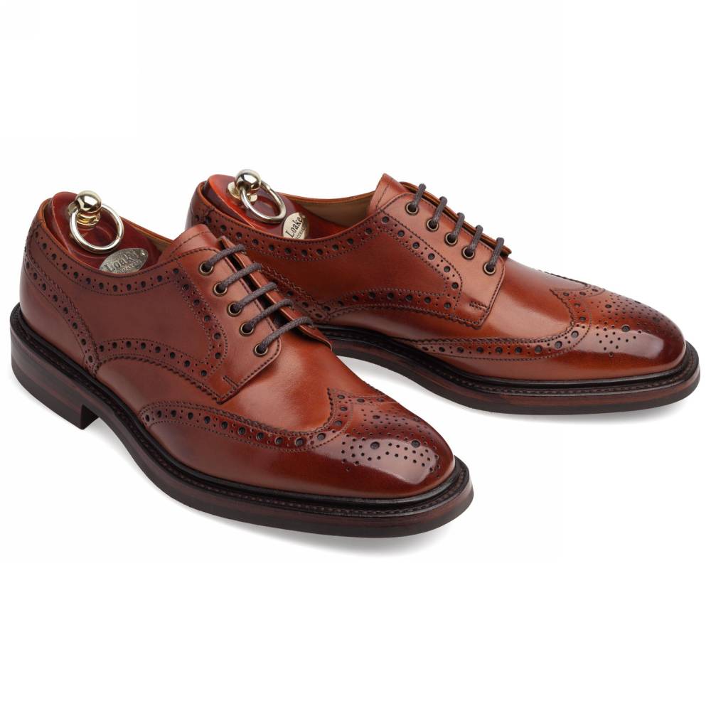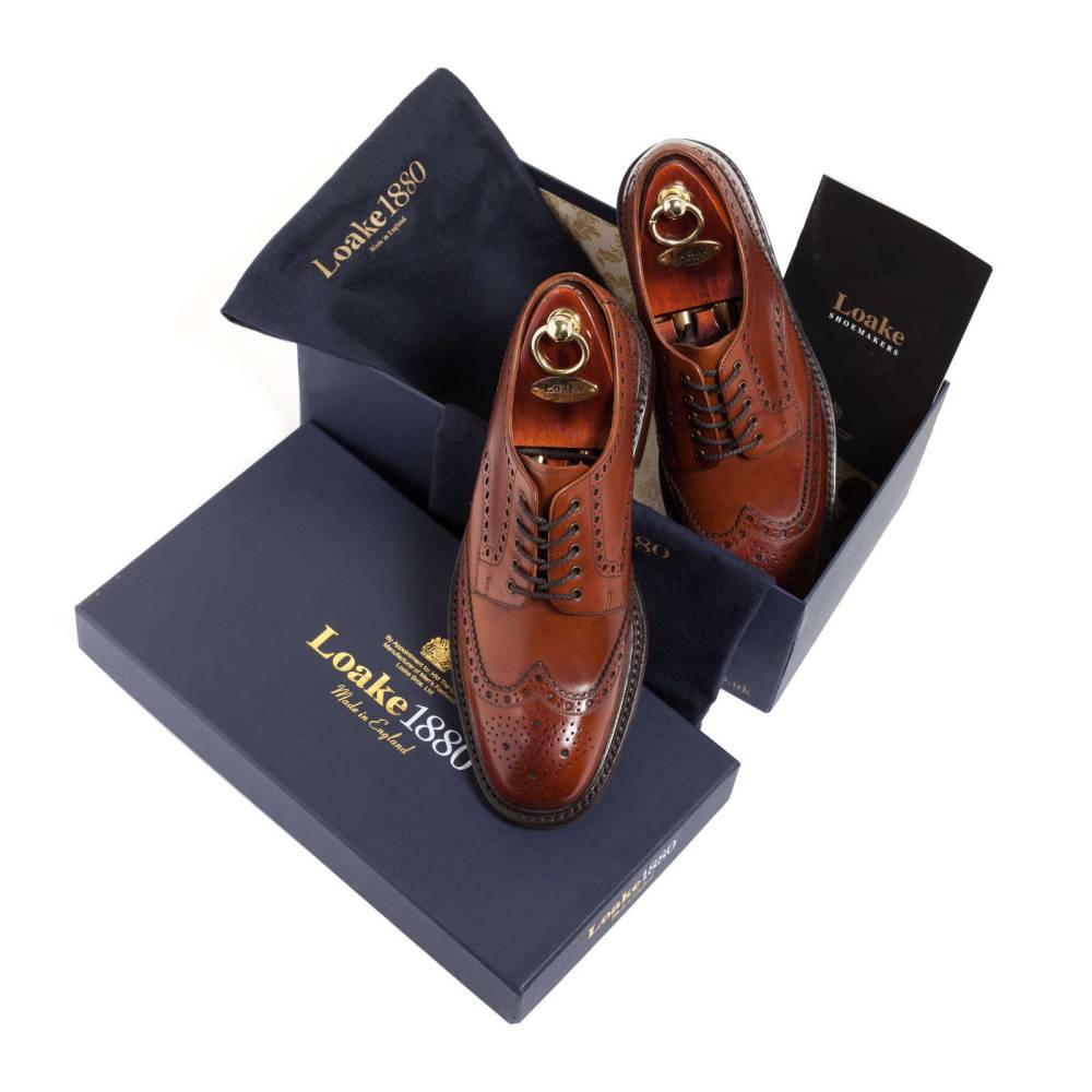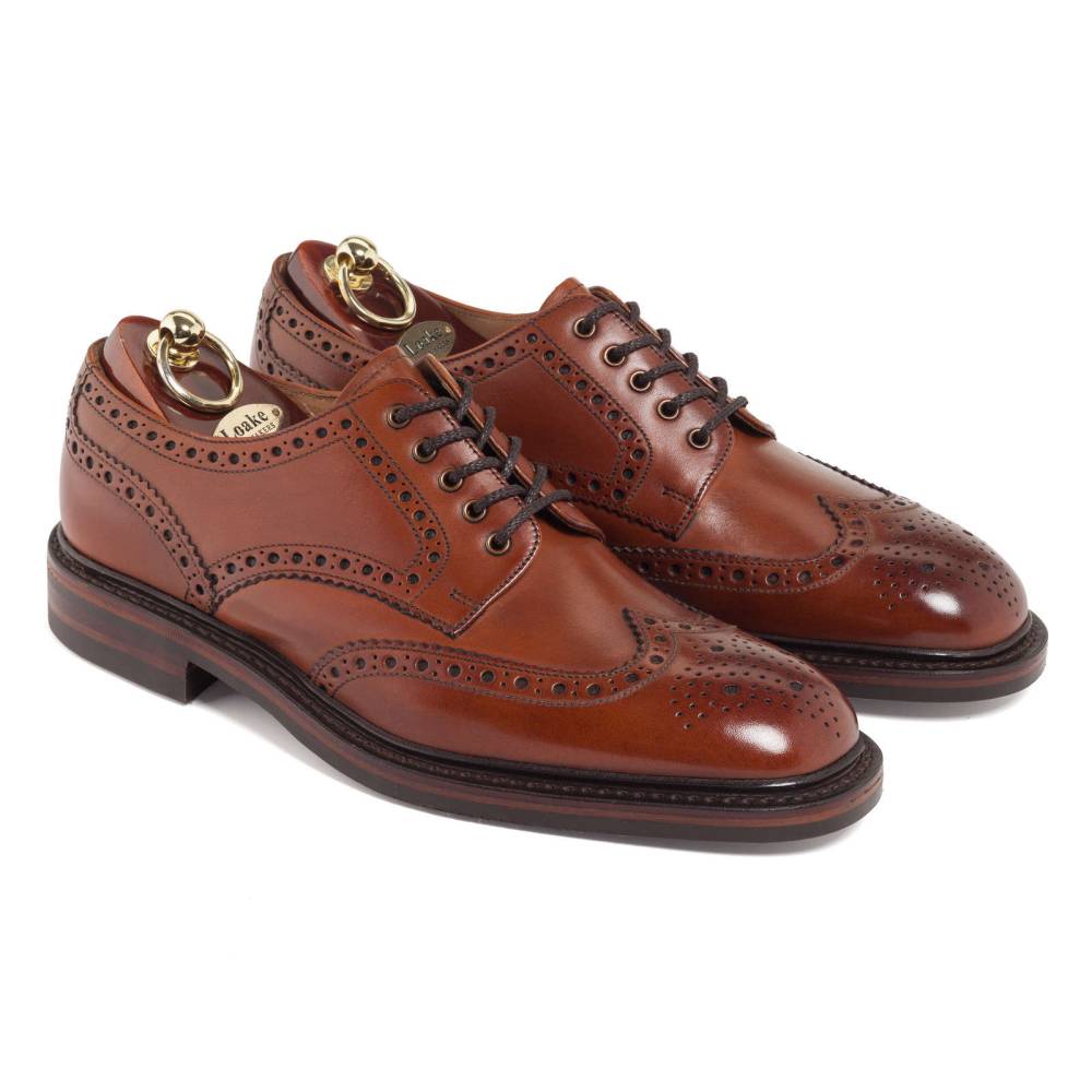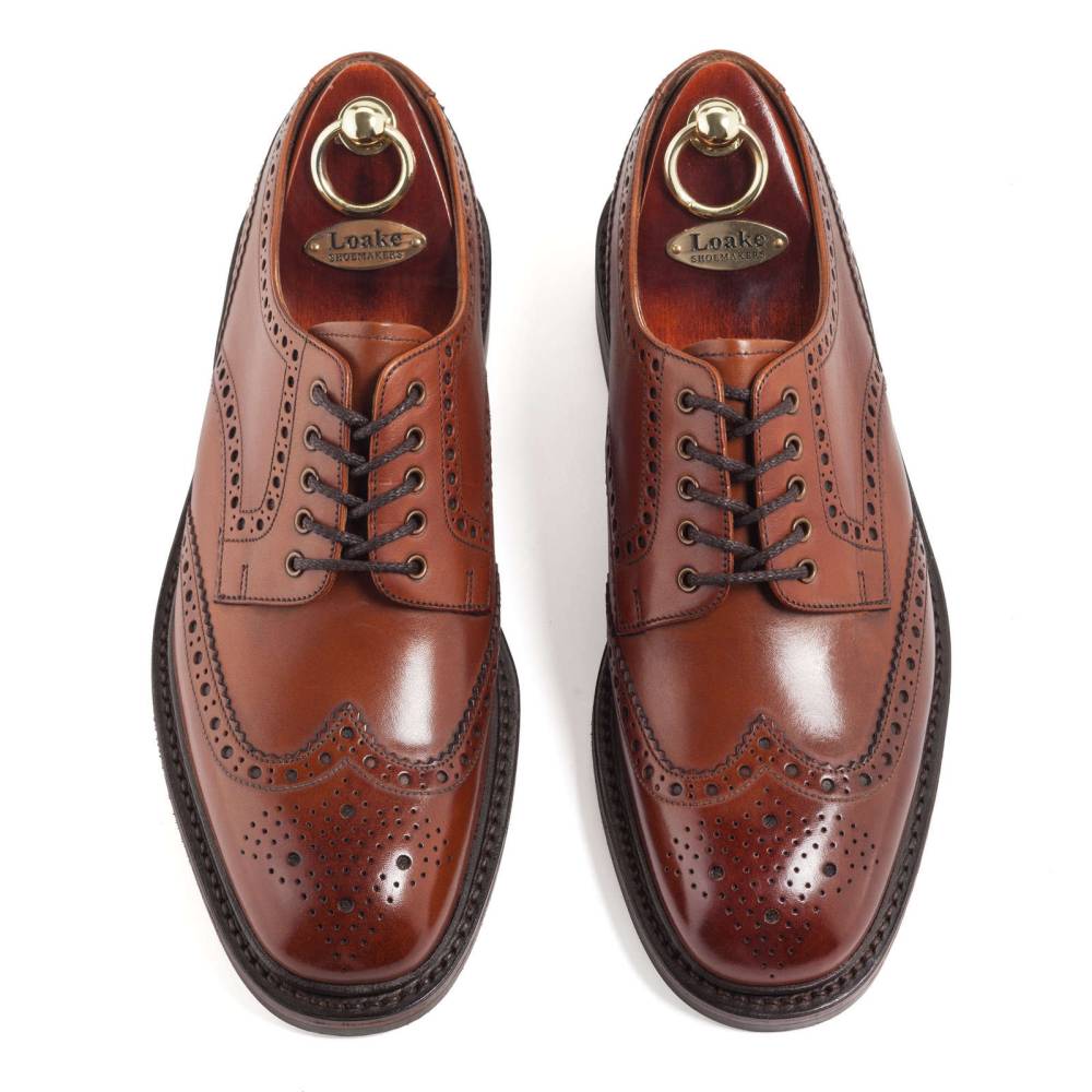 Традиционные английские броги с открытой шнуровкой Loake Chester из флагманской коллекции Loakе 1880. Модель выполнена из плотной телячьей кожи коричневого цвета, декорированной фестонами и характерным перфорированным узором. На нижнюю часть подошвы установлена прочная резина английской фирмы Dainite. Модель имеет штормовой рант, который усиливает устойчивость к воде. Конструкция Goodyear Welted.