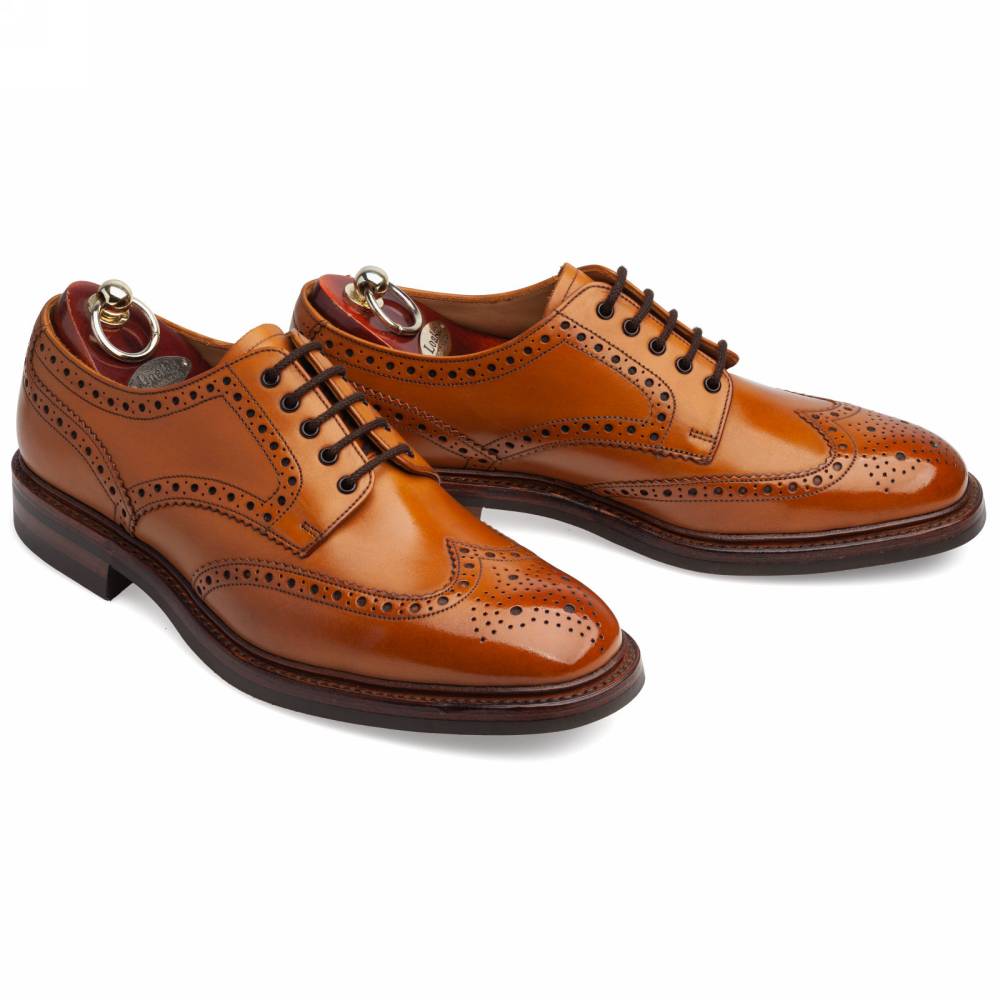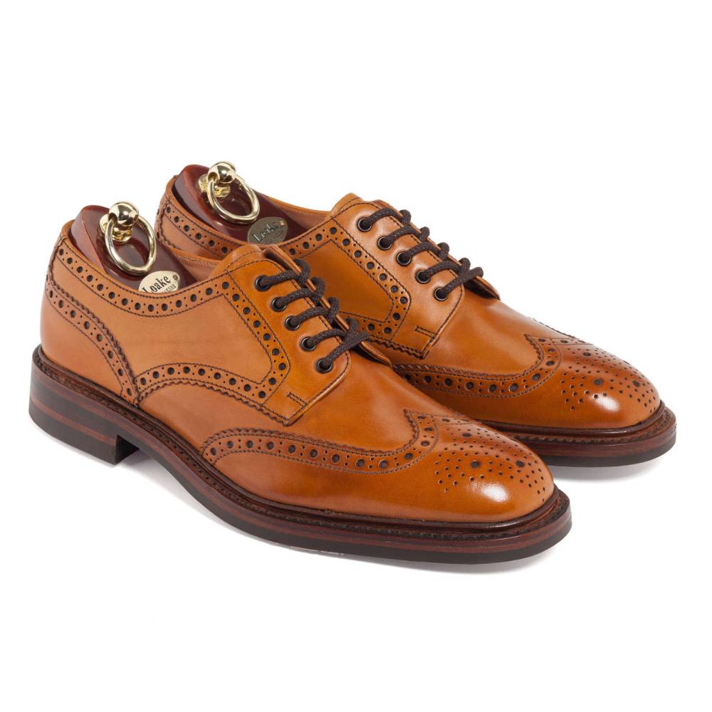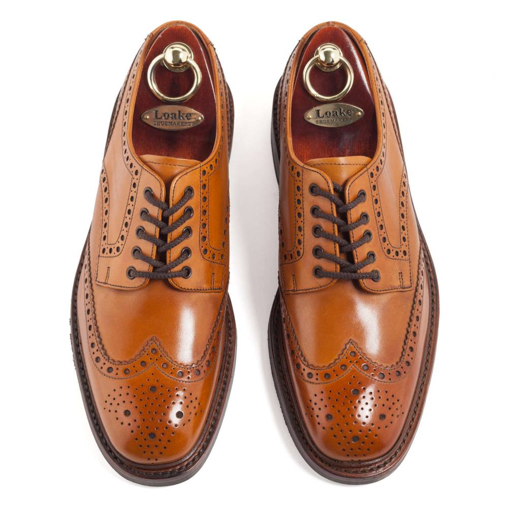 Традиционные английские броги с открытой шнуровкой Loake Chester из флагманской коллекции Loakе 1880. Модель выполнена из плотной телячьей кожи светло-коричневого цвета, декорированной фестонами и характерным перфорированным узором. На нижнюю часть подошвы установлена прочная резина английской фирмы Dainite. Модель имеет штормовой рант, который усиливает устойчивость к воде. Конструкция Goodyear Welted.