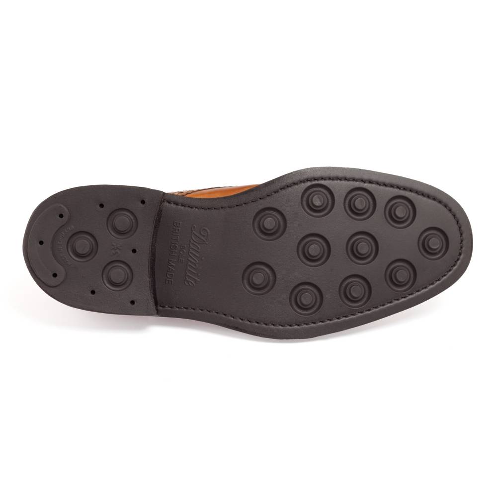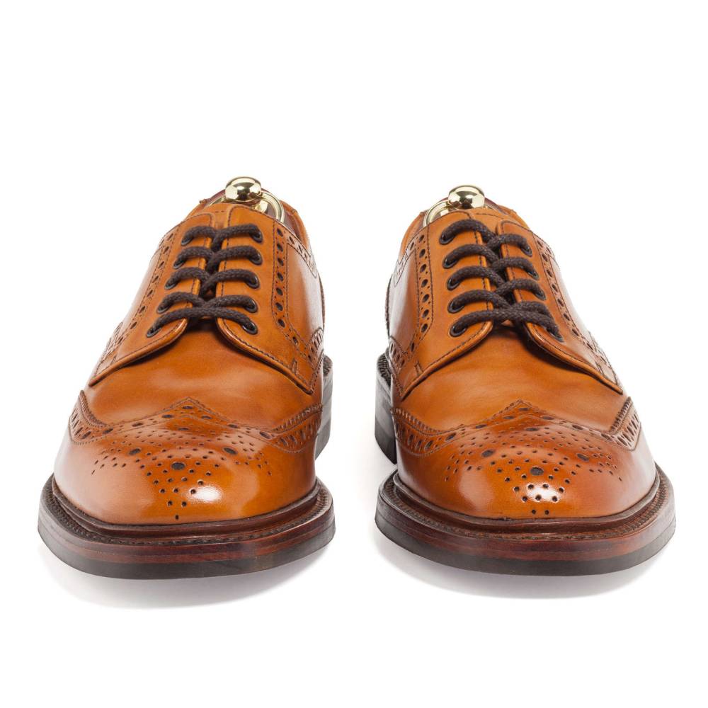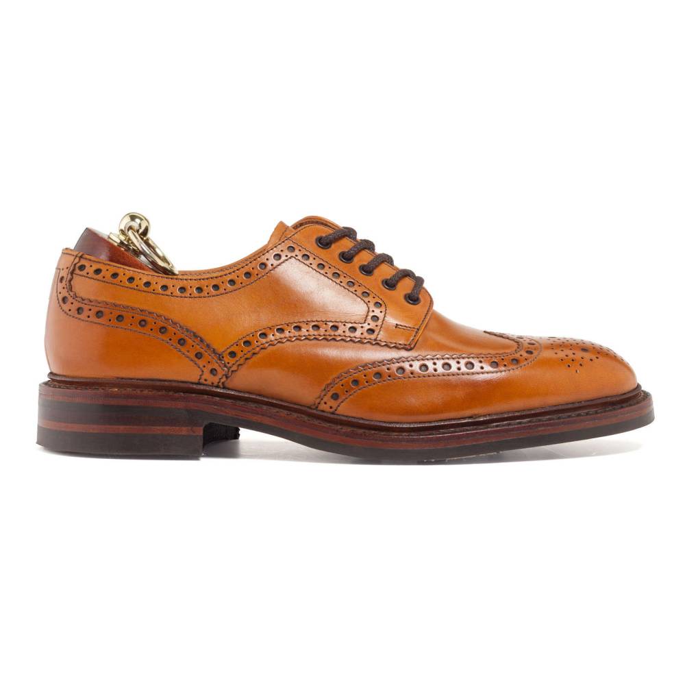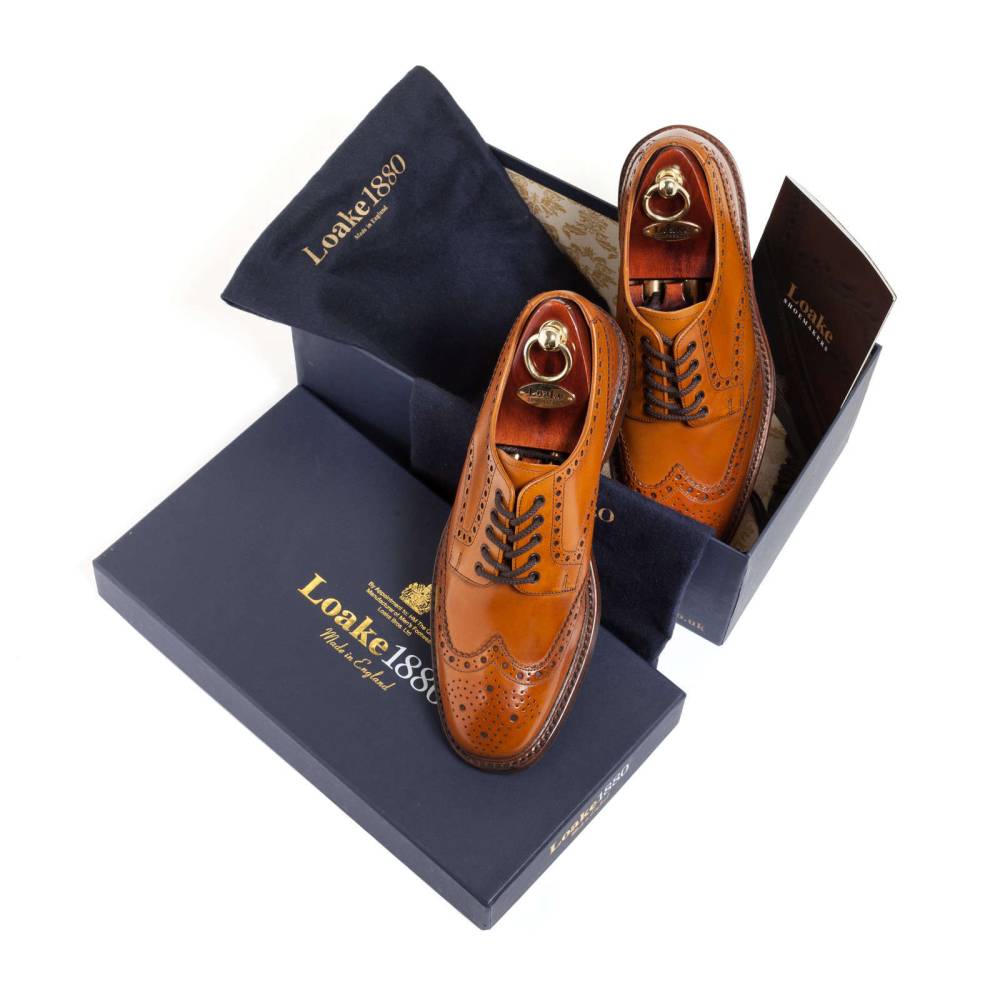 Традиционные английские броги с открытой шнуровкой Loake Chester из флагманской коллекции Loakе 1880. Модель выполнена из плотной телячьей кожи светло-коричневого цвета, декорированной фестонами и характерным перфорированным узором. На нижнюю часть подошвы установлена прочная резина английской фирмы Dainite. Модель имеет штормовой рант, который усиливает устойчивость к воде. Конструкция Goodyear Welted.
