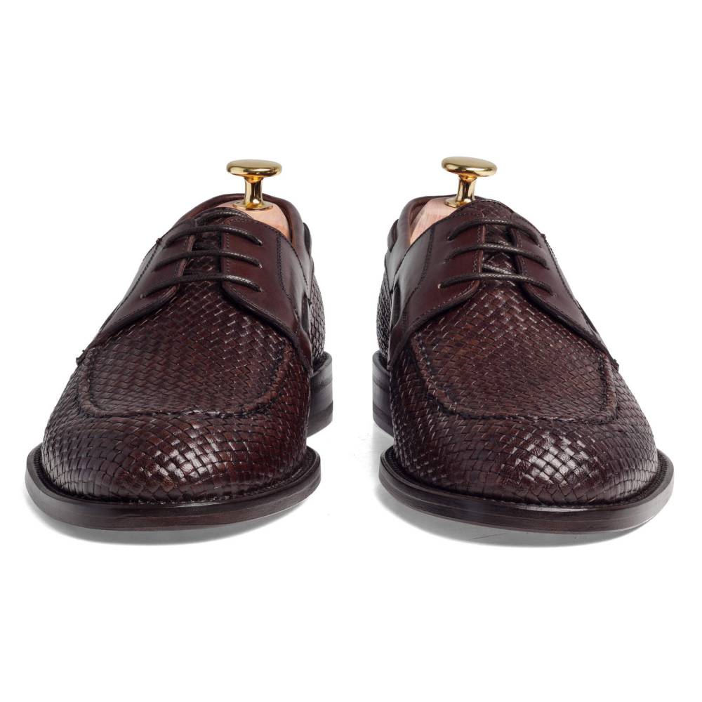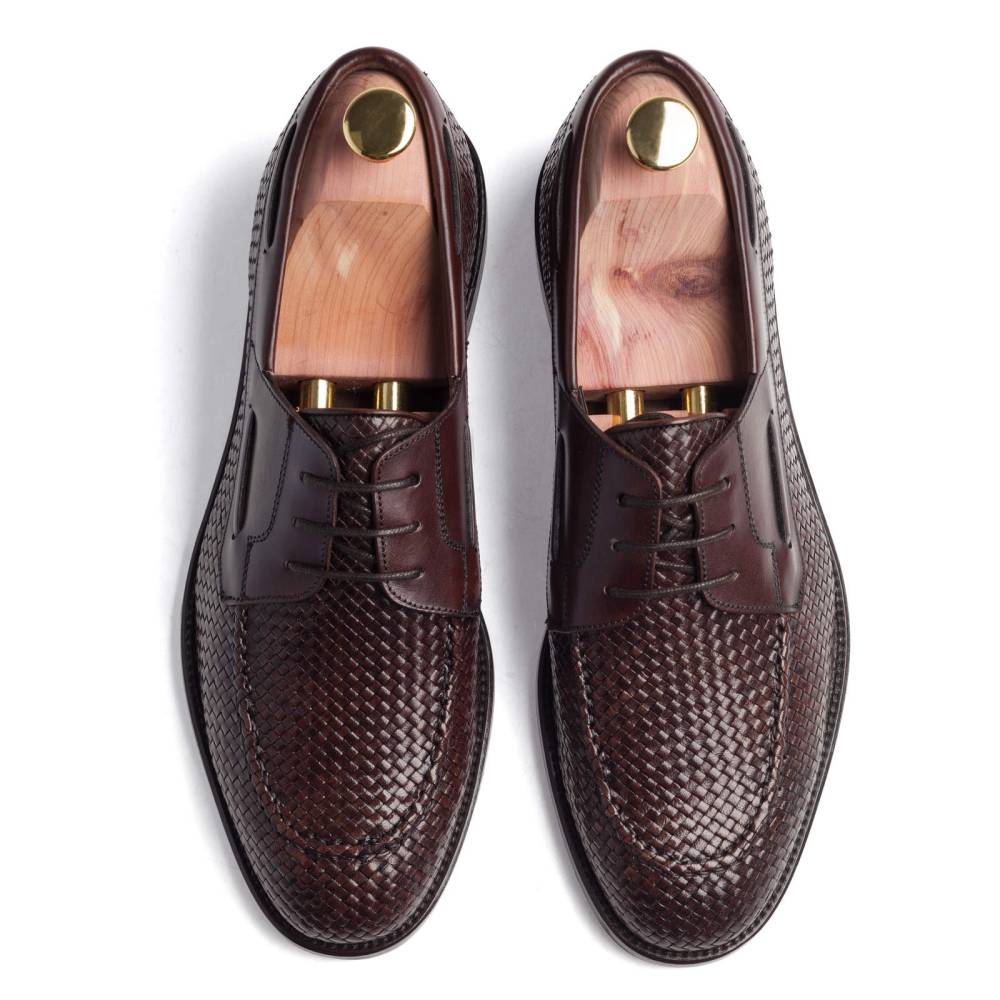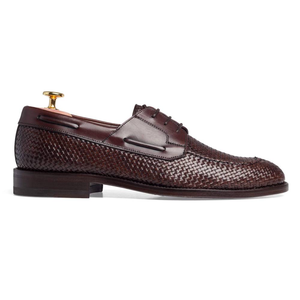 Лёгкие летние дерби от испанского бренда Paco Milan тёмно-коричневого цвета. Верх выполнен из плетения узких полосок кожи в шахматном порядке. Берцы выполнены из гладкой кожи. Туфли дополнены декоративным шнурком, пропущенным по бокам. В конструкции используется комбинированная подошва из кожи и резины. Модель прошита по технологии Blake.