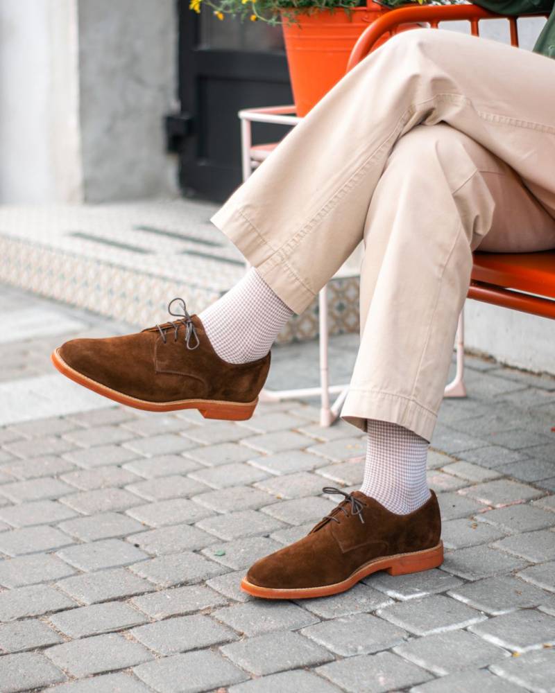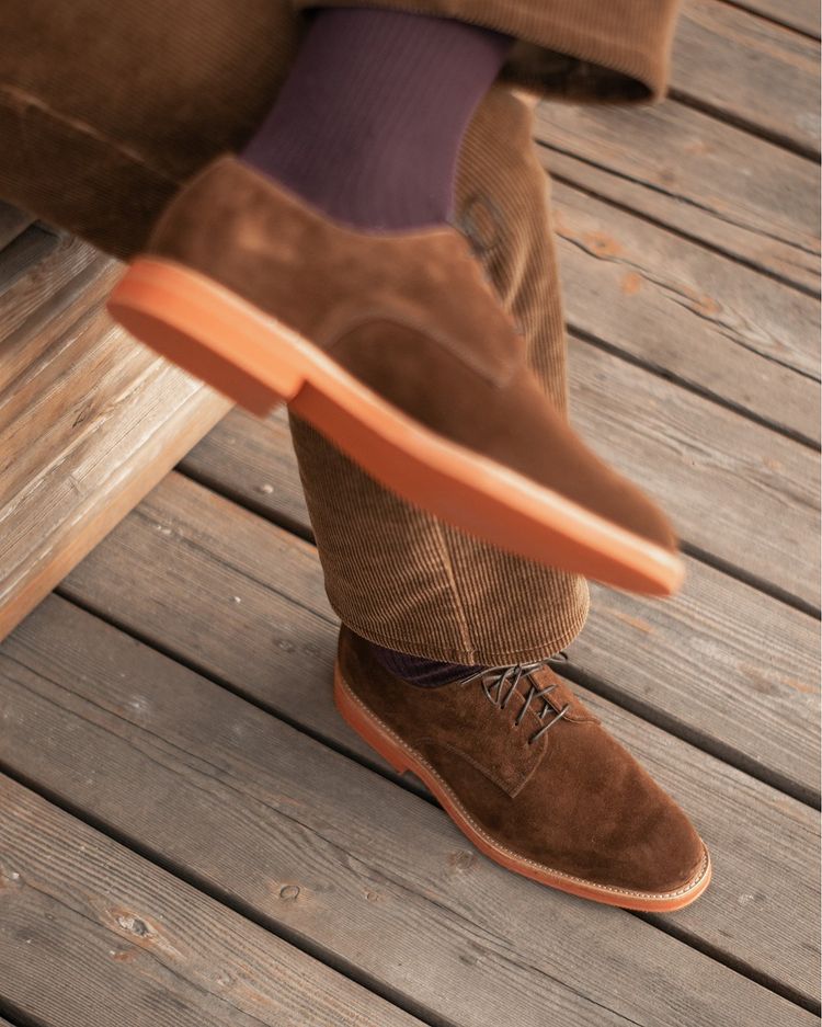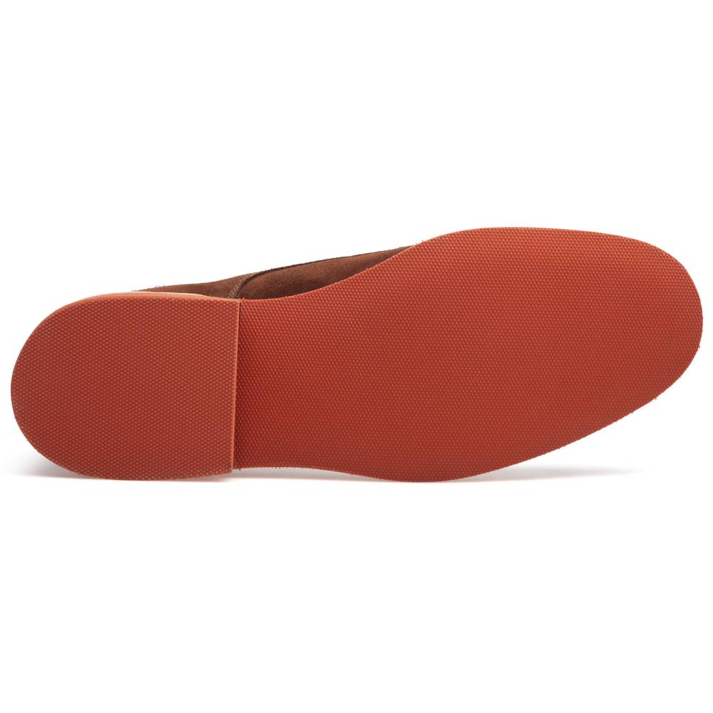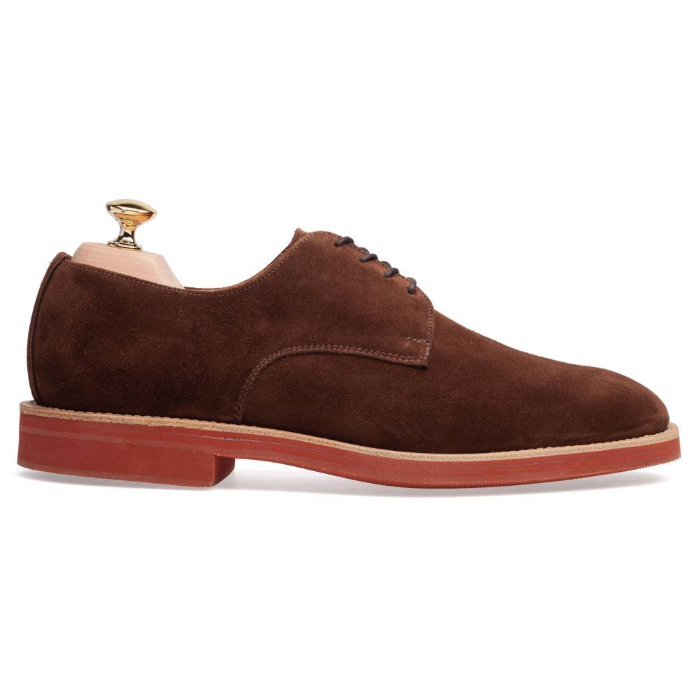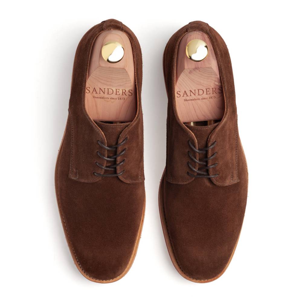 Стильные нестрогие дерби Jackson известной английской фабрики Sanders. Верх выполнен из мягкой приятной на ощупь коричневой замши, поставляемой английской дубильней Charles F. Stead & Co с дополнительной водоотталкивающей обработкой. Модель имеет прочную цельную резиновую подошву красного цвета. Внутренняя отделка полностью из натуральной кожи. Конструкция Goodyear Welted.
