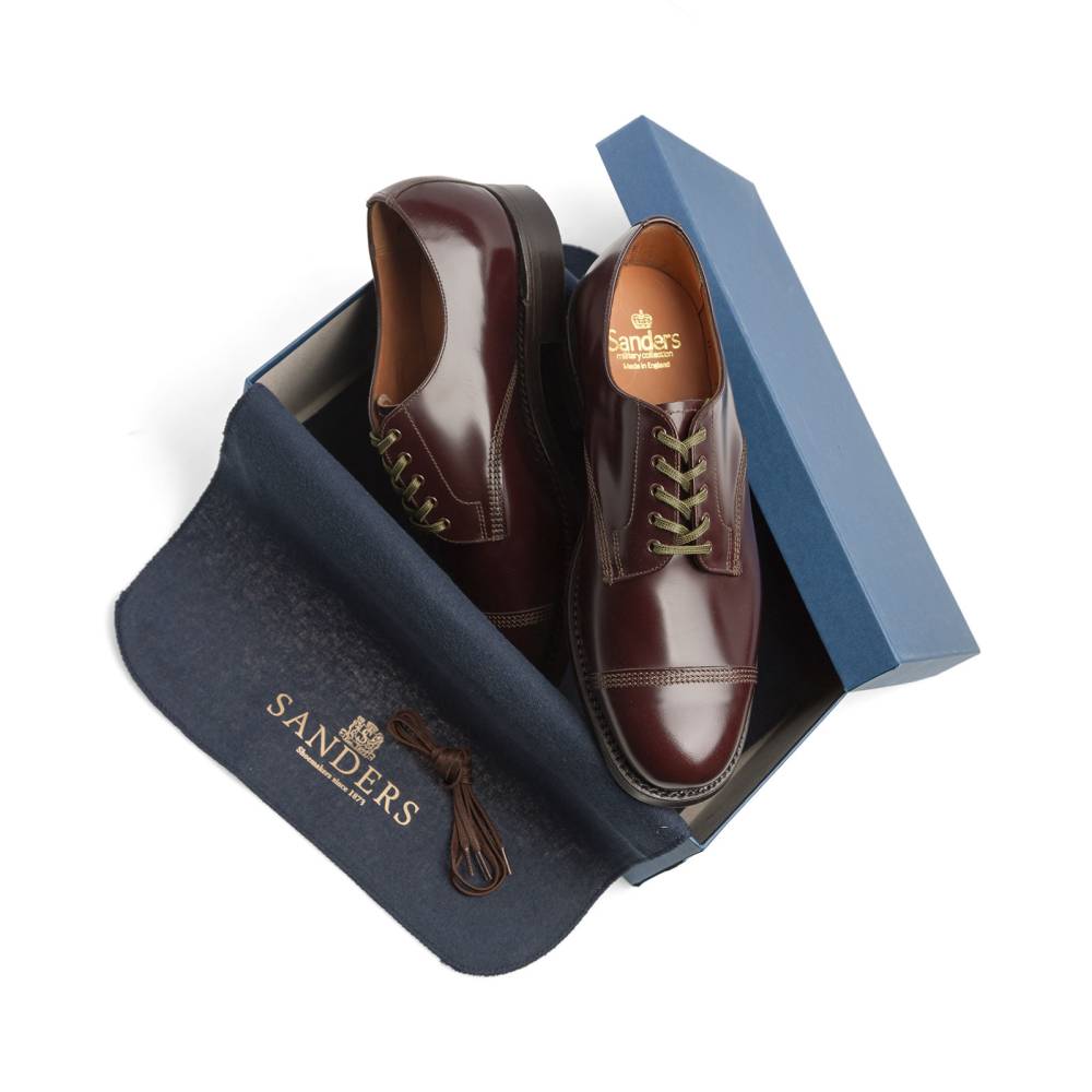 Офицерские туфли-дерби Sanders из коллекции Military на прочной резиновой подошве Itshide. Верх выполнен из гладкой и эластичной полированной телячьей кожи бордового цвета. Особенностью модели является крепкая тройная строчка на мысе и берцах. Данная пара изготовлена по специальному заказу (MTO) для магазина Checkroom. В отличие от базовых вариантов, тут установлены кожаный промежуточный слой между резиновой подошвой и рантом, а также наборный кожаный каблук. Эти опции делают подошву массивнее и практичнее. Внутренняя отделка из натуральной кожи. Конструкция Goodyear Welted.