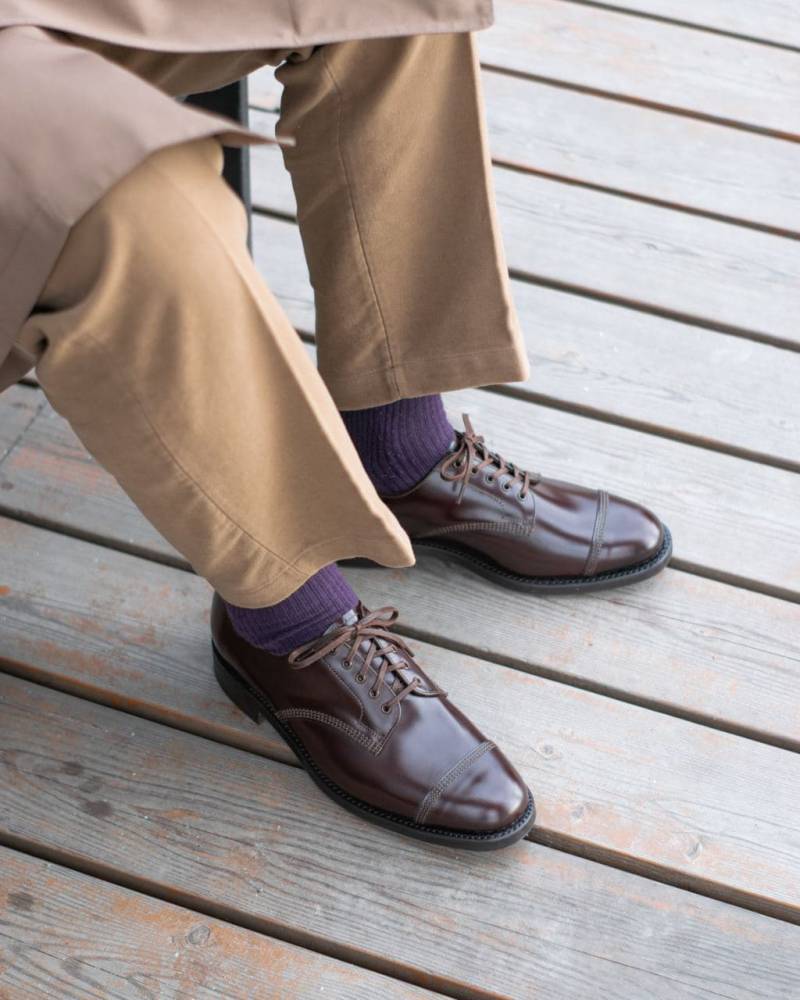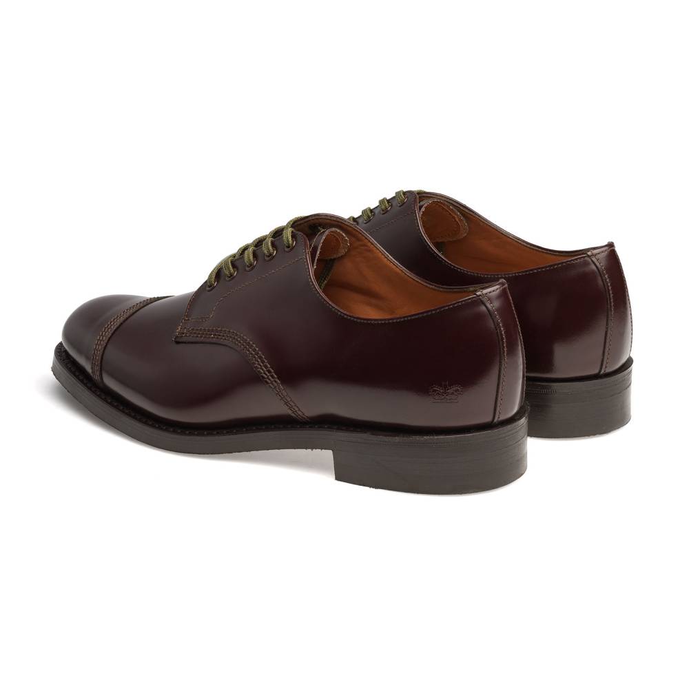 Модель сшита на колодке №266, которая очень близка по форме к архивным колодкам фабрики, на которых шилась обувь для солдат во время Второй мировой войны. Туфли подойдут для повседневного стиля одежды: плотного денима, брюк из фактурного хлопка, брюк-карго. К обуви прилагается дополнительная пара плоских вощёных шнурков коричневого цвета.