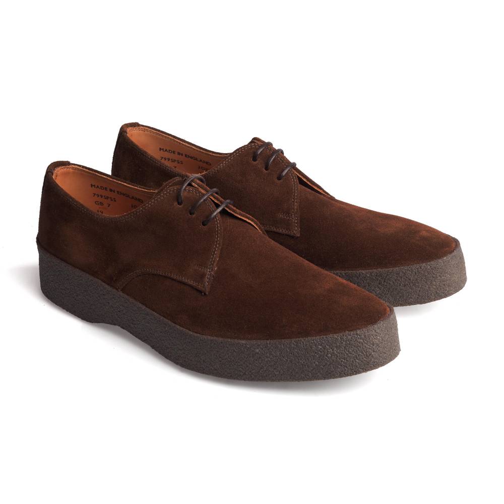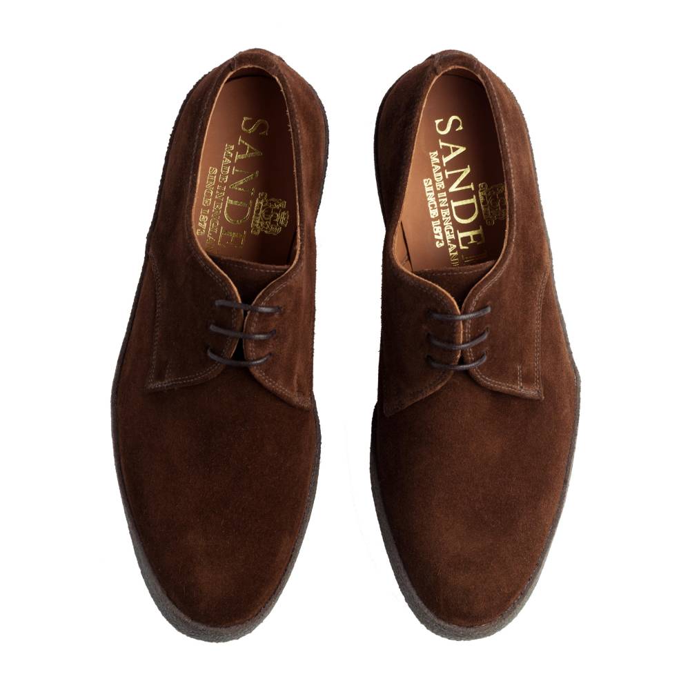 Lo Top - низкий вариант культовой модели 70-х годов «Playboy Chukka» в исполнении английского бренда Sanders. Отчасти модель стала знаменита благодаря голливудской звезде и гонщику Стиву МакКуину, который как в жизни, так и в кино щеголял в ней «не снимая». Очень мягкая и удобная обувь из коричневой замши с водоотталкивающей защитой, поставляемой английской дубильней Charles F. Stead & Co. Внутри подкладка из тонкой телячьей кожи и цельная кожаная стелька. Особый комфорт доставляет массивная креповая подошва с отличными амортизирующими свойствами. Несмотря на то, что обувь сшита не в конструкции Goodyear Welted, между подошвой и стелькой также проложен слой из пробки, который со временем промнётся и примет форму стопы.