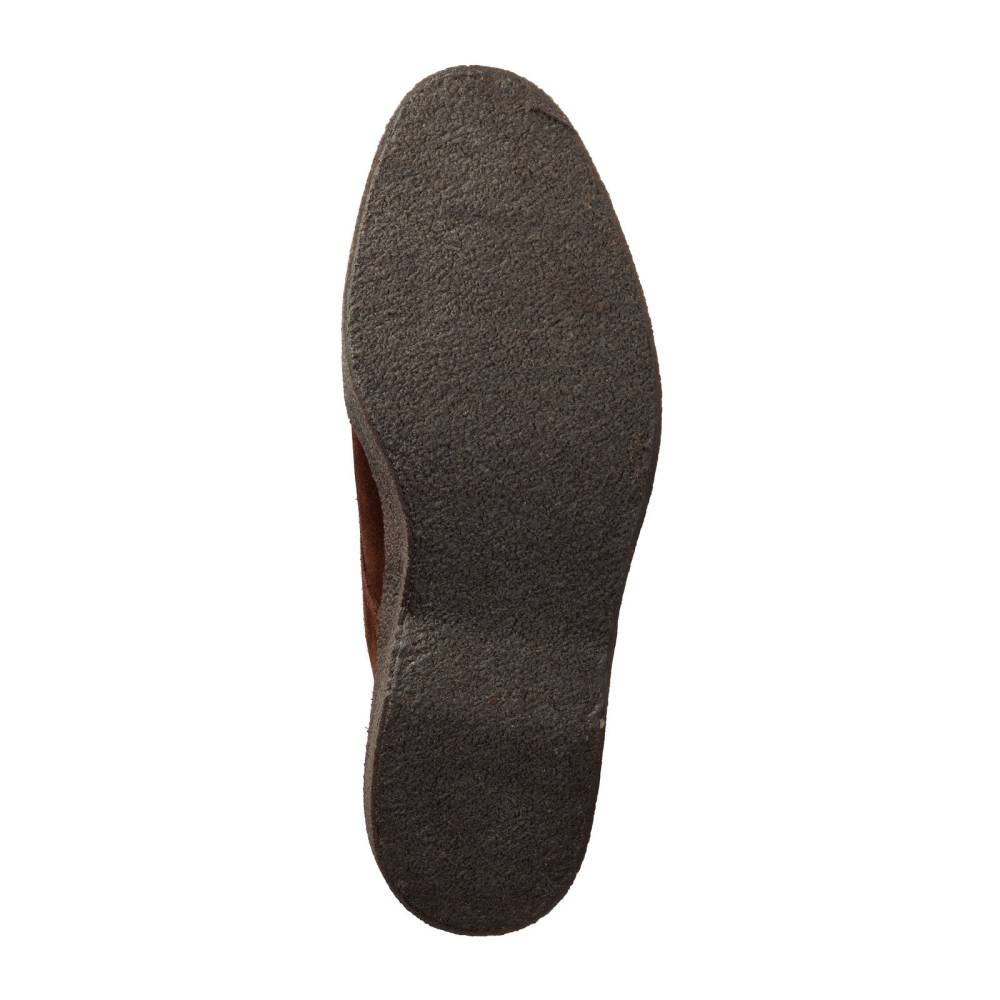 Модель выполнена в конструкции Cemented. Все части верха заворачиваются под стельку и приклеиваются к креповой подошве. Затем, на специальном станке, тонкая горячая креповая лента спаивается с замшей и подошвой по всей окружности ботинка.