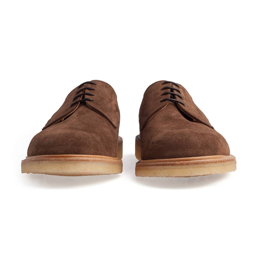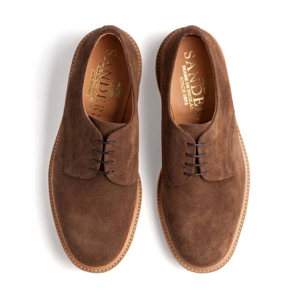Универсальные повседневные дерби Sanders Archie на мягкой и гибкой креповой подошве. С внешней стороны верх выполнен из приятной на ощупь коричневой замши, поставляемой английской дубильей Charles F. Stead & Co., а с внутренней – из тонкой телячьей кожи. Модель имеет штормовой рант, пришитый по всей окружности. Такой метод крепления сильнее защищает стык верха с подошвой от проникновения влаги. Конструкция Goodyear Welted.
