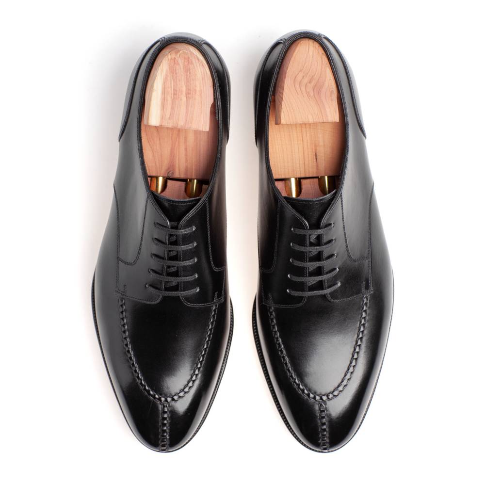 Элегантные чёрные дерби с норвежским мысом из коллекции TLB Artista. Шов на союзке и мыске выполнен вручную. Верх изготовлен из гладкой телячьей кожи знаменитой французской дубильни Annonay, а подкладка и стелька — из тонкой телячьей кожи растительного дубления. Подошва — кожаная, с закрытым швом, что делает пару более утончённой и целостной. Конструкция Goodyear Welted.